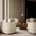 A-S02 系列以原木打造的框緣支撐著沙發,帶來猶如坐在圓潤石頭上的舒適體驗。柔和的曲線和豐盈的質感為空間帶來沉穩恬靜的氛圍。單人沙發提供包覆感和放鬆的坐感,而三人沙發的大座面還可作為沙發床使用。