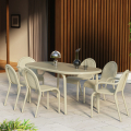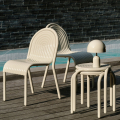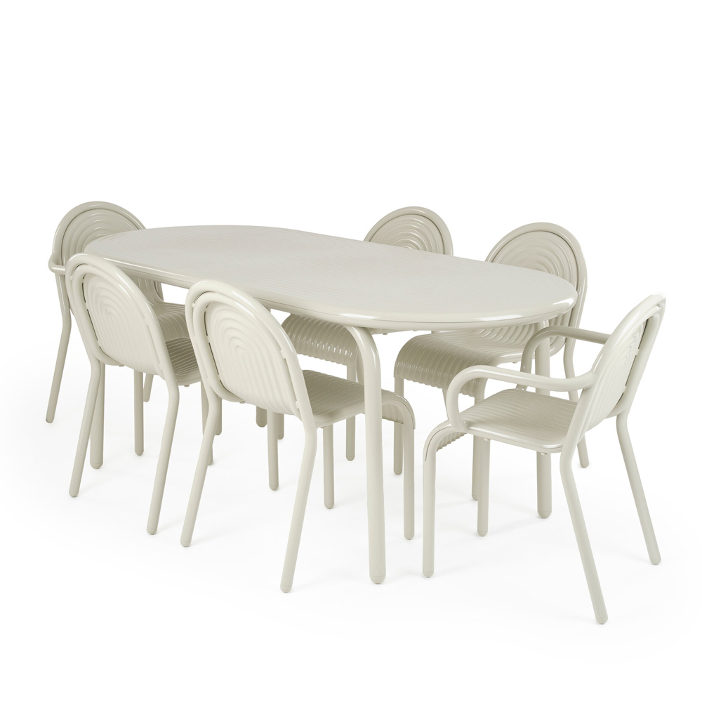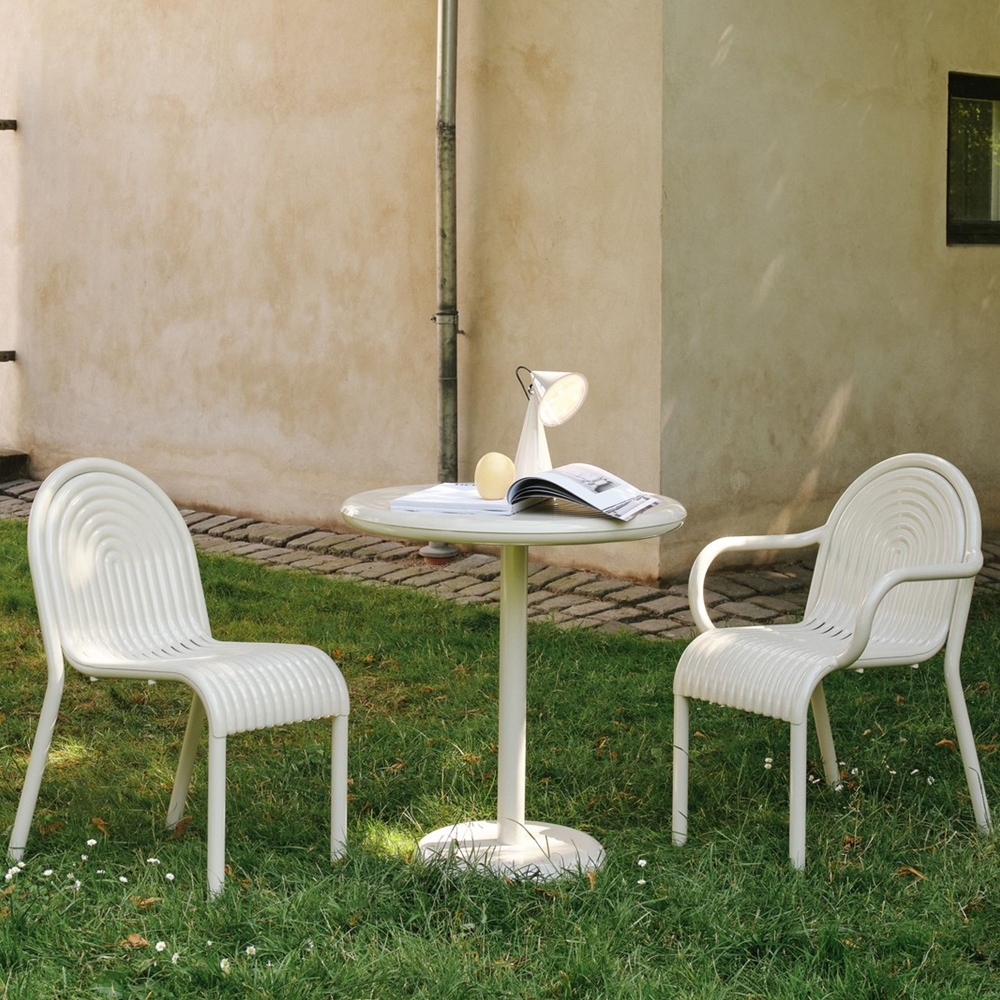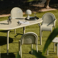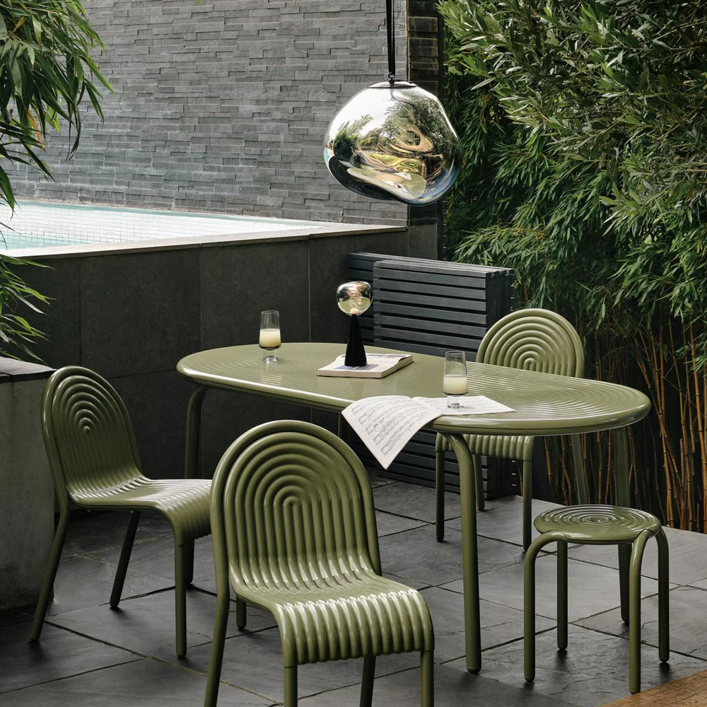 GROOVE 以高品質鋁材打造,表面覆蓋帶有立體凹槽的裝飾線條,既彰顯出裝飾藝術的節奏感,也讓金屬在光影下呈現細膩的反射效果。桌子、椅子與吧凳的設計不僅富有視覺層次,也帶來獨特的觸感體驗。為確保能夠長久適應戶外環境,整個系列採用先進工藝製造,搭配高性能的聚酯粉體塗層,完全不含溶劑與 VOC,兼具環保性與耐候性。