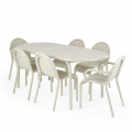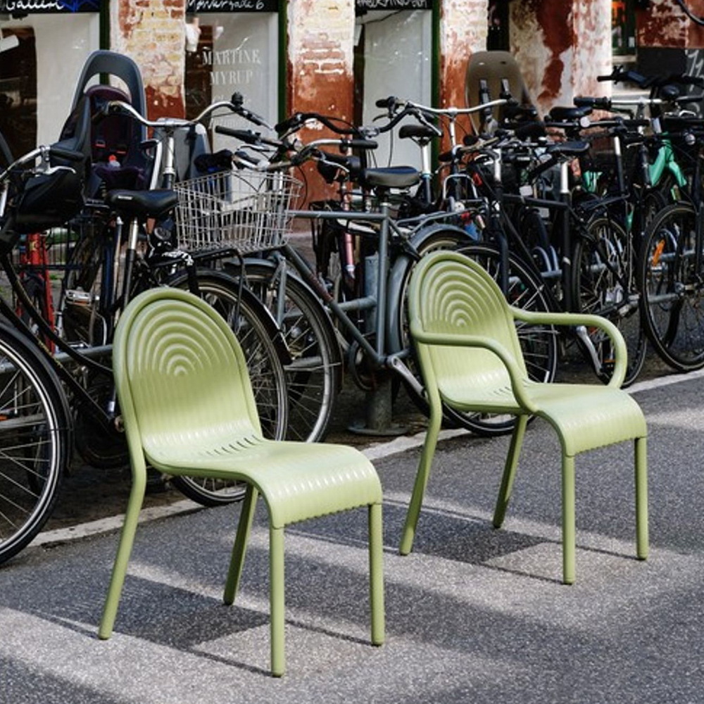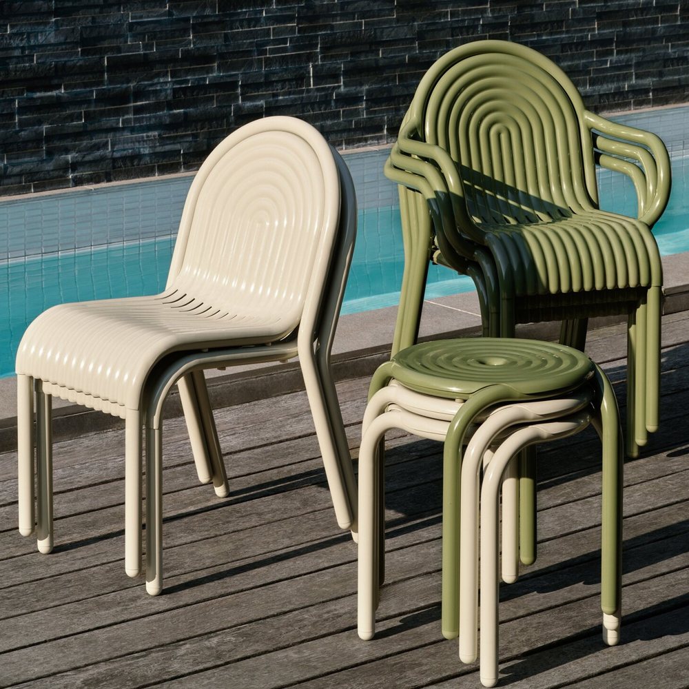 系列同時配備專屬的戶外坐墊,提供舒適度與實用性;椅子設計可堆疊收納,滿足不同戶外空間的靈活需求。產品提供 Moss(青苔綠)與 Putty(暖灰色)兩種色調,能夠自然融入庭園、露台或陽台等多樣環境,展現內斂卻獨具魅力的氛圍。