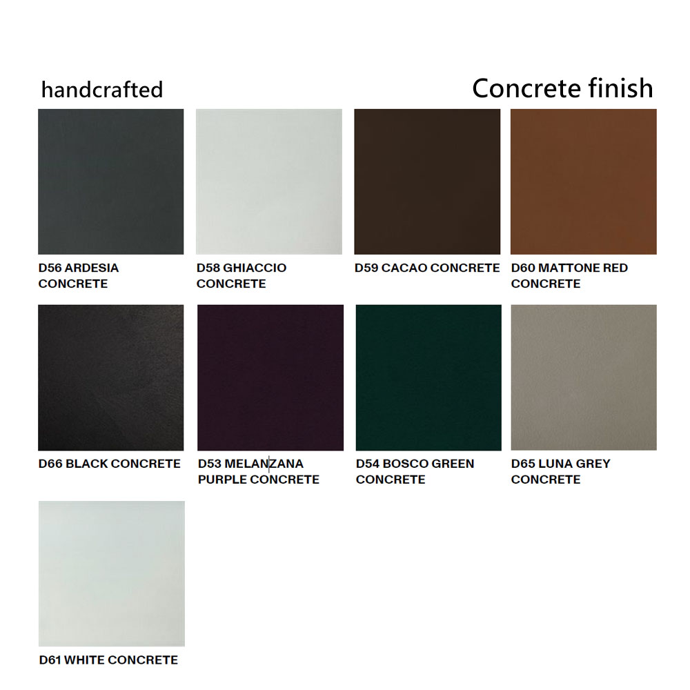 ** Desalto 的「Concrete(混凝土)」飾面,透過工匠以手工方式,將細碎研磨的礦物質材料與壓克力樹脂混合後,使用抹刀均勻塗佈於整體產品表面,最後再施加透明保護層,以確保耐用與質感並存。任何細微的不規則或表面差異,皆是手工製作的自然印記,也是產品真實而獨特的特色,展現了 Desalto 對工藝與材料細節的極致追求。