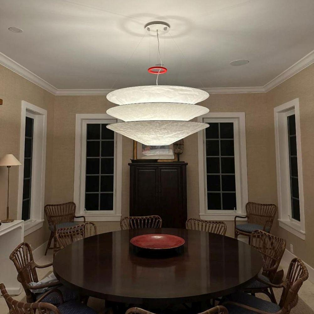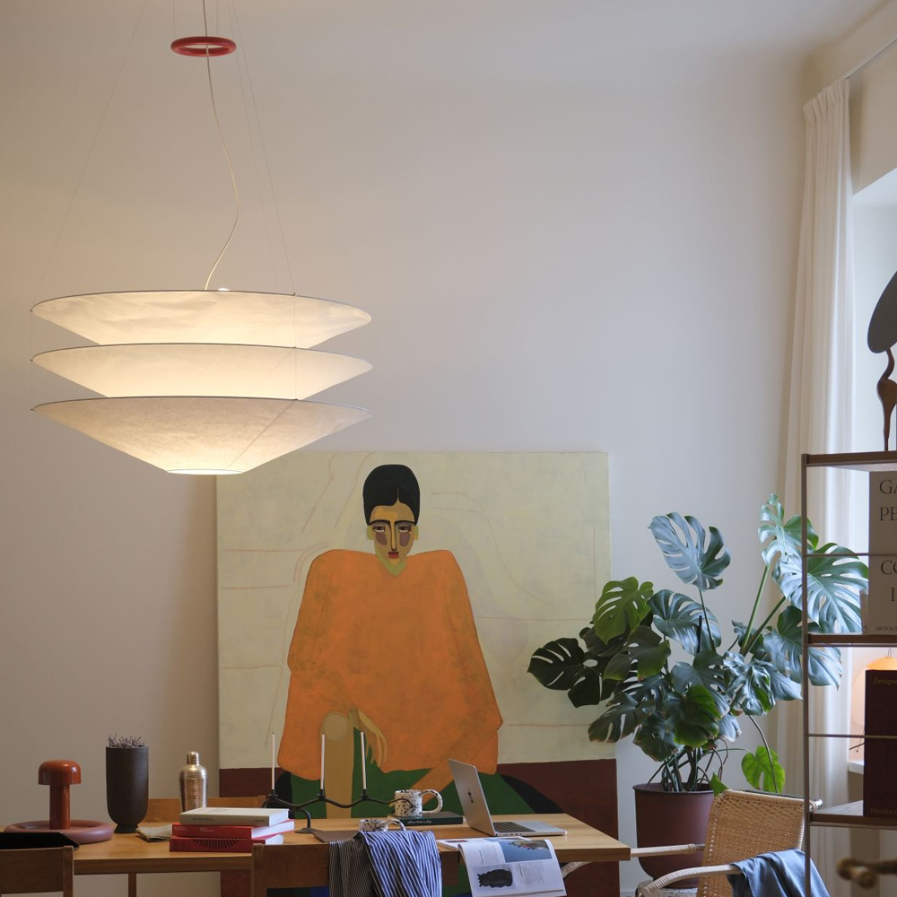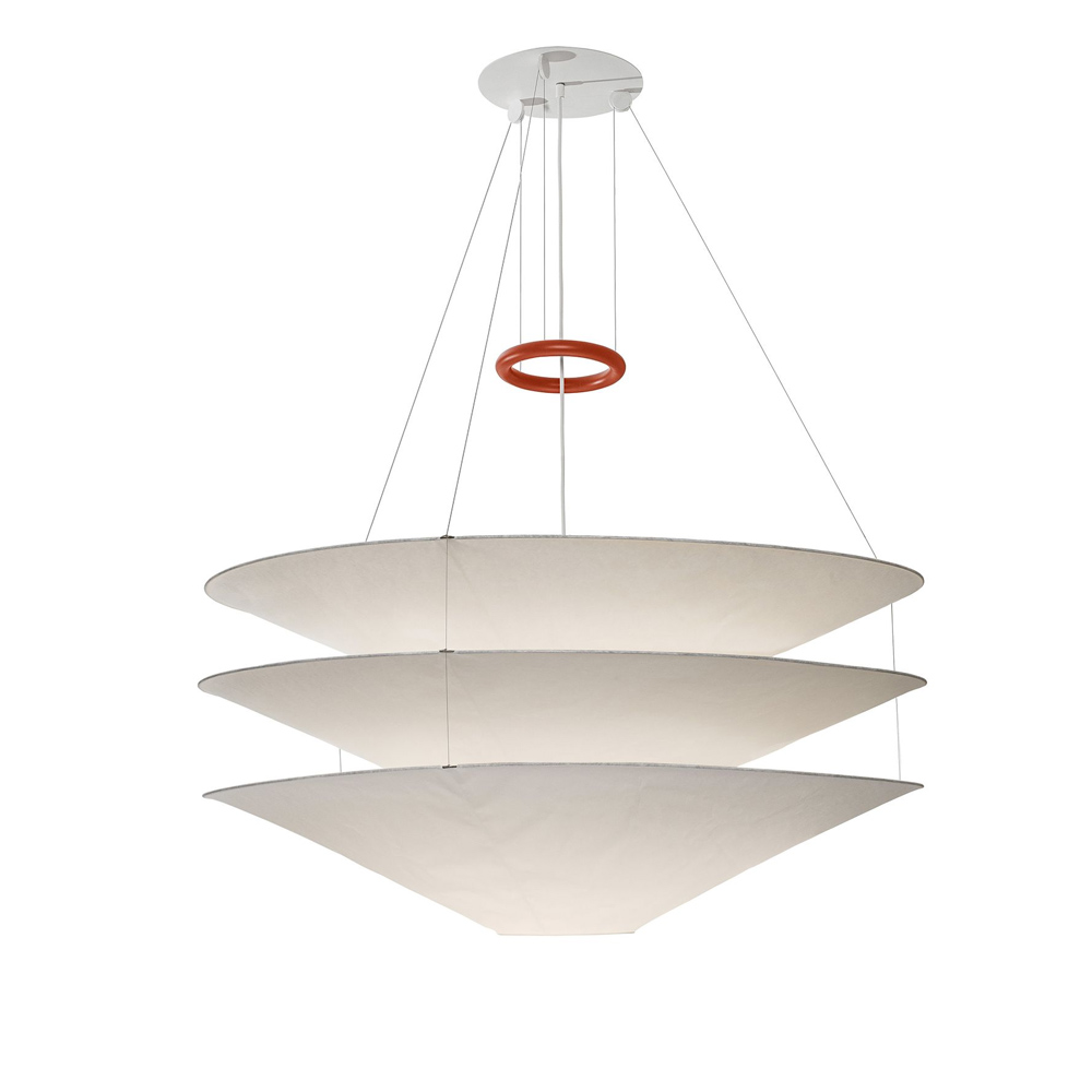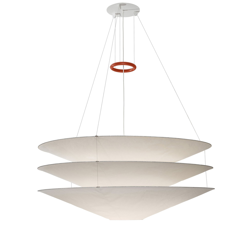 燈罩以傳統日本和紙(Japanese paper)手工製成,摺塑成三層碗狀結構,層層疊疊懸浮於細緻的金屬線纜之上,宛如雲霧般輕柔。圍繞燈體的紅色鐵環不僅是畫龍點睛的色彩重心,同時也是巧妙的配重與升降機構,使燈具高度可依需求自由調整,而整體結構仍保持穩定與優雅的懸吊姿態。