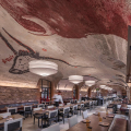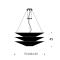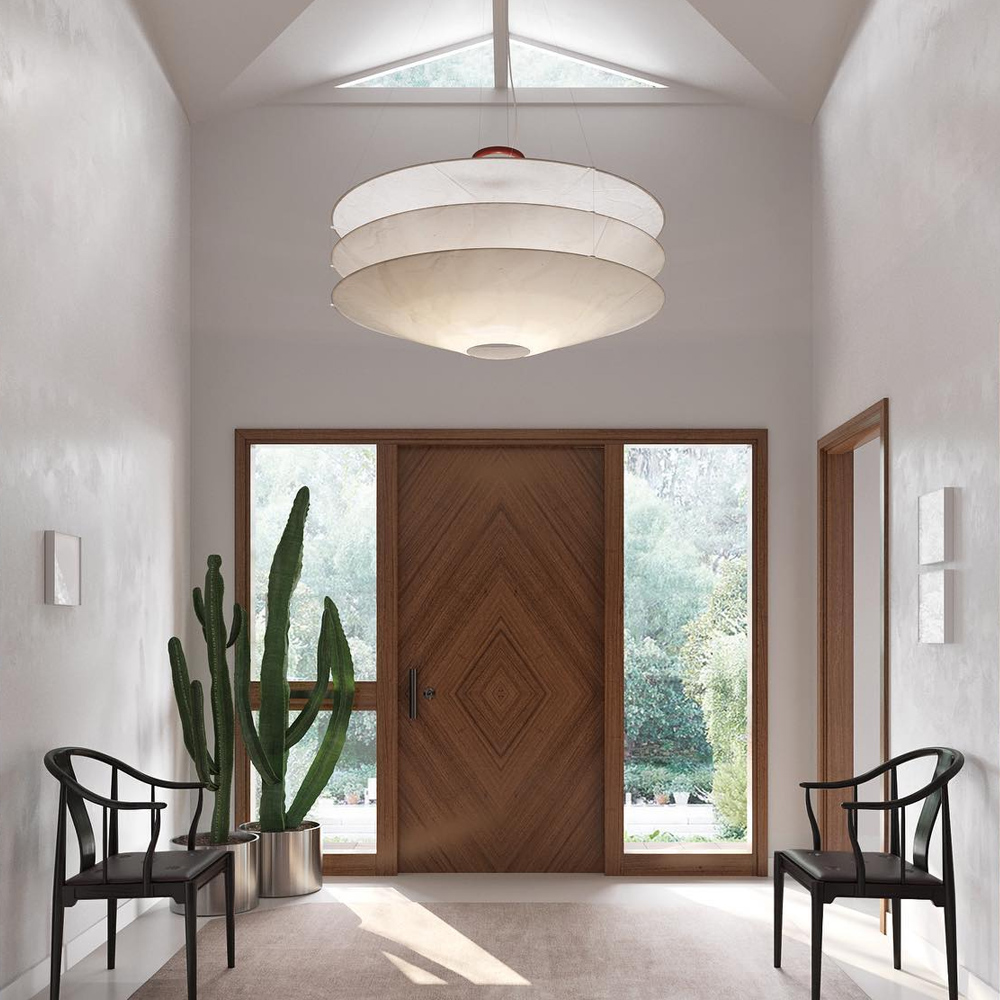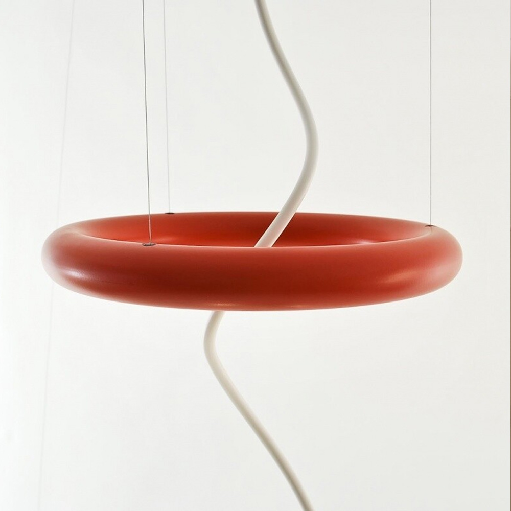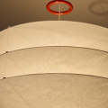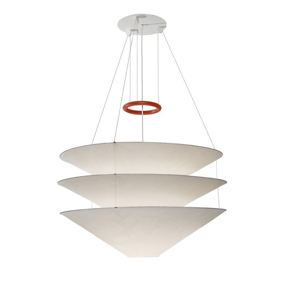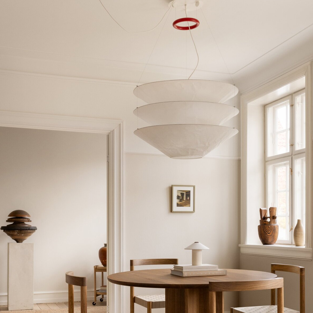 燈罩以傳統日本和紙(Japanese paper)手工製成,摺塑成三層碗狀結構,層層疊疊懸浮於細緻的金屬線纜之上,宛如雲霧般輕柔。圍繞燈體的紅色鐵環不僅是畫龍點睛的色彩重心,同時也是巧妙的配重與升降機構,使燈具高度可依需求自由調整,而整體結構仍保持穩定與優雅的懸吊姿態。
