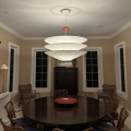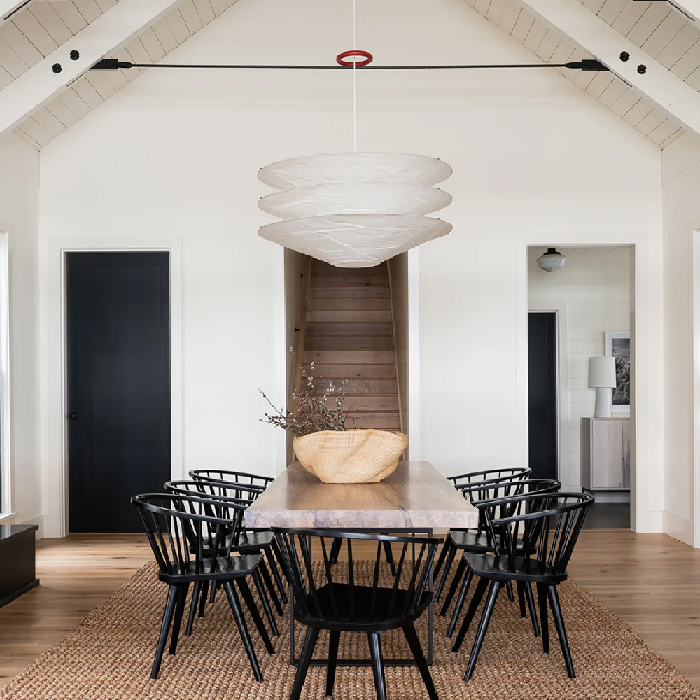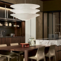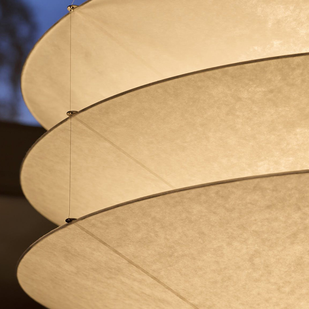 柔和的光線透過層層和紙濾出,營造出溫暖的氛圍與自然的陰影變化,無論懸掛於餐桌上方或高挑空間之中,都能散發出一種輕盈、流動、幾乎靜止的美感。