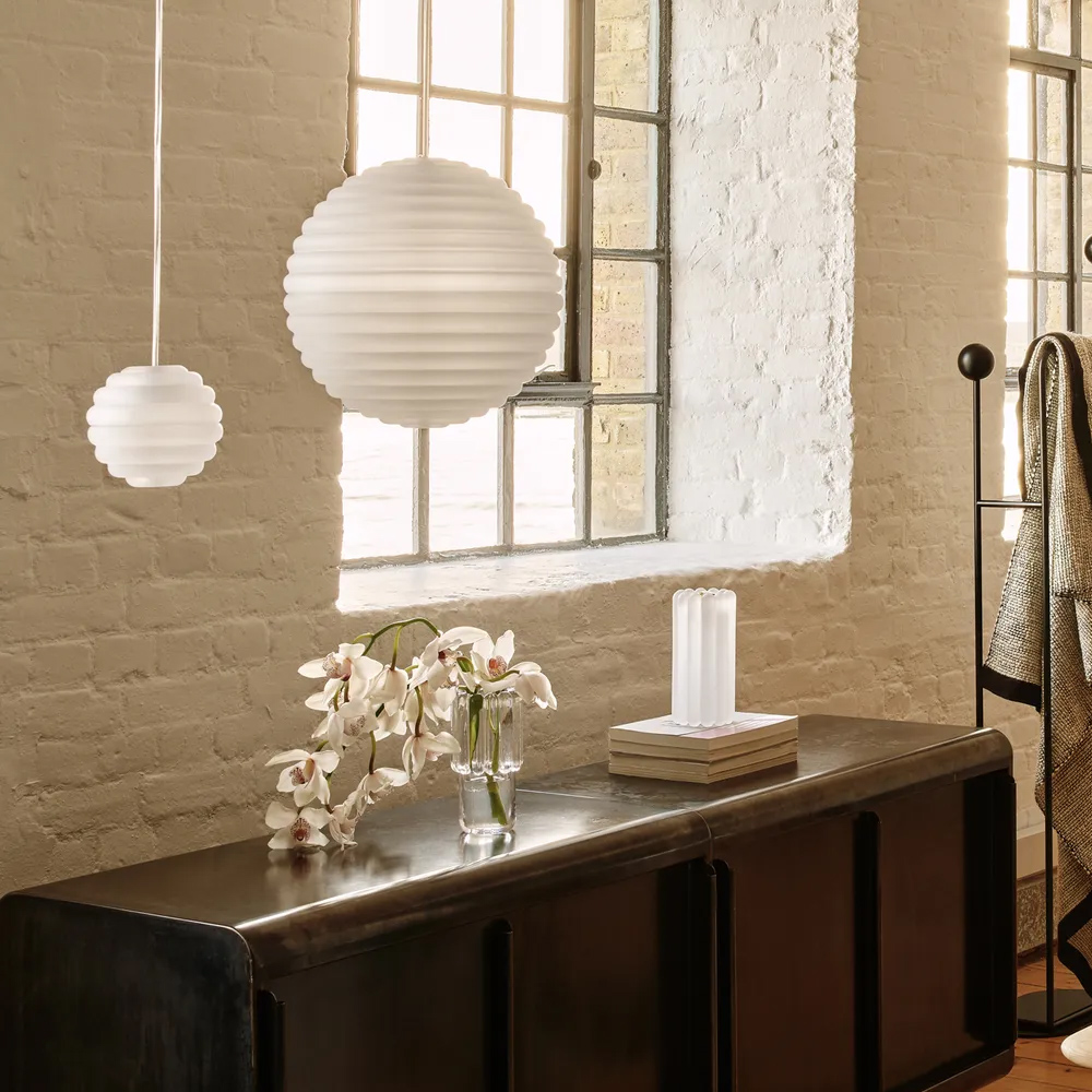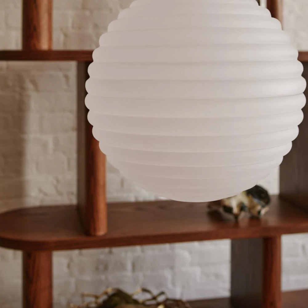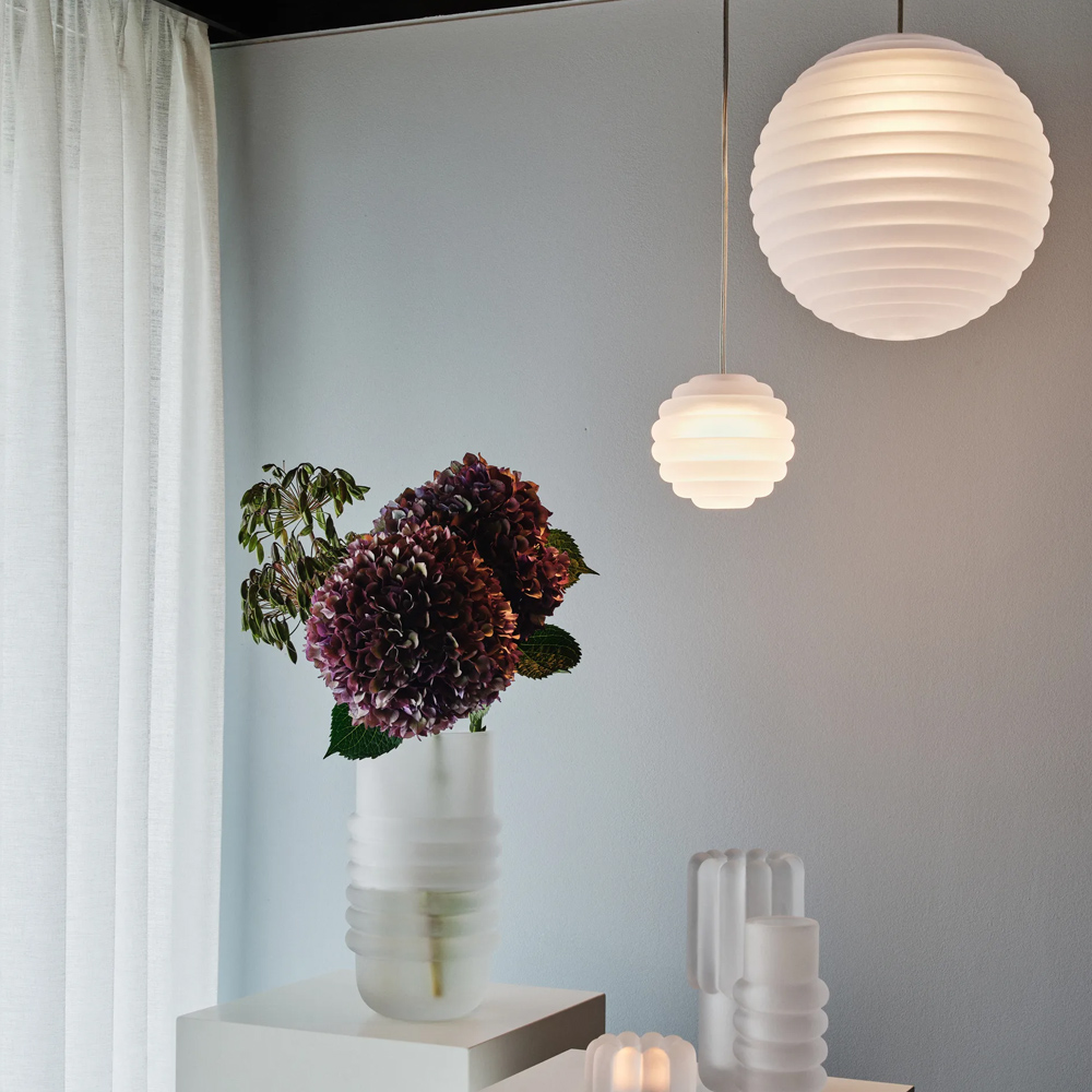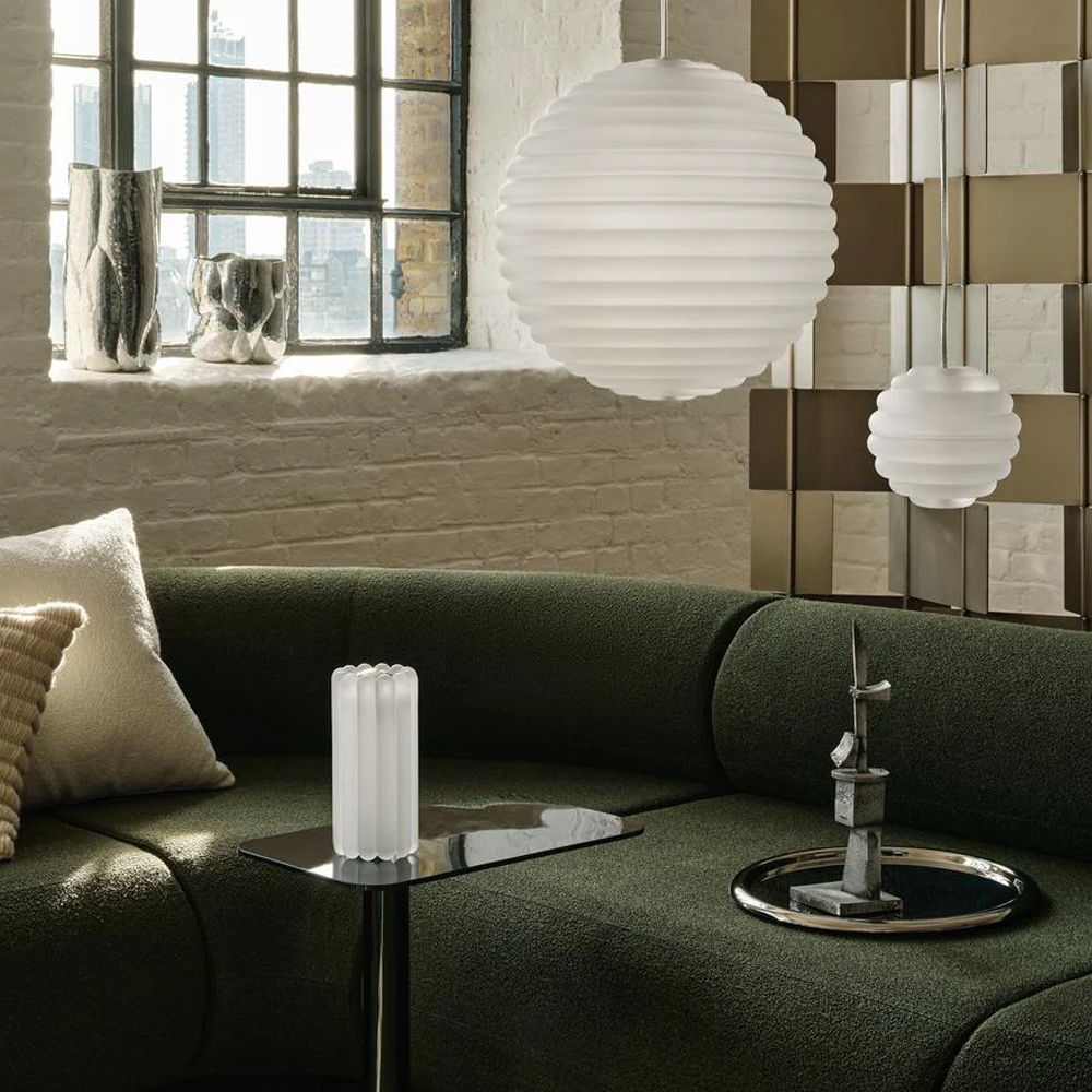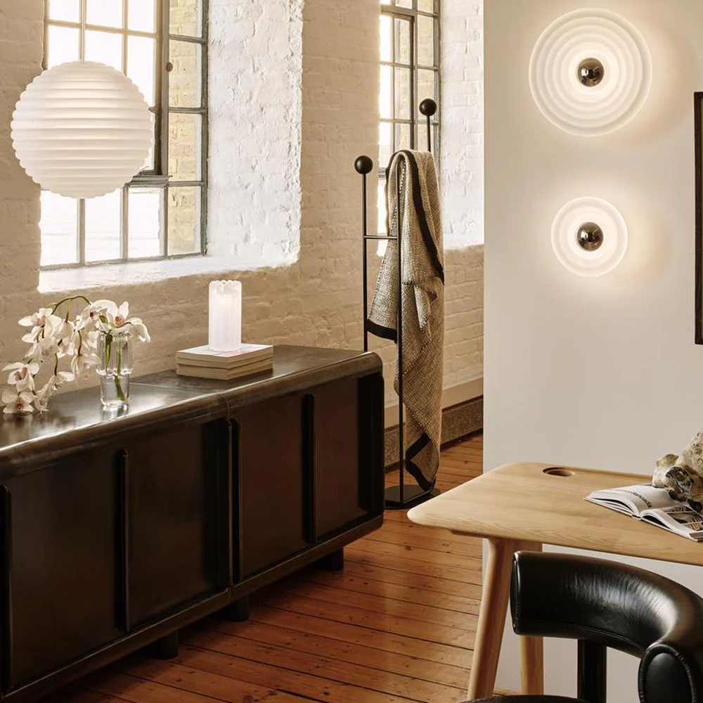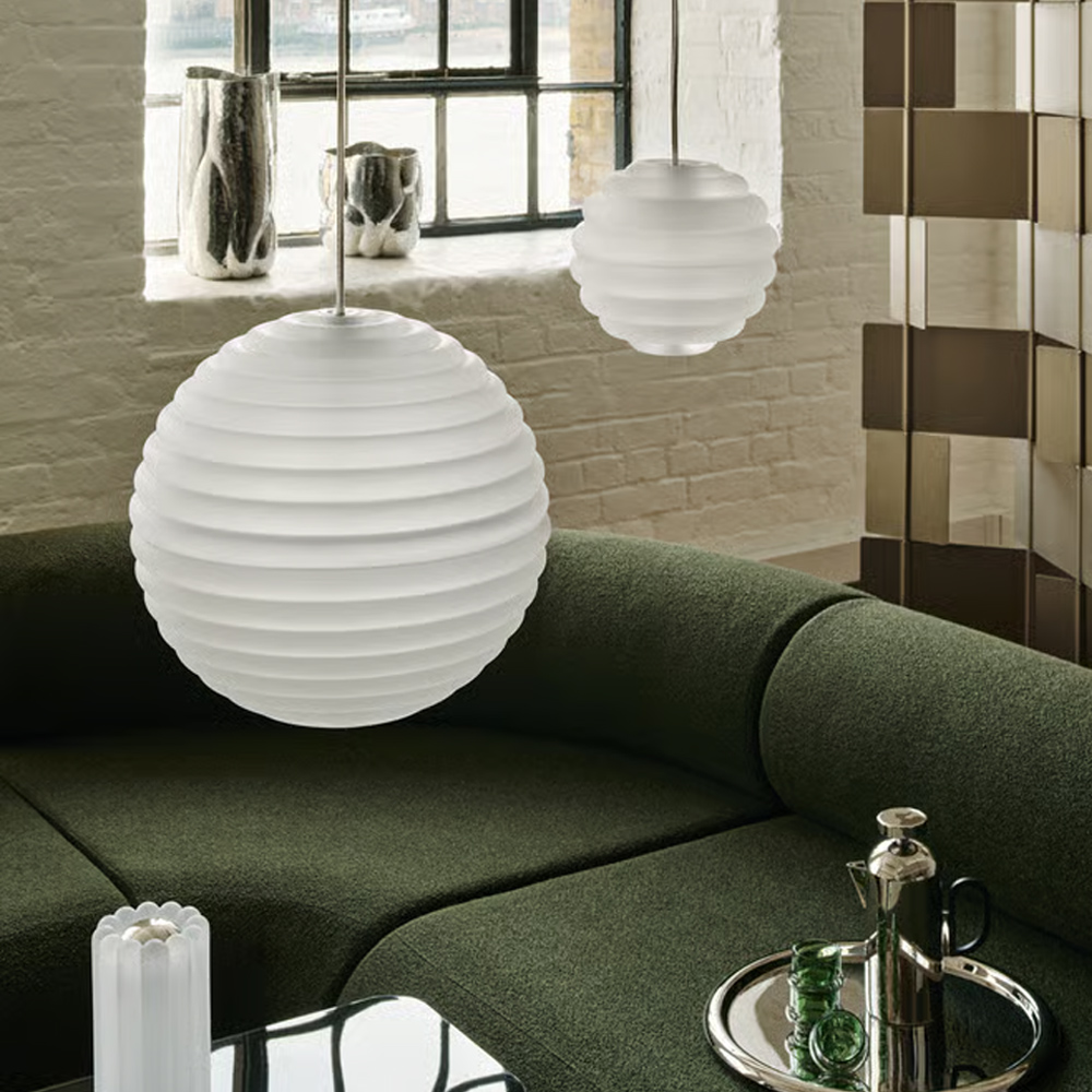 靈感取自海上浮標的圓潤造型,Tom Dixon Press Frosted Sphere 吊燈以厚實壓製玻璃搭配噴砂霧面處理,將原本通透的玻璃轉化為細膩柔霧。當光線透過層層線條折射,散發出溫暖的光暈,既能單盞吊掛,營造靜謐氛圍,也能多盞組合,形成立體而雕塑感的視覺焦點。