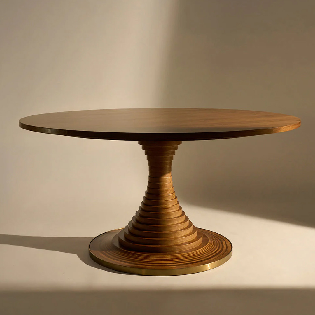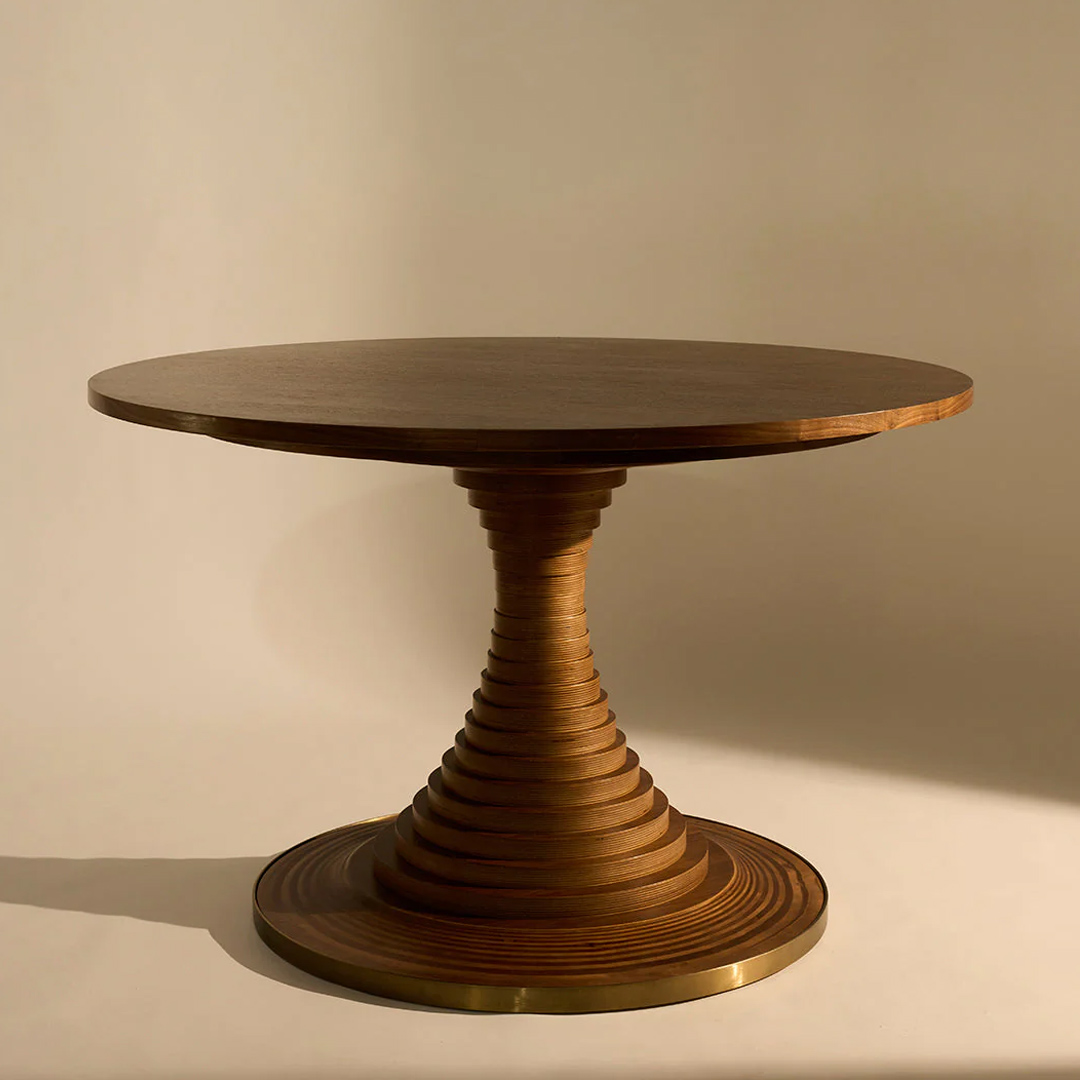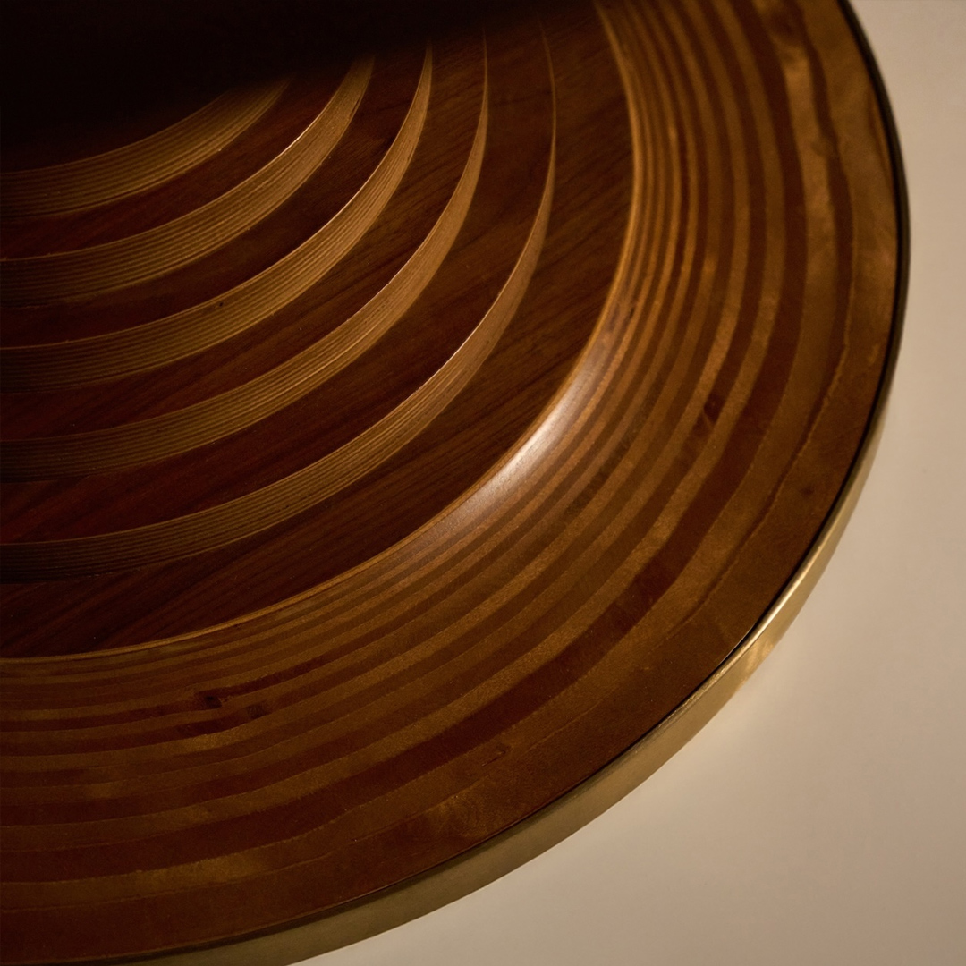 桌體以多層不同直徑的 FSC® Mix 認證樺木夾板圓盤堆疊而成,中央隱藏金屬核心,形成穩定且流暢的立體弧線,支撐著覆以胡桃木皮的圓形桌面(提供兩種尺寸)。底座環繞一圈仿古銅色鋼帶,不僅增添材質對比,也起到保護作用。這種獨特的層疊結構使桌體彷彿一件雕塑作品,從任何角度觀賞都充滿建築感與張力。