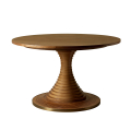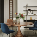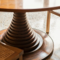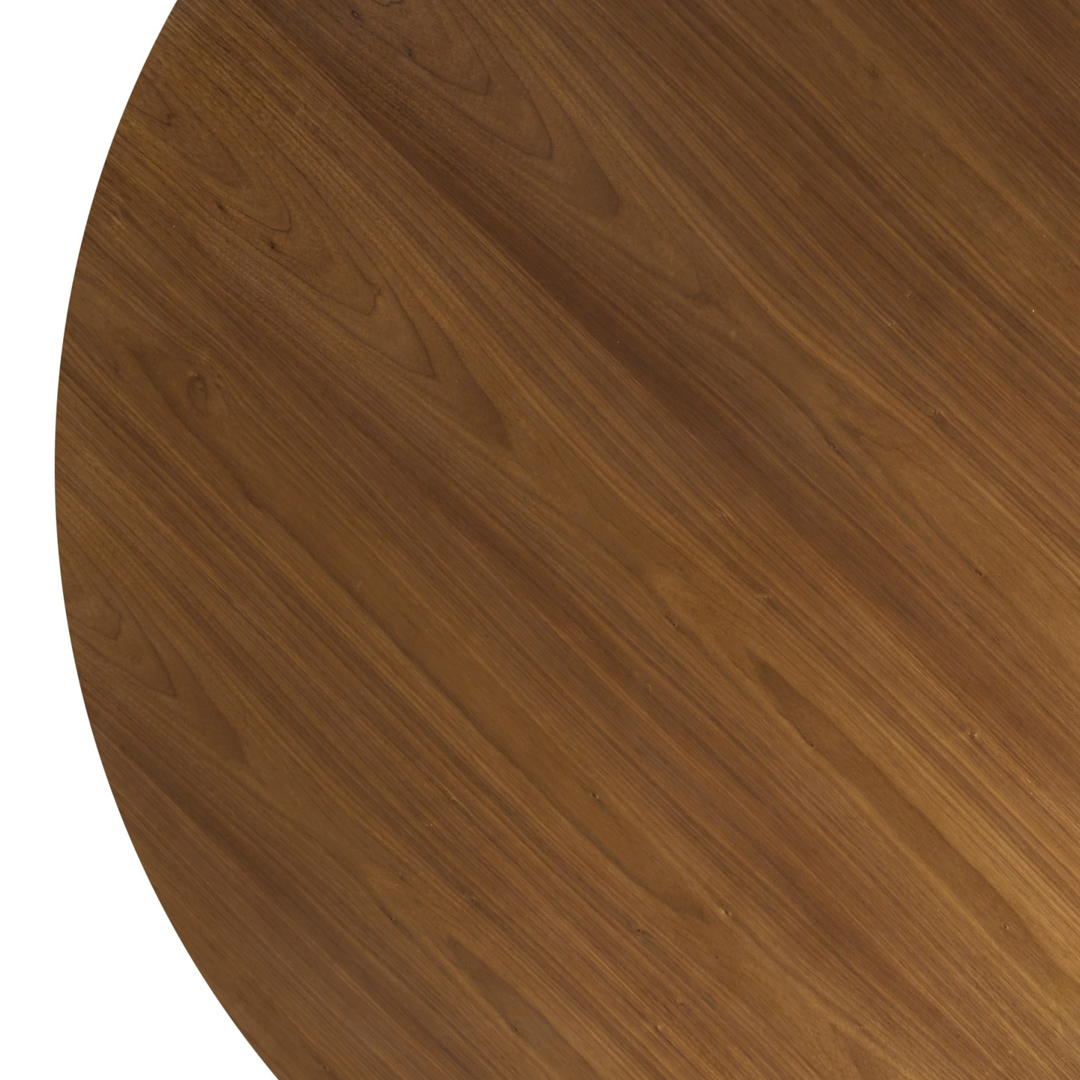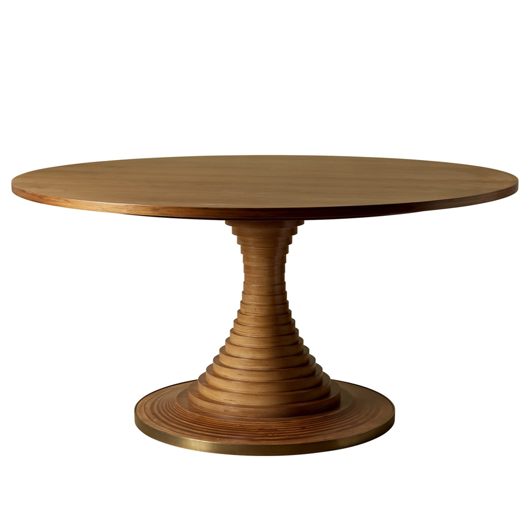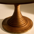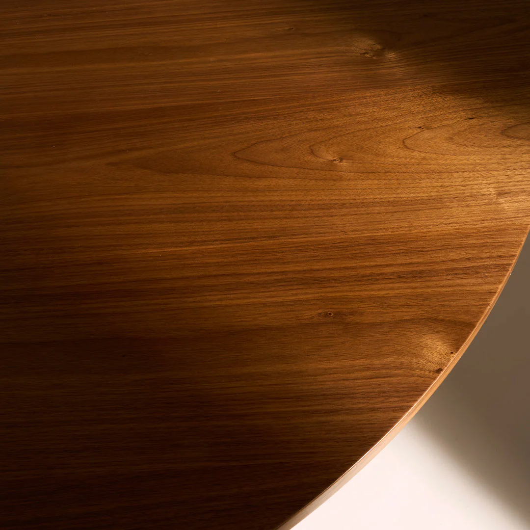 桌體以多層不同直徑的 FSC® Mix 認證樺木夾板圓盤堆疊而成,中央隱藏金屬核心,形成穩定且流暢的立體弧線,支撐著覆以胡桃木皮的圓形桌面(提供兩種尺寸)。底座環繞一圈仿古銅色鋼帶,不僅增添材質對比,也起到保護作用。這種獨特的層疊結構使桌體彷彿一件雕塑作品,從任何角度觀賞都充滿建築感與張力。