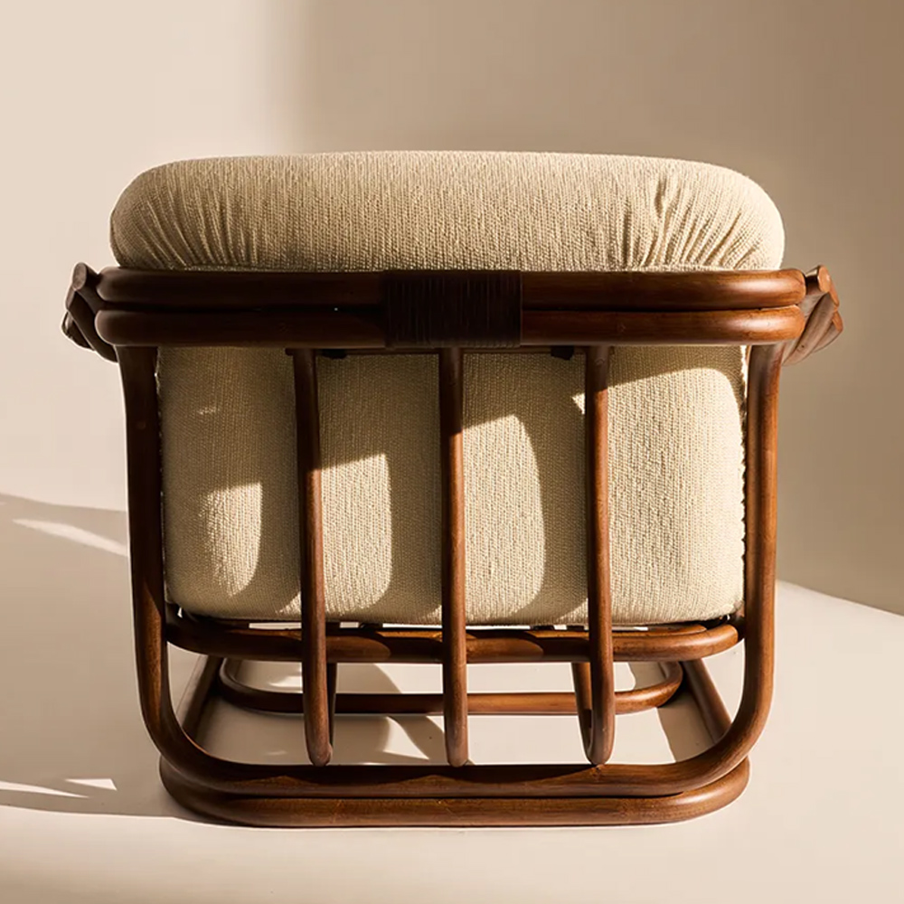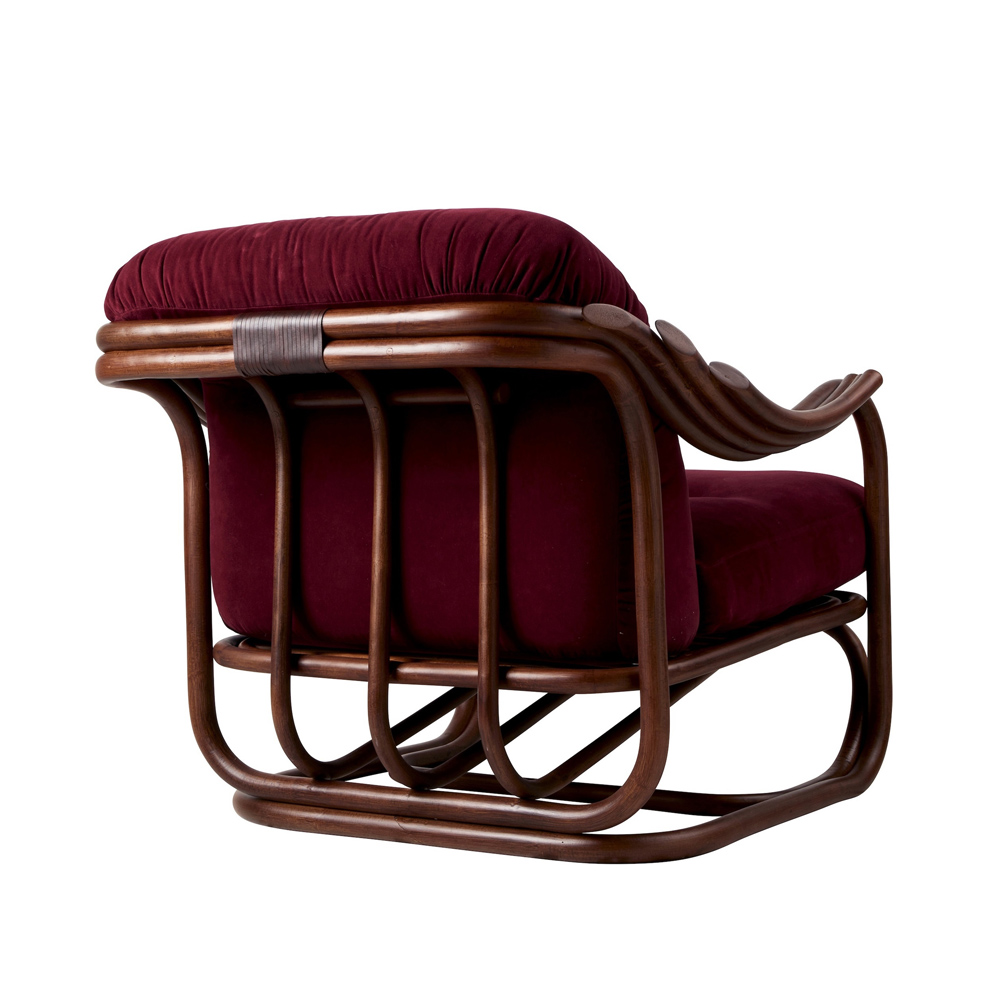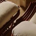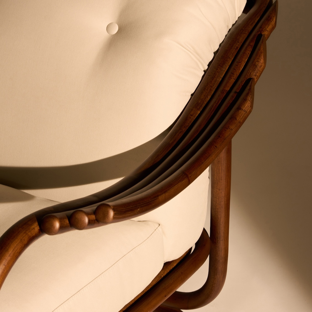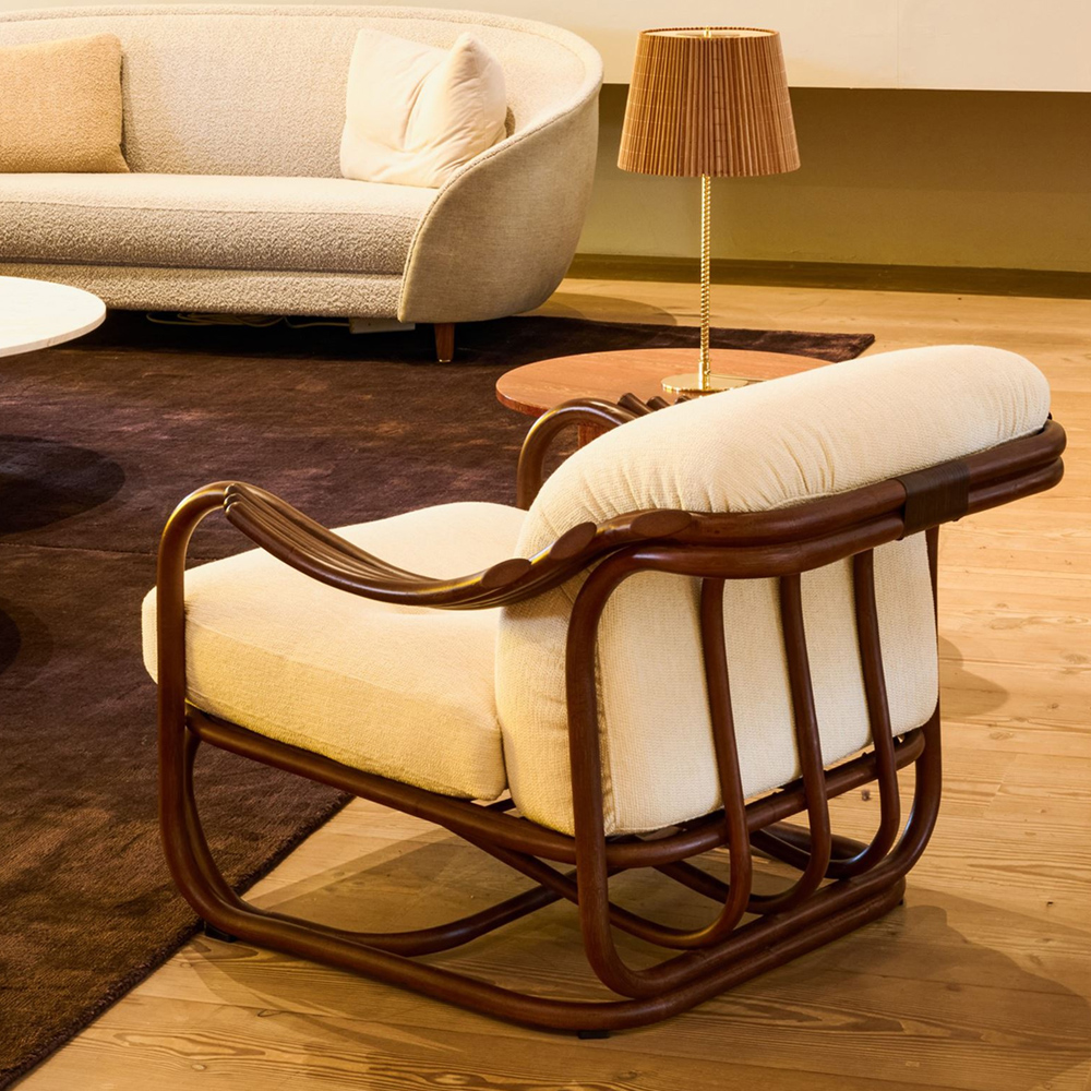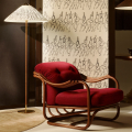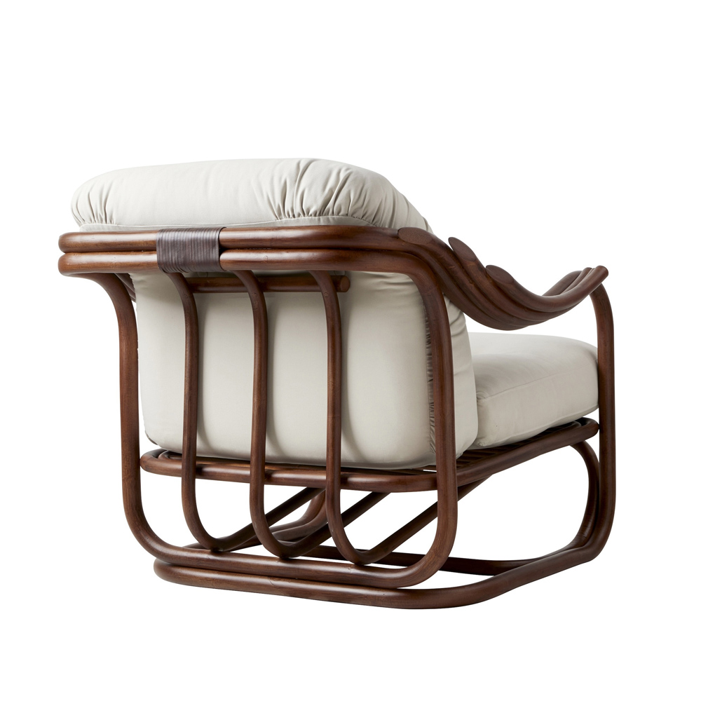 椅身幾乎完全由蒸氣彎曲的藤條手工製成,每根藤材皆經精挑細選,以確保直徑、色澤與質感的一致性。彎曲與組裝過程需仰賴極高的手工技藝,使結構在視覺上輕盈流暢,卻又堅實穩定。其獨特的扶手設計以三根不同長度的藤條並列成形,展開如翅膀般的弧度,既具雕塑感,也帶來包覆與支撐的舒適體驗。配備兩個深厚可拆卸的坐墊,Poltrona Tria 提供柔軟與支撐兼具的放鬆感,讓人自然地沉浸於悠閒時光。天然藤材的紋理與溫潤色調,為室內空間帶來一抹自然氣息,無論置於客廳、書房或日光室,都能與現代、經典或波西米亞風格完美共鳴。