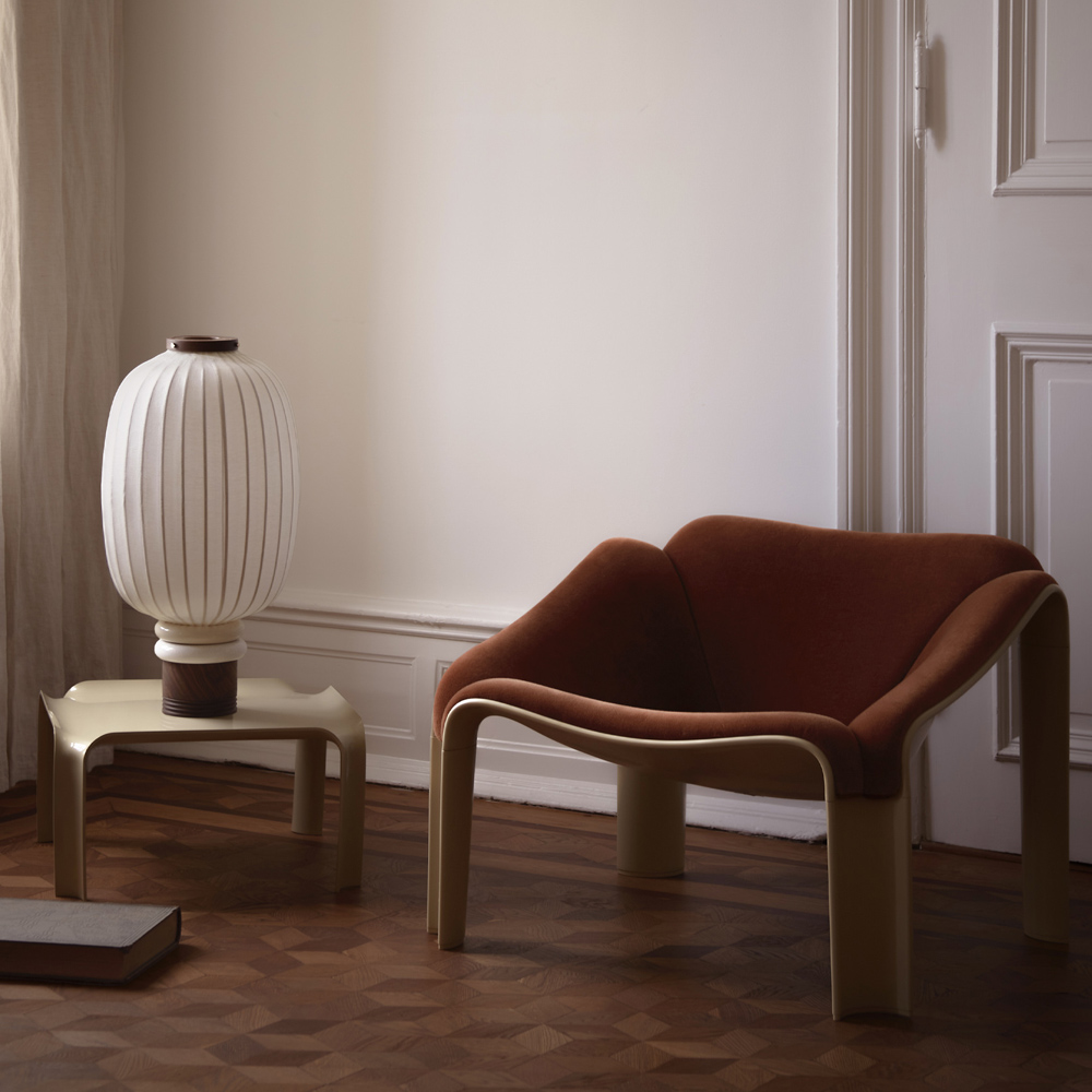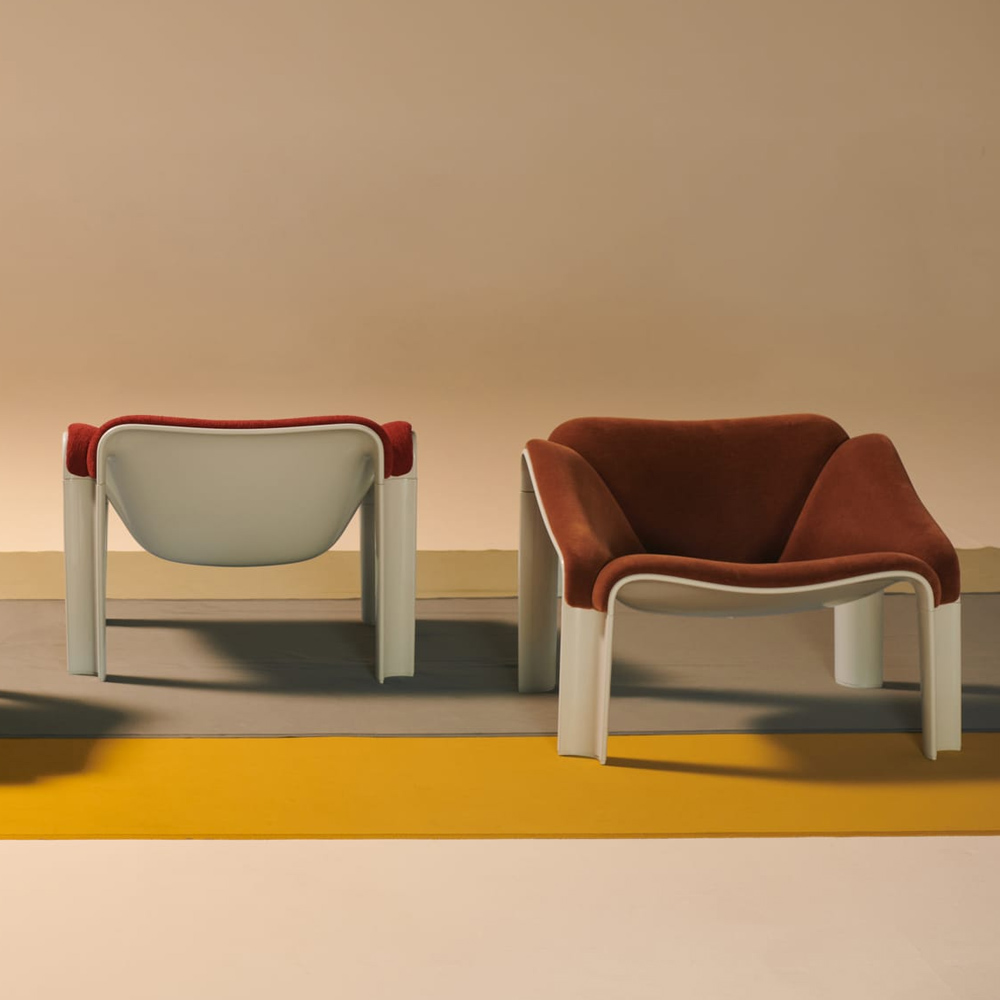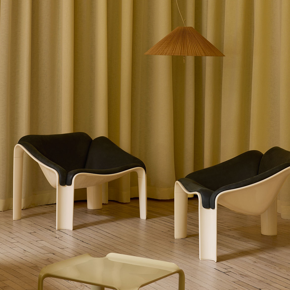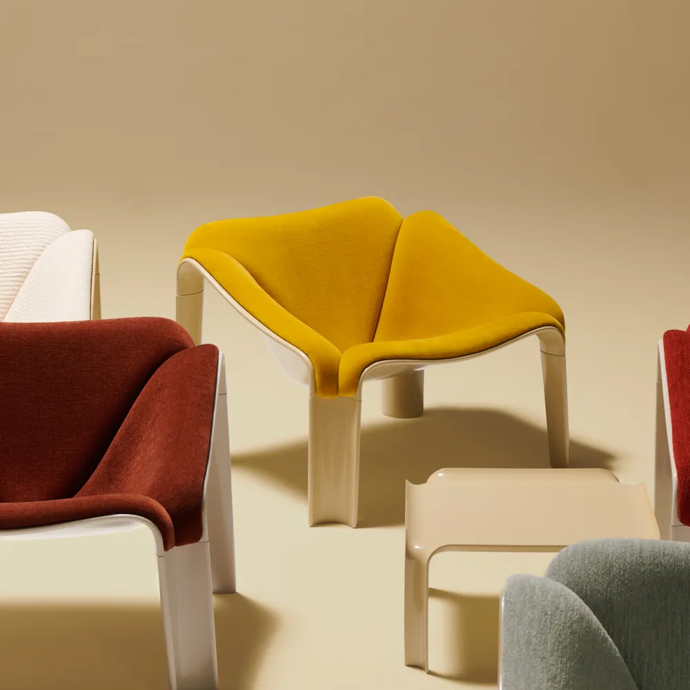 半世紀後,GUBI 重啟這款傳奇之作,透過深入研究與精準重製,讓 Paulin 的原始構想再次重生。新版 F300 以義大利製造的 HiREK® 工程聚合物打造而成——這是一種以工業塑料廢料再製的創新材料,兼具輕量、堅固與抗紫外線特性,並可直接呈現高亮光澤表面,減少額外加工與生產浪費。這不僅忠實還原了原作的視覺質感與結構強度,也以當代永續的方式詮釋經典。