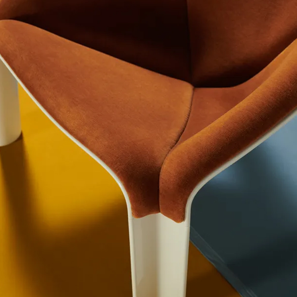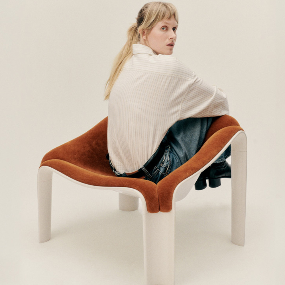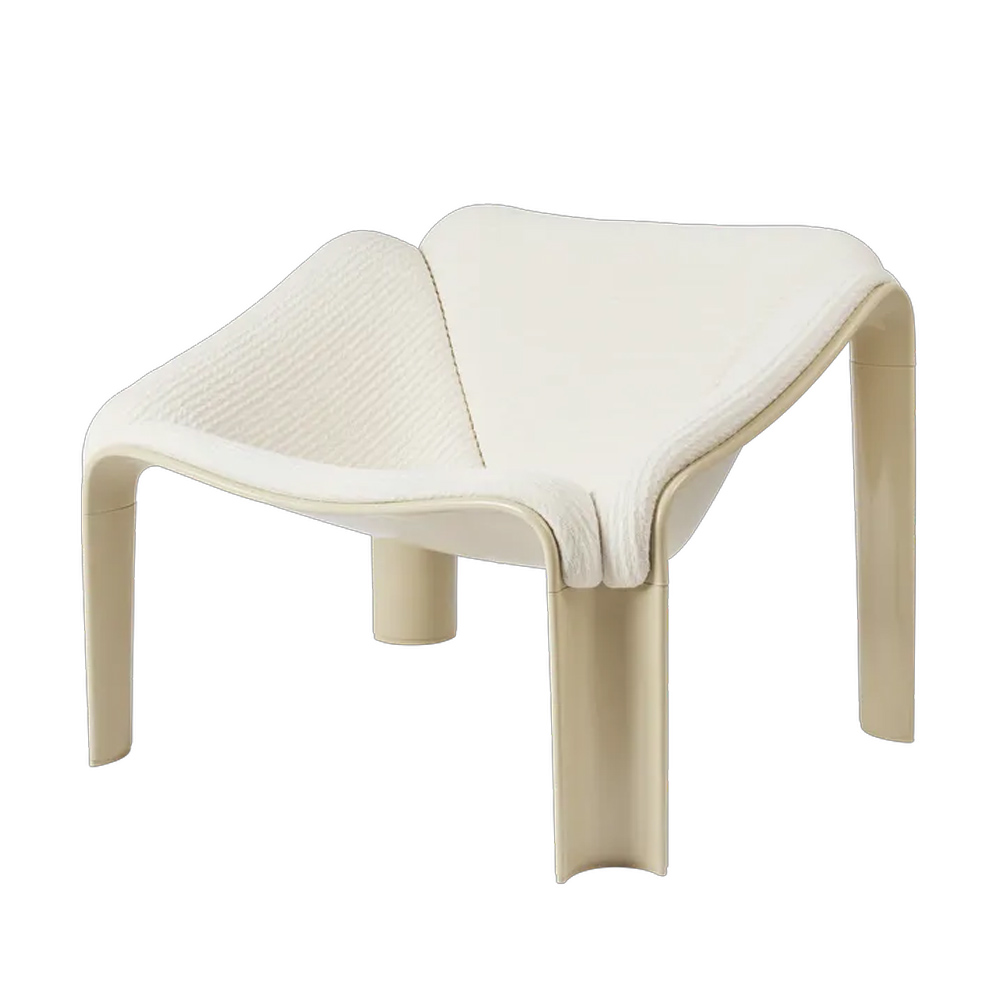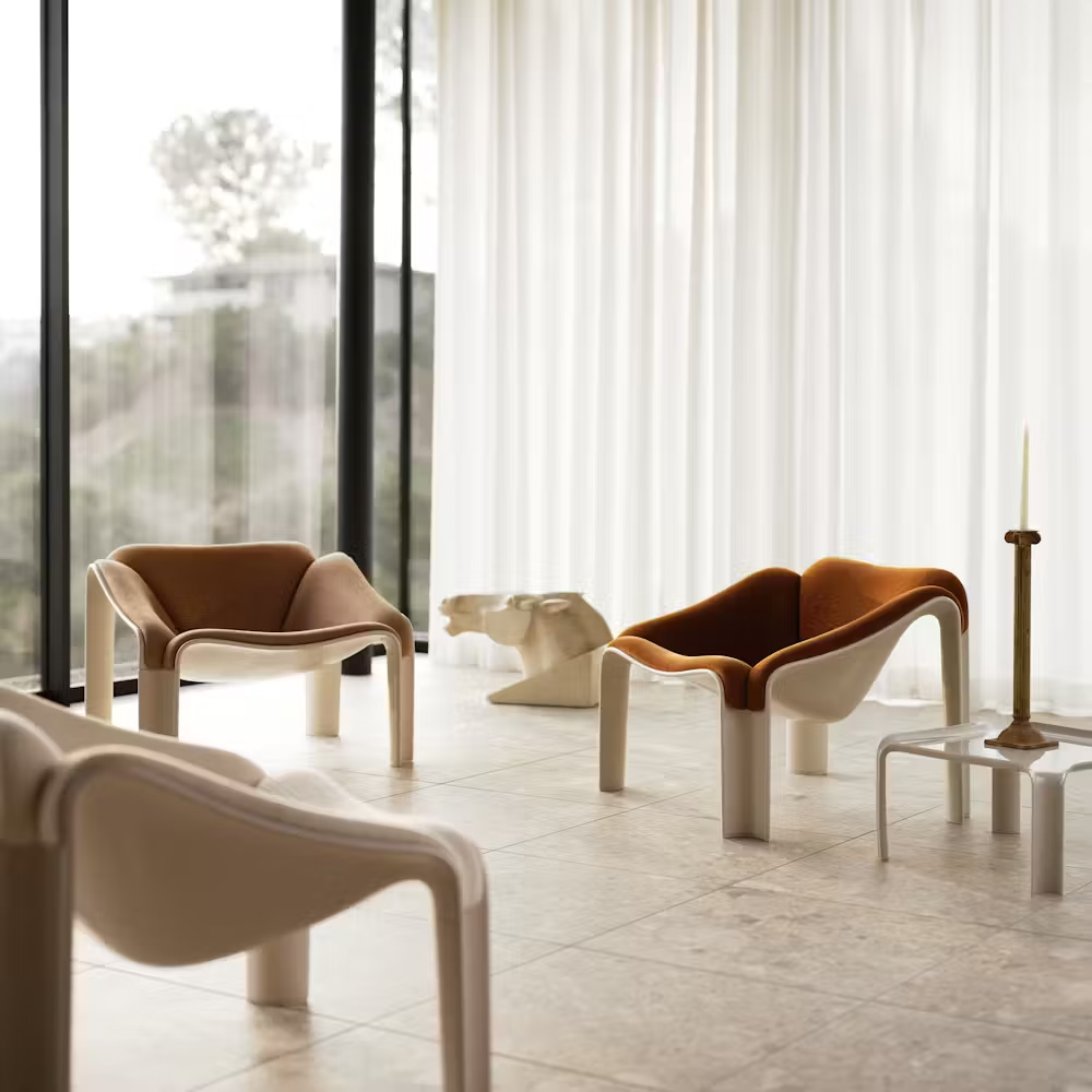 半世紀後,GUBI 重啟這款傳奇之作,透過深入研究與精準重製,讓 Paulin 的原始構想再次重生。新版 F300 以義大利製造的 HiREK® 工程聚合物打造而成——這是一種以工業塑料廢料再製的創新材料,兼具輕量、堅固與抗紫外線特性,並可直接呈現高亮光澤表面,減少額外加工與生產浪費。這不僅忠實還原了原作的視覺質感與結構強度,也以當代永續的方式詮釋經典。