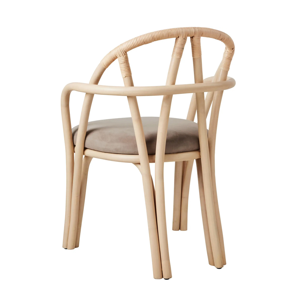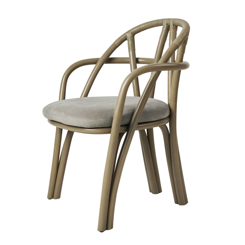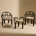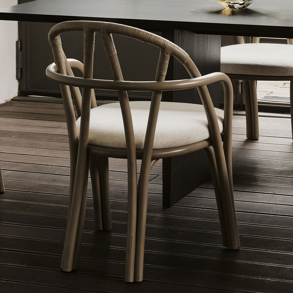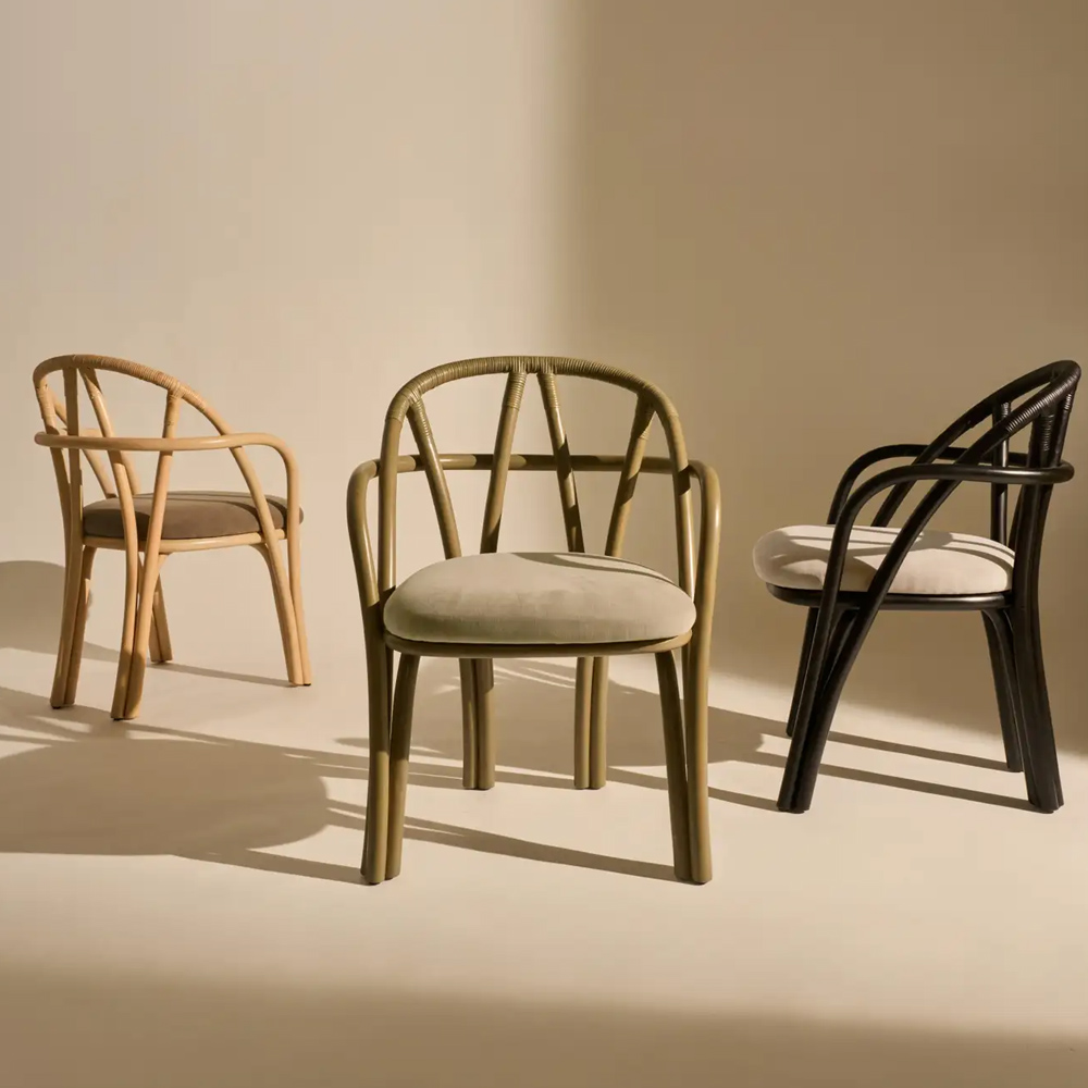 Bistra 將 20 世紀初的經典咖啡館藤椅加以提煉,以更純粹的線條描繪經典輪廓。整個系列包括扶手椅、休閒椅與三腳凳三款設計,皆以三個關鍵的蒸彎藤材元素構成:弧形靠背、環繞扶手,以及自地面延伸而上的雙岔結構。藤條之間的同色系綁繩呼應傳統工藝,而向上展開的線條則帶來輕盈、自然的抬升感。