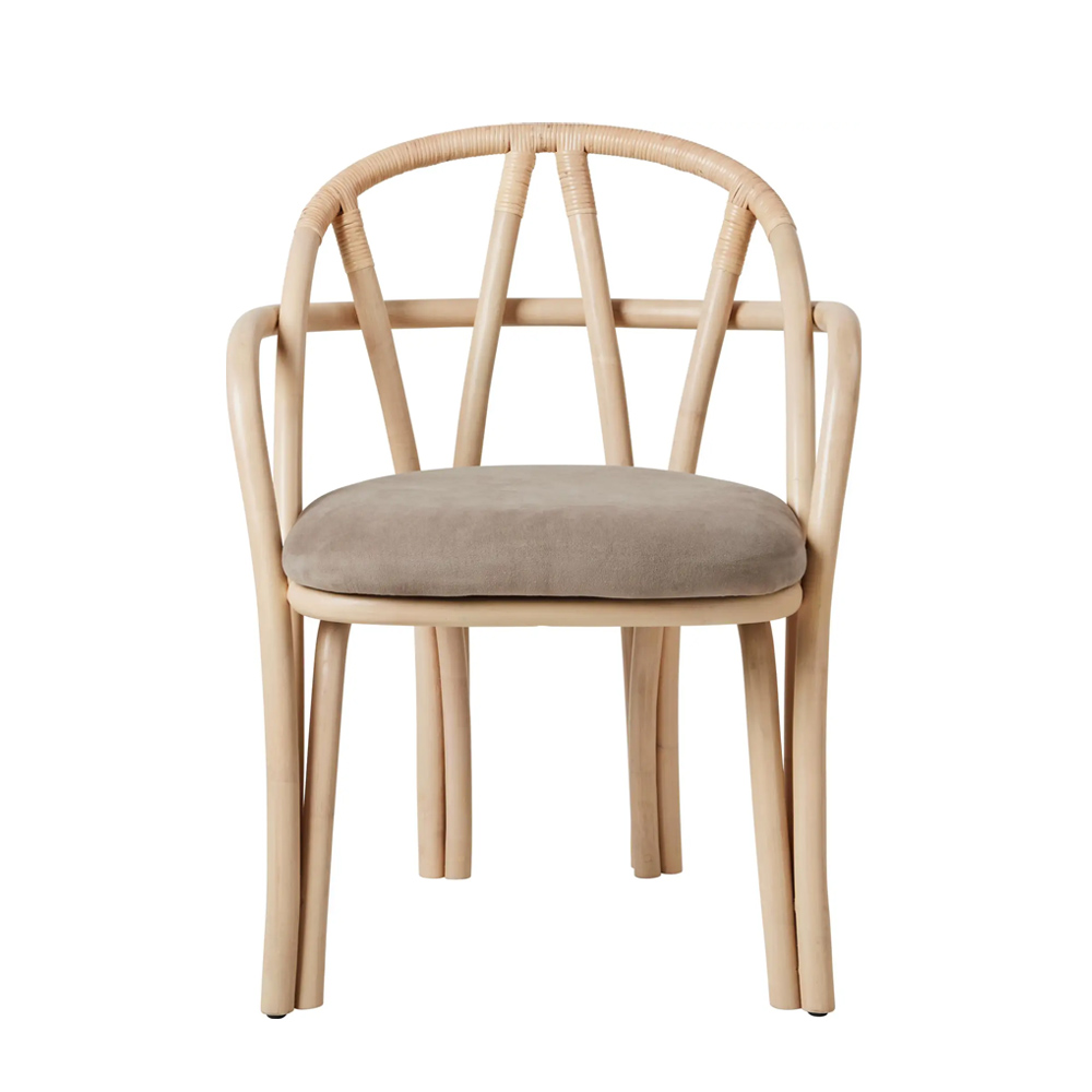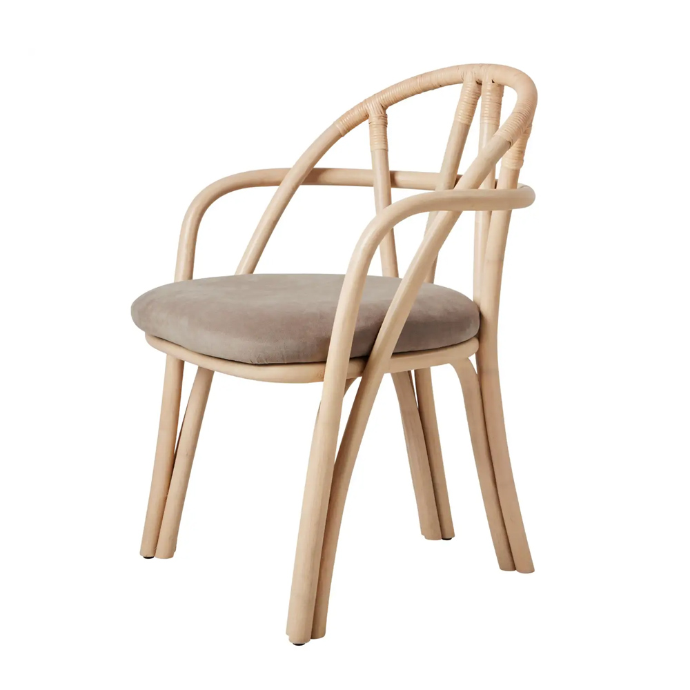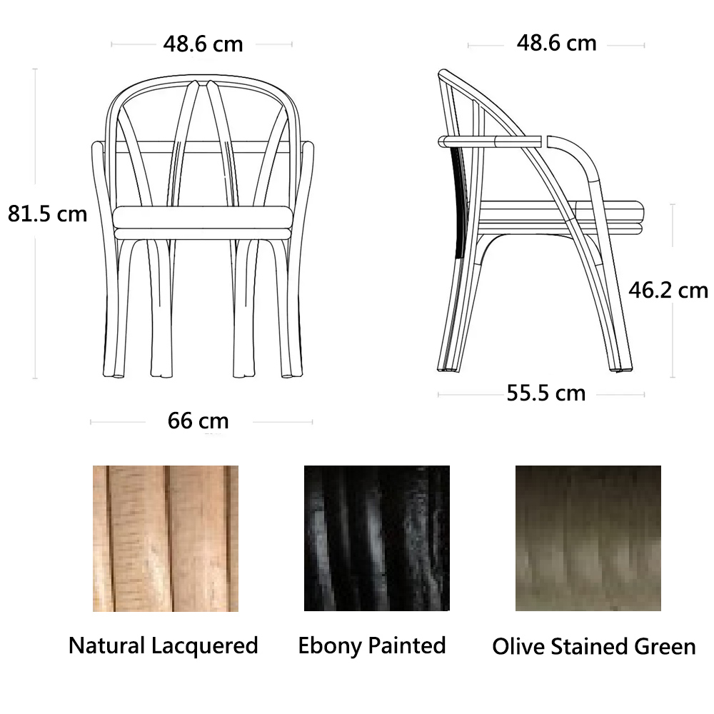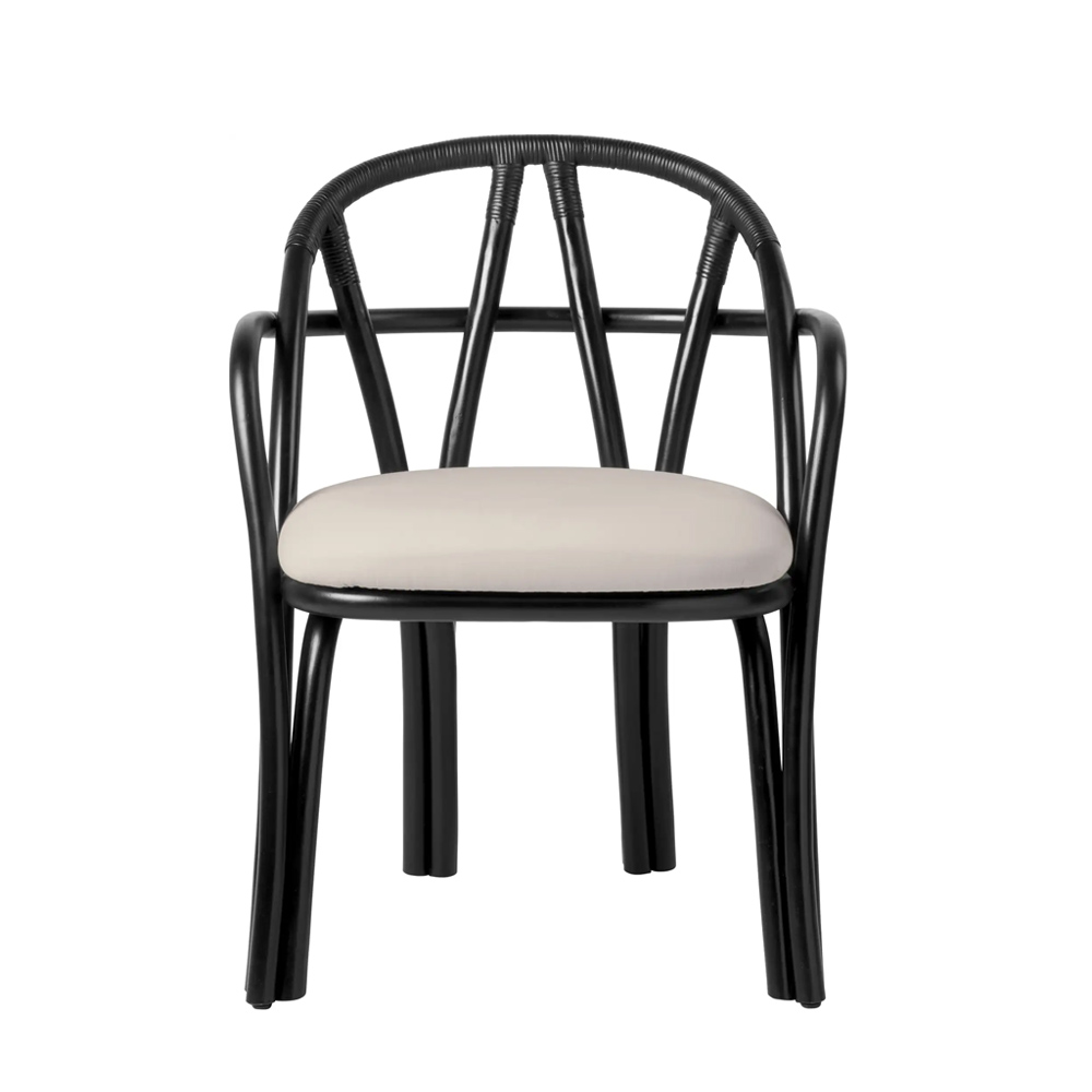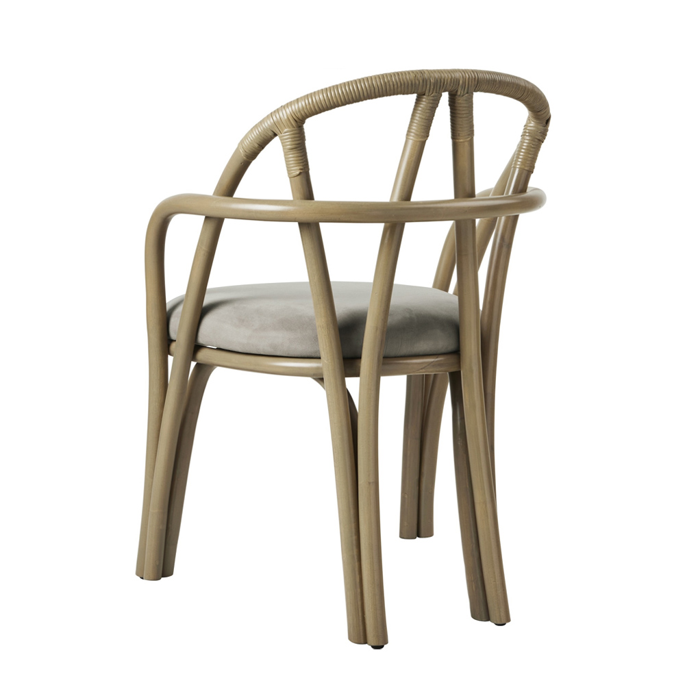 Bistra 將 20 世紀初的經典咖啡館藤椅加以提煉,以更純粹的線條描繪經典輪廓。整個系列包括扶手椅、休閒椅與三腳凳三款設計,皆以三個關鍵的蒸彎藤材元素構成:弧形靠背、環繞扶手,以及自地面延伸而上的雙岔結構。藤條之間的同色系綁繩呼應傳統工藝,而向上展開的線條則帶來輕盈、自然的抬升感。