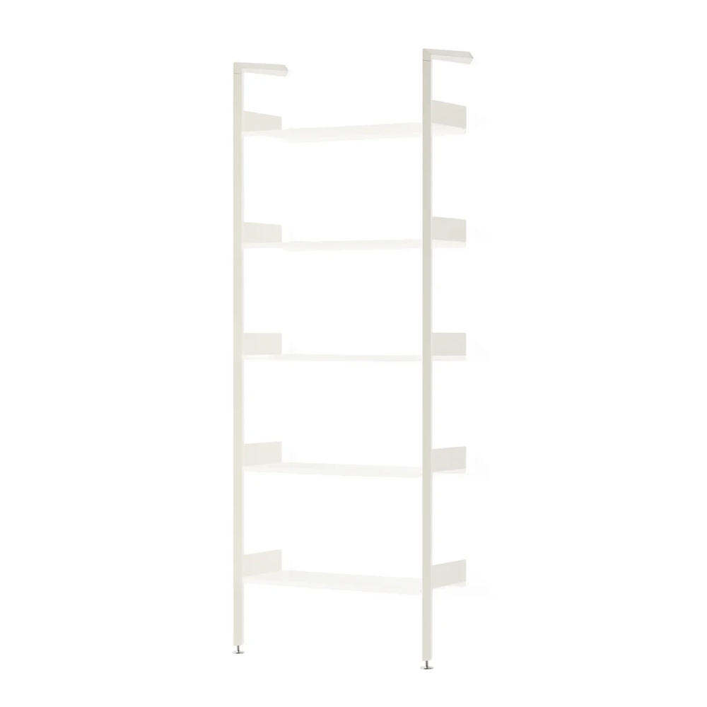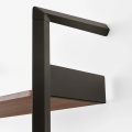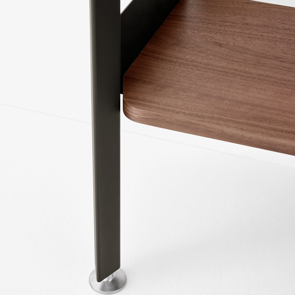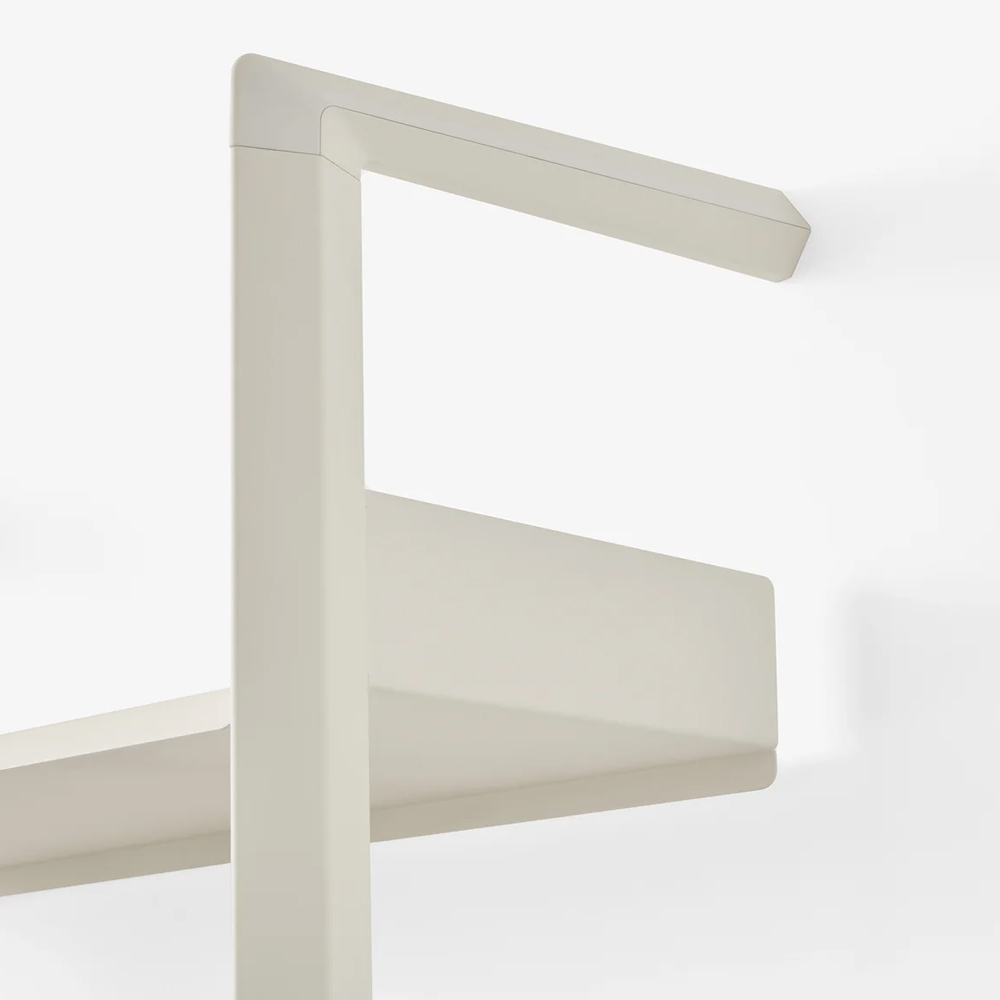 Rombe 安裝方式亦展現了 Industrial Facility 對細節的執著:整組系統僅以四個接點固定於牆面,兩個位於最上端的壁掛結構,另兩個隱藏在中段,使牆體保持乾淨完整。層板、桌面與櫃體則與直立支架連結,同時與牆面保持適度距離,不僅留出線材通道,也讓整體視覺更顯輕盈。無論是地坪微幅不平、牆面深度的差異,或多組 bay 串接後可能產生的偏移,Rombe 都能在安裝過程中以精準調節達成完美對齊。甚至連附上的六角扳手都有專屬收納空間,隱藏於支架內部,使後續拆裝或搬遷更為便利,也讓整個系統具備長期陪伴不同場域的可能性。