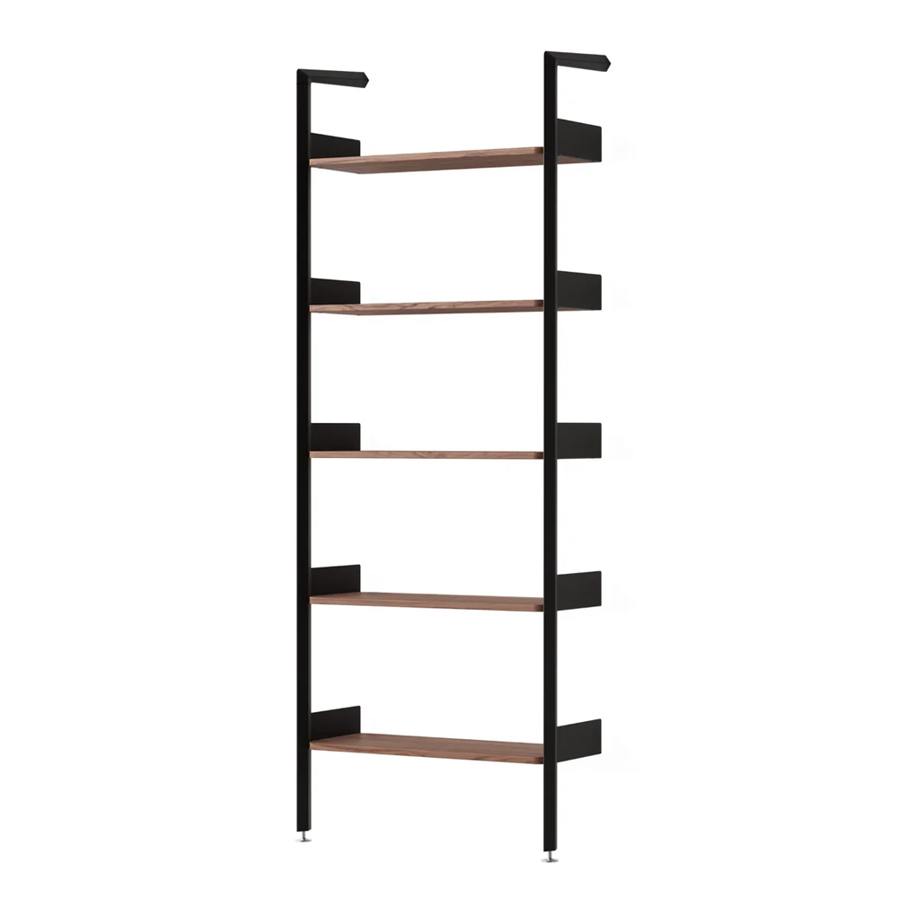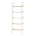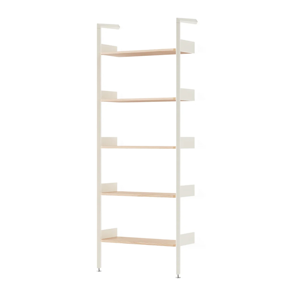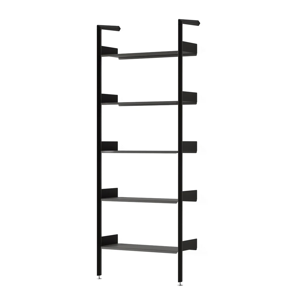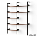 材質的選擇同樣精準而節制:擠型鋁合金構成骨幹,提供隱蔽而堅固的固定結構;層板與桌面以橡木或胡桃木貼皮呈現溫潤觸感;櫃體則搭配溝紋玻璃滑門,在半透明的朦朧層次之間,讓視線得以在展示與收納之間取得平衡。整體提供 Alabaster 白色與 Anthracite 深灰色兩種色彩方向,分別搭配相應的木皮細節,讓系統能自然融入不同調性的空間語境。