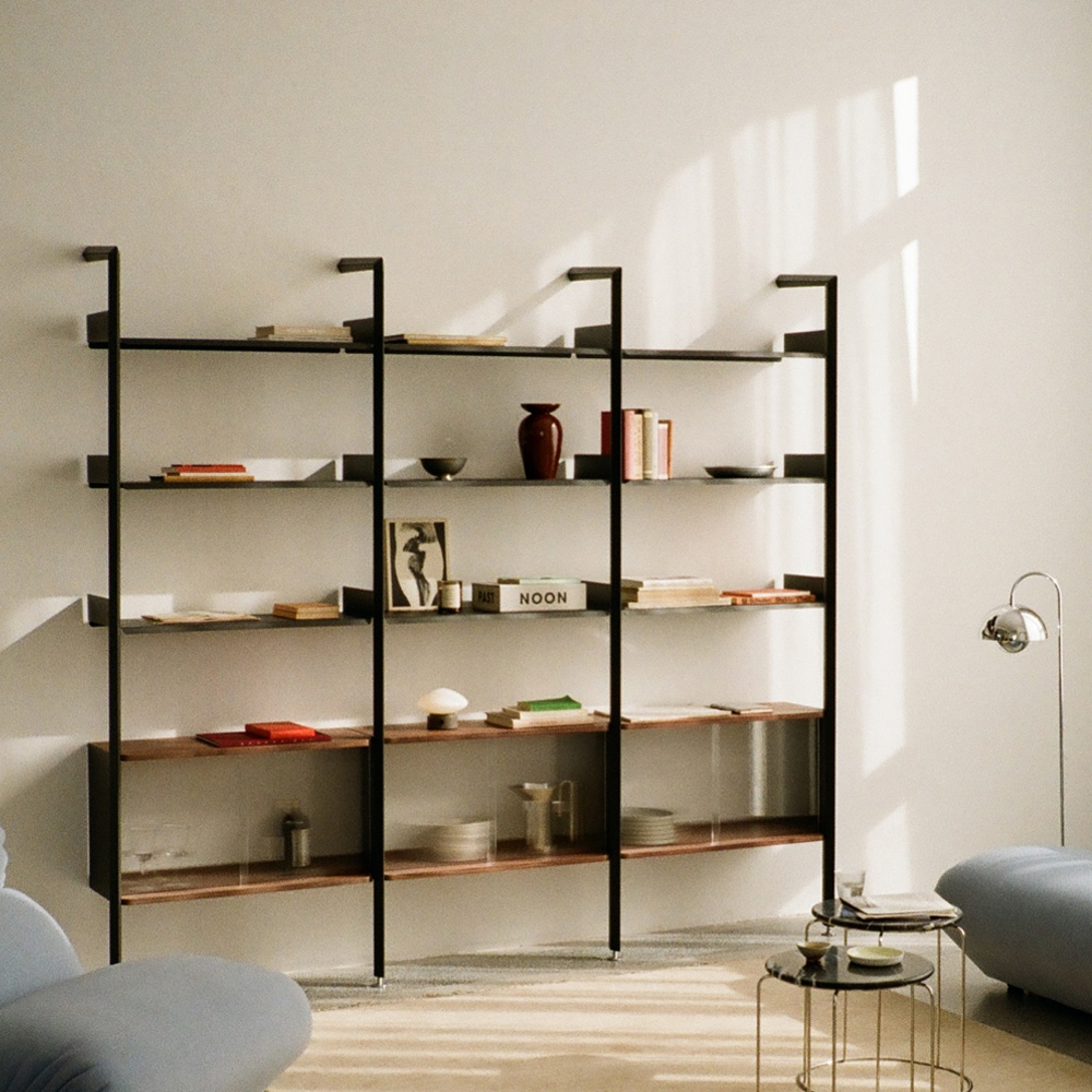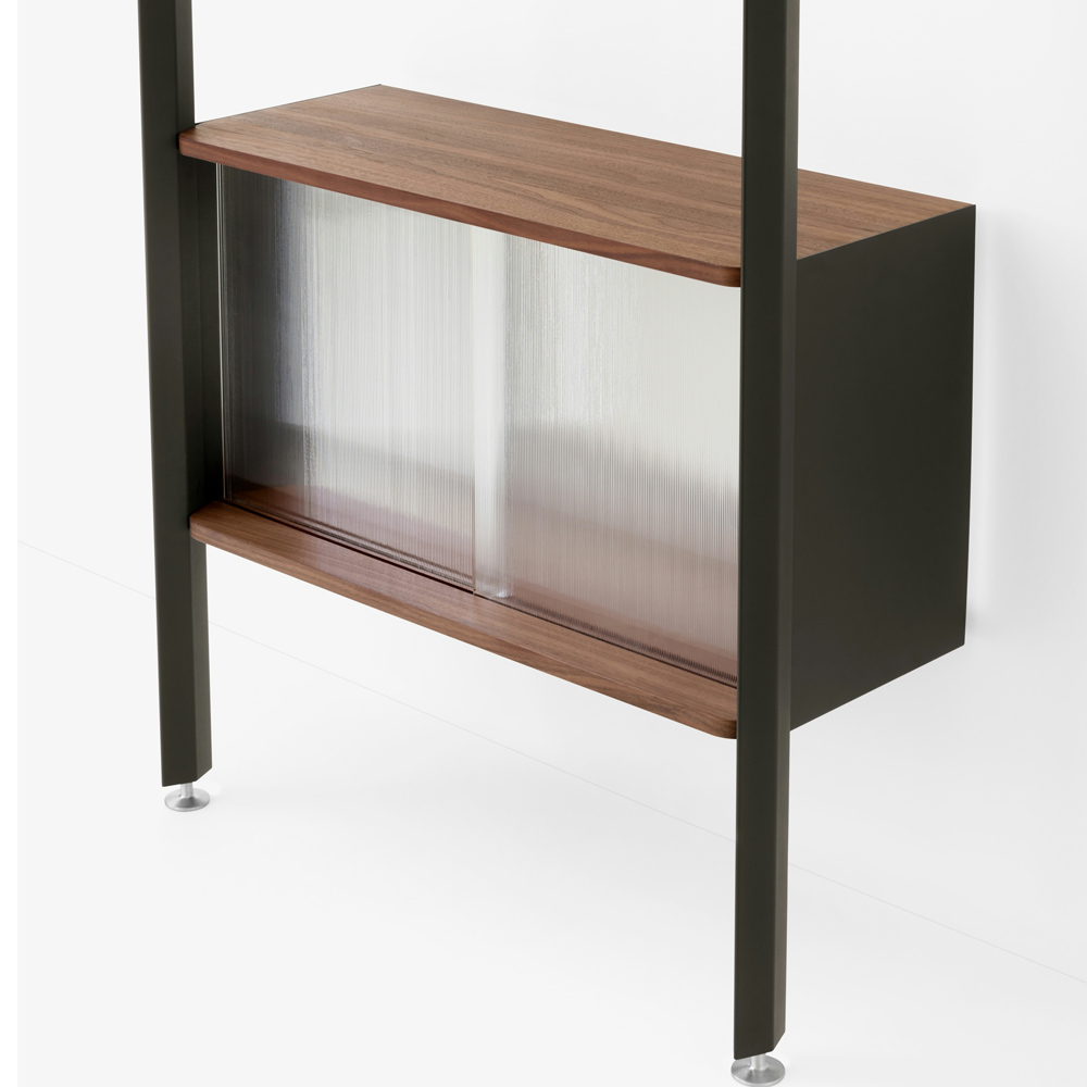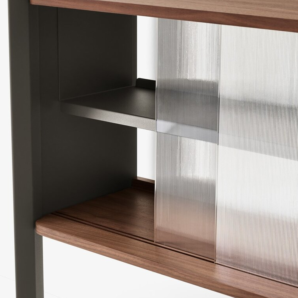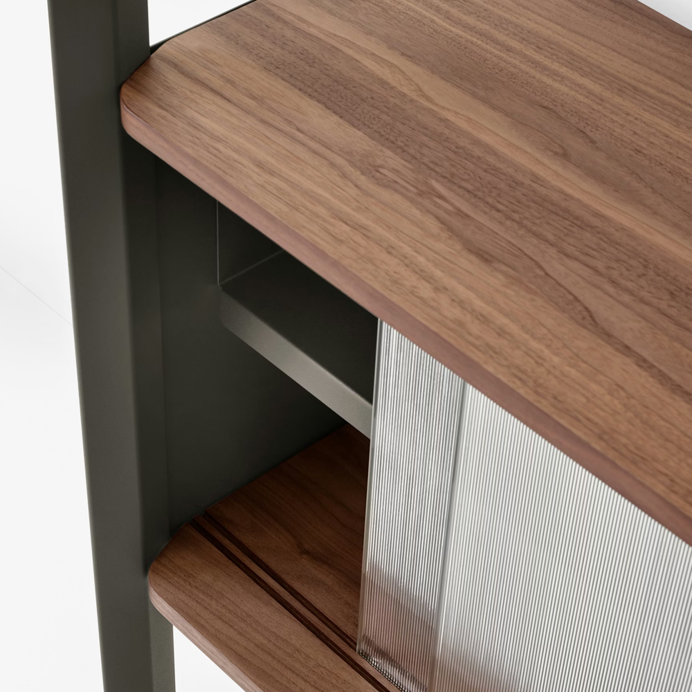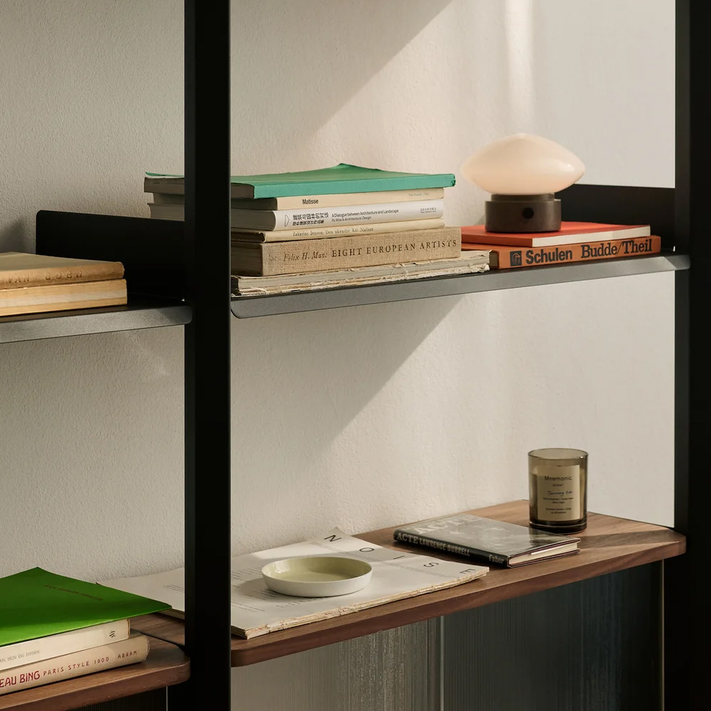 材質的選擇同樣精準而節制:擠型鋁合金構成骨幹,提供隱蔽而堅固的固定結構;層板與桌面以橡木或胡桃木貼皮呈現溫潤觸感;櫃體則搭配溝紋玻璃滑門,在半透明的朦朧層次之間,讓視線得以在展示與收納之間取得平衡。整體提供 Alabaster 白色與 Anthracite 深灰色兩種色彩方向,分別搭配相應的木皮細節,讓系統能自然融入不同調性的空間語境。