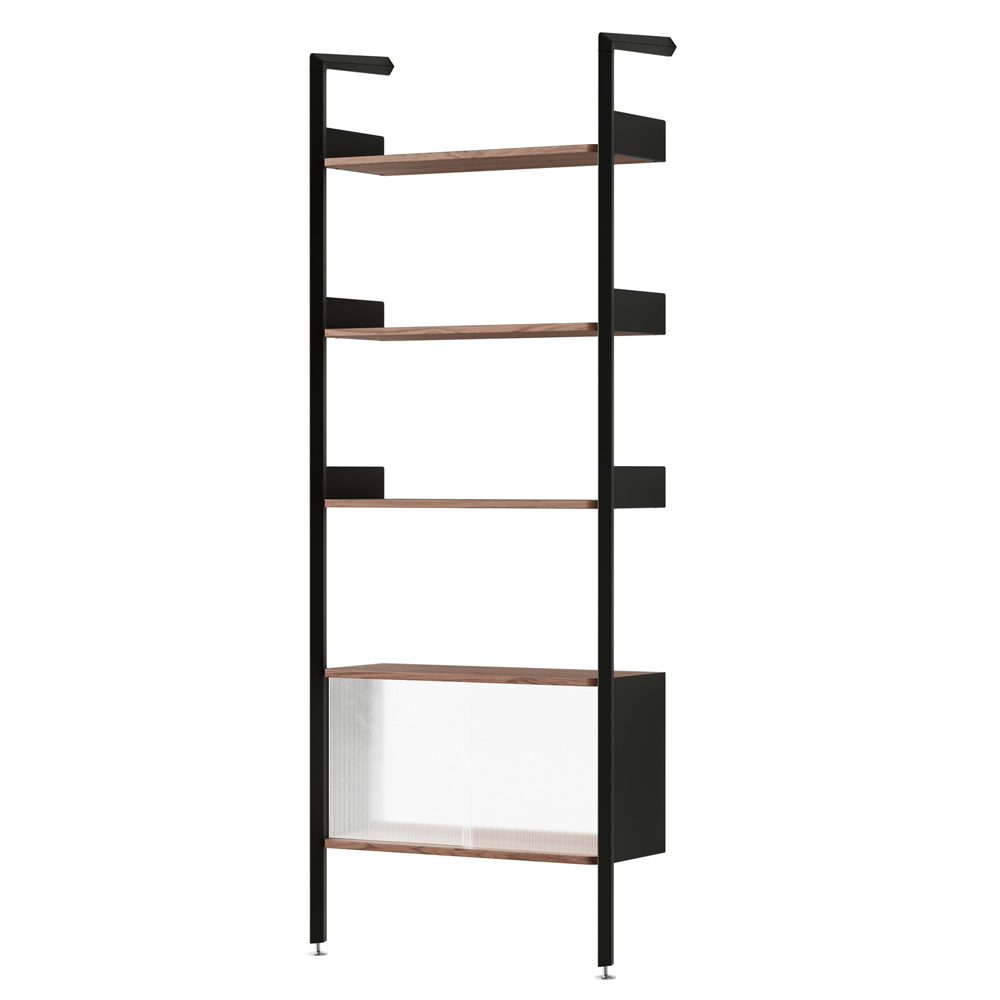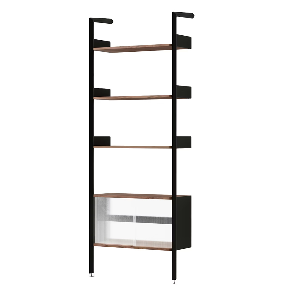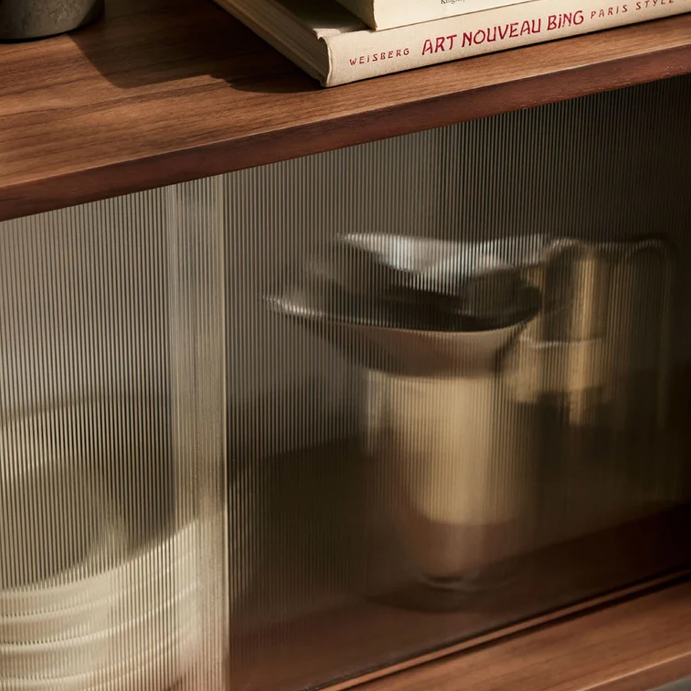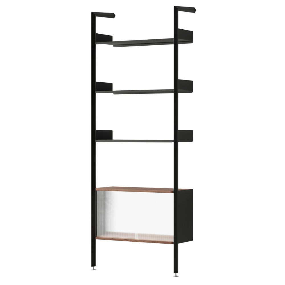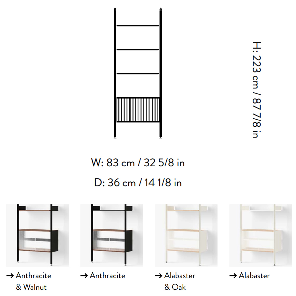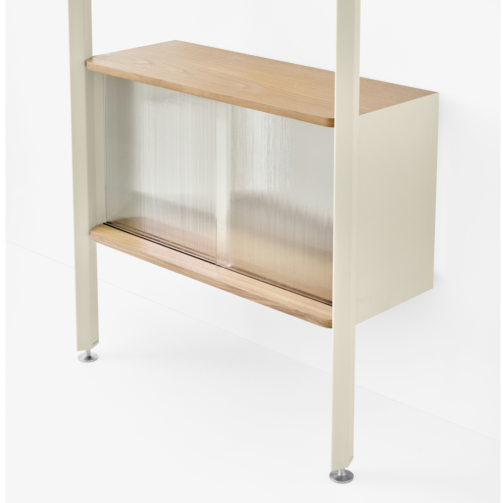 材質的選擇同樣精準而節制:擠型鋁合金構成骨幹,提供隱蔽而堅固的固定結構;層板與桌面以橡木或胡桃木貼皮呈現溫潤觸感;櫃體則搭配溝紋玻璃滑門,在半透明的朦朧層次之間,讓視線得以在展示與收納之間取得平衡。整體提供 Alabaster 白色與 Anthracite 深灰色兩種色彩方向,分別搭配相應的木皮細節,讓系統能自然融入不同調性的空間語境。