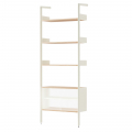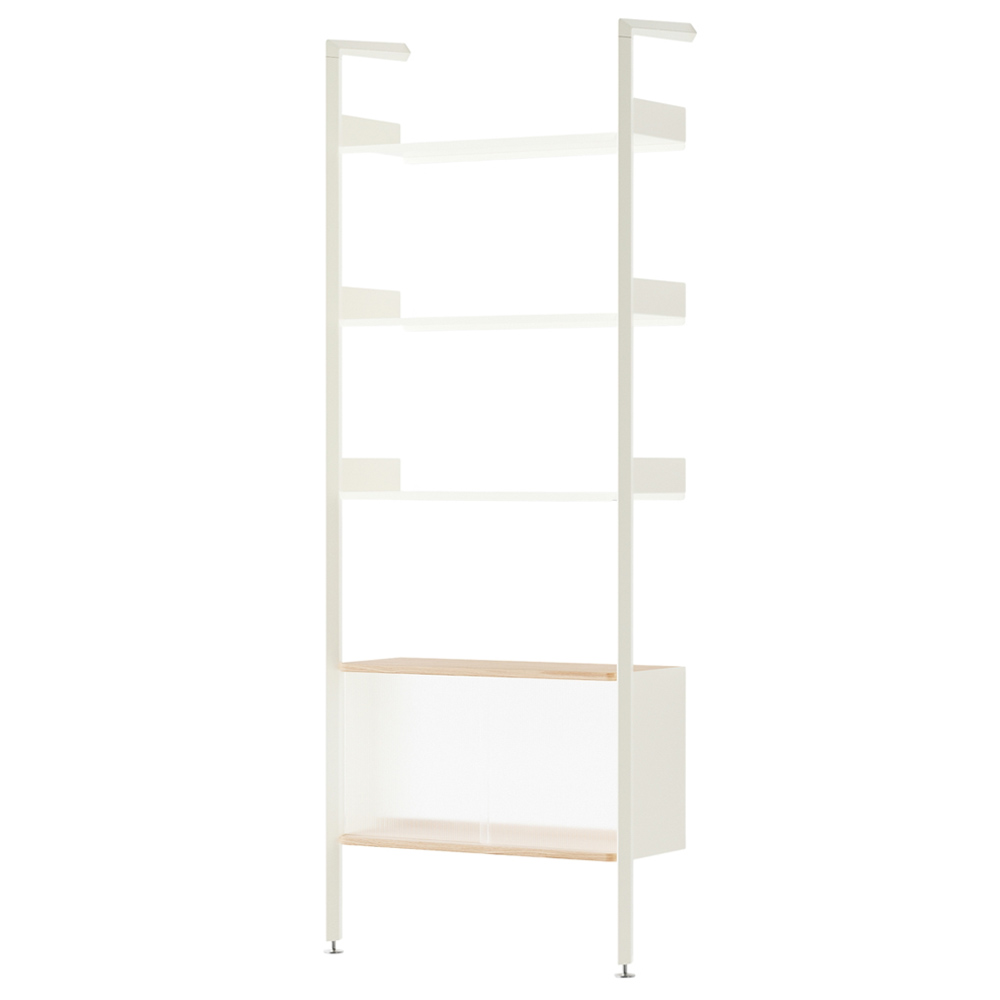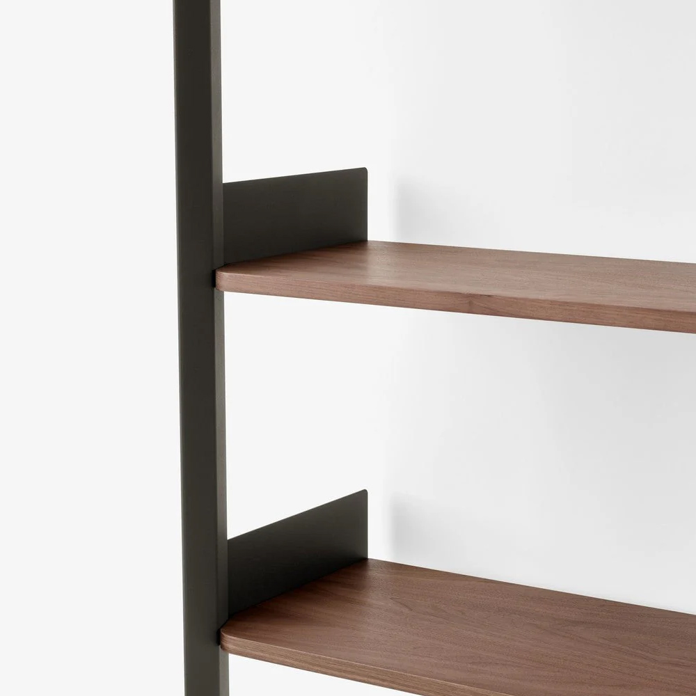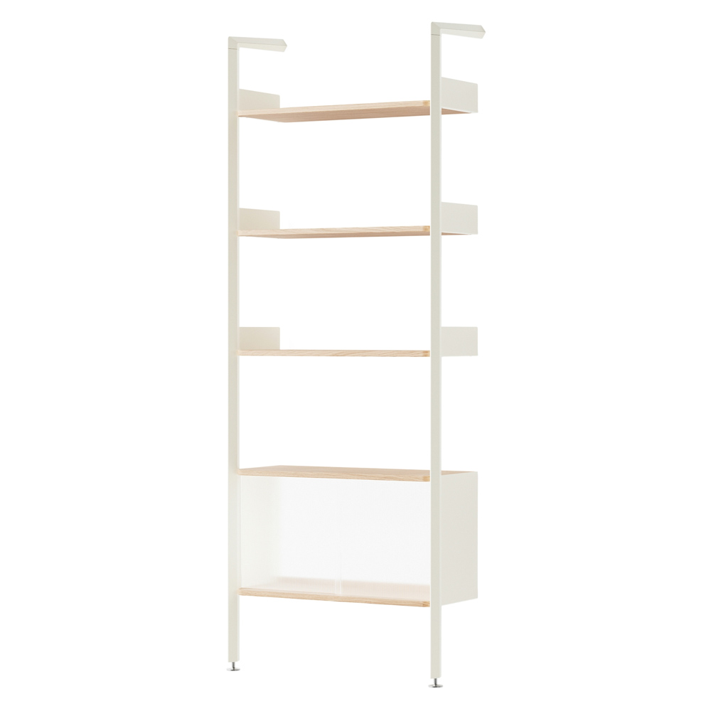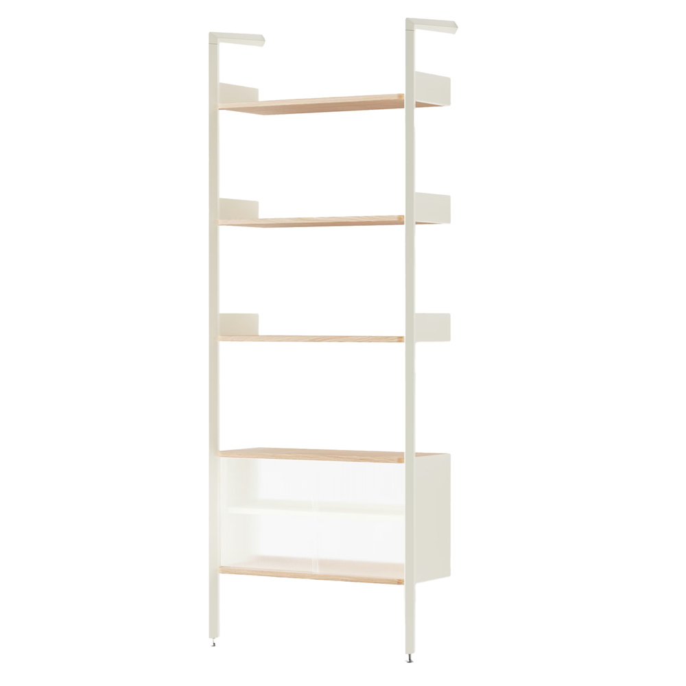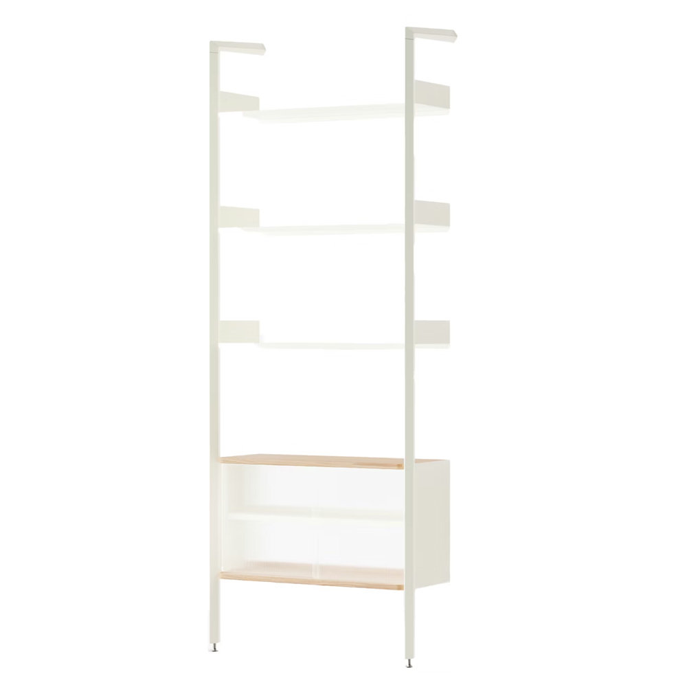材質的選擇同樣精準而節制:擠型鋁合金構成骨幹,提供隱蔽而堅固的固定結構;層板與桌面以橡木或胡桃木貼皮呈現溫潤觸感;櫃體則搭配溝紋玻璃滑門,在半透明的朦朧層次之間,讓視線得以在展示與收納之間取得平衡。整體提供 Alabaster 白色與 Anthracite 深灰色兩種色彩方向,分別搭配相應的木皮細節,讓系統能自然融入不同調性的空間語境。