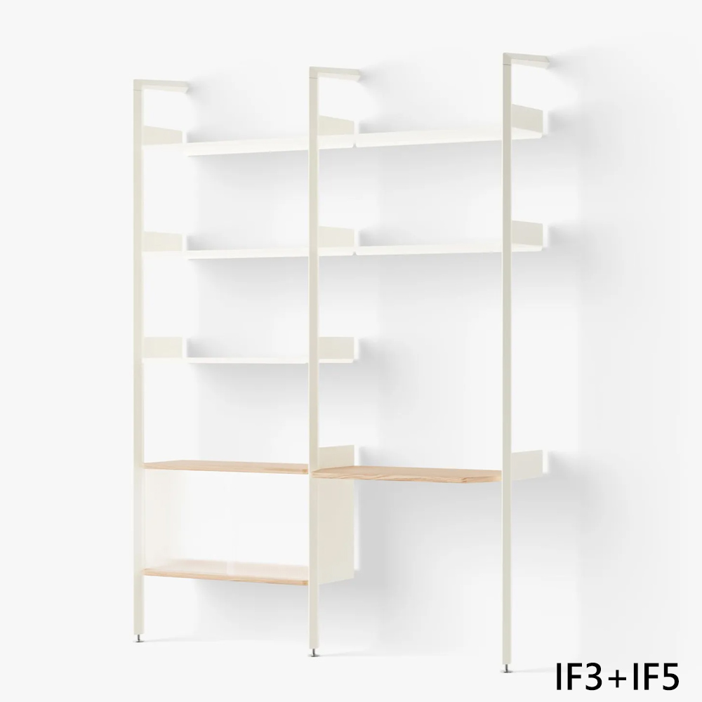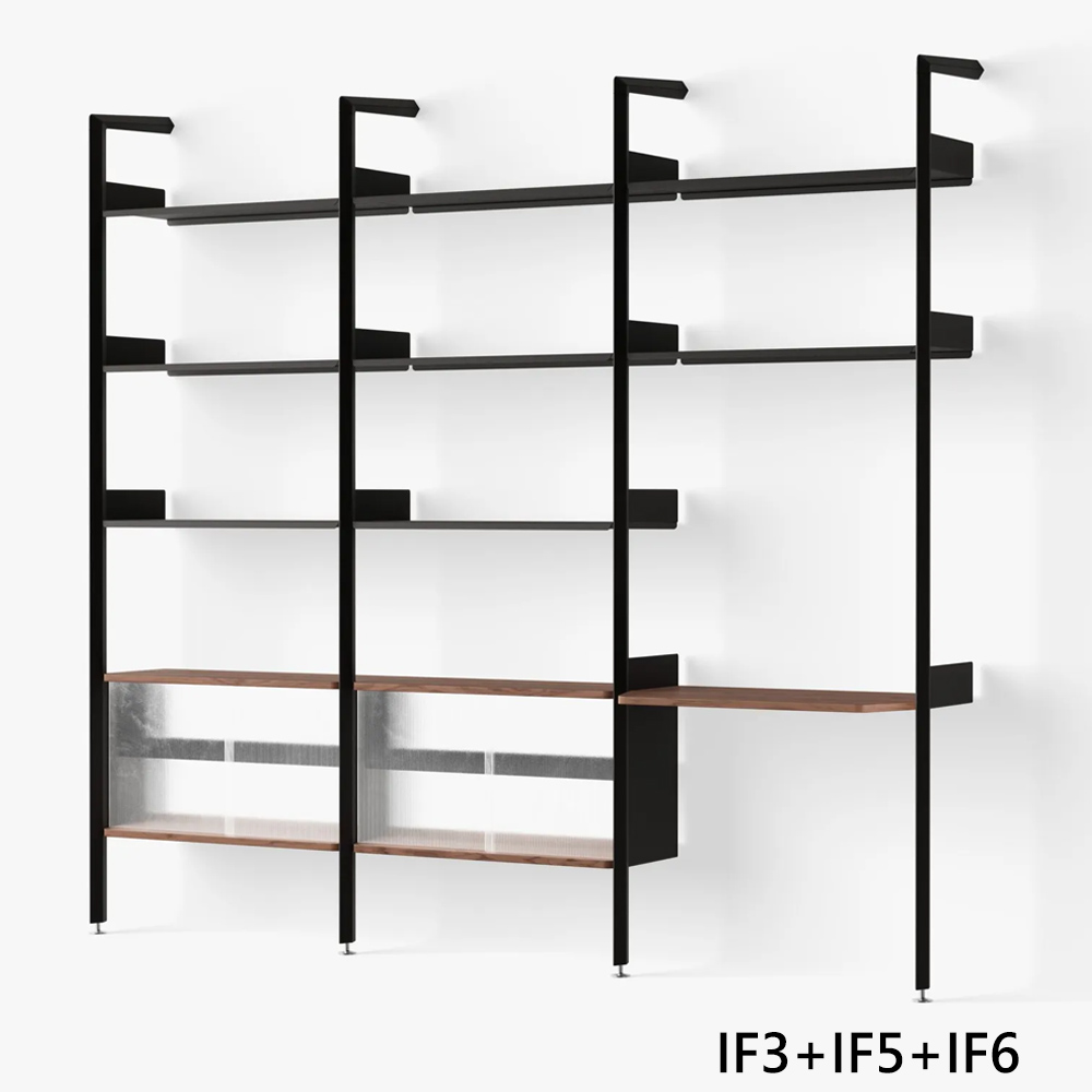 Industrial Facility 與 &Tradition 的合作,是品牌在產品譜系中的一次重要拓展。Industrial Facility 工作室以其冷靜精準的技術語彙聞名,在此專案中,他們以極克制的方式延展模組系統的潛力;Rombe 的 11 種核心配置,從單向、雙向到三向的基礎模組,再延伸出不同的層板、桌面與櫃體組合,使選擇過程清晰而直覺。其命名源自結構中垂直支架意外呈現的菱形輪廓一個非刻意而自然生成的形體,因適合承重、比例良好,而成為整體語言的一部分。