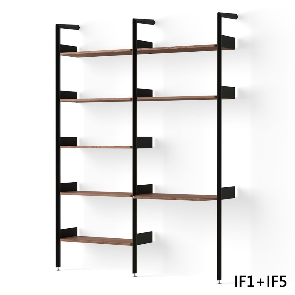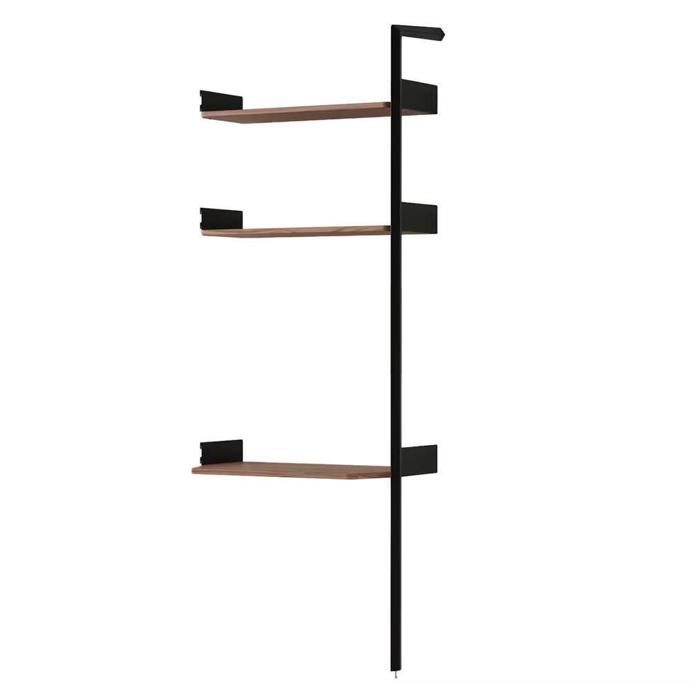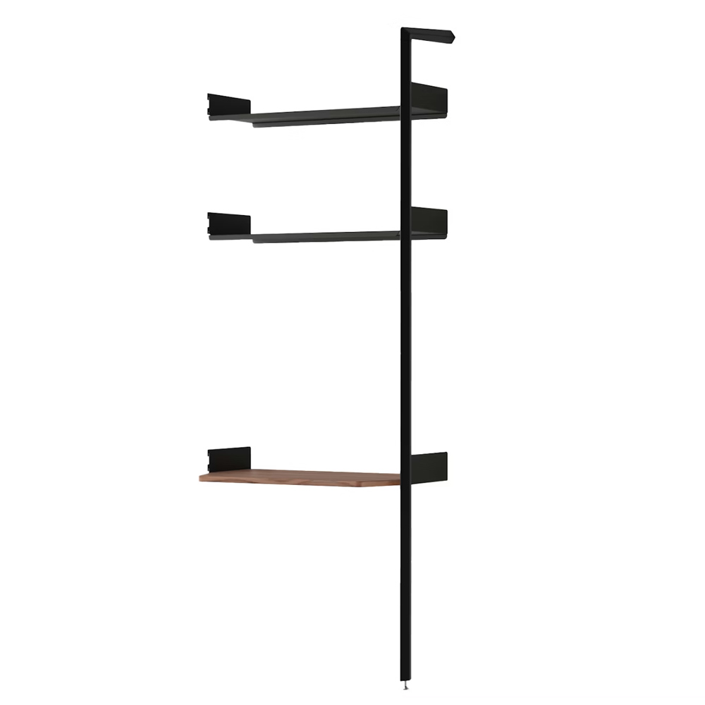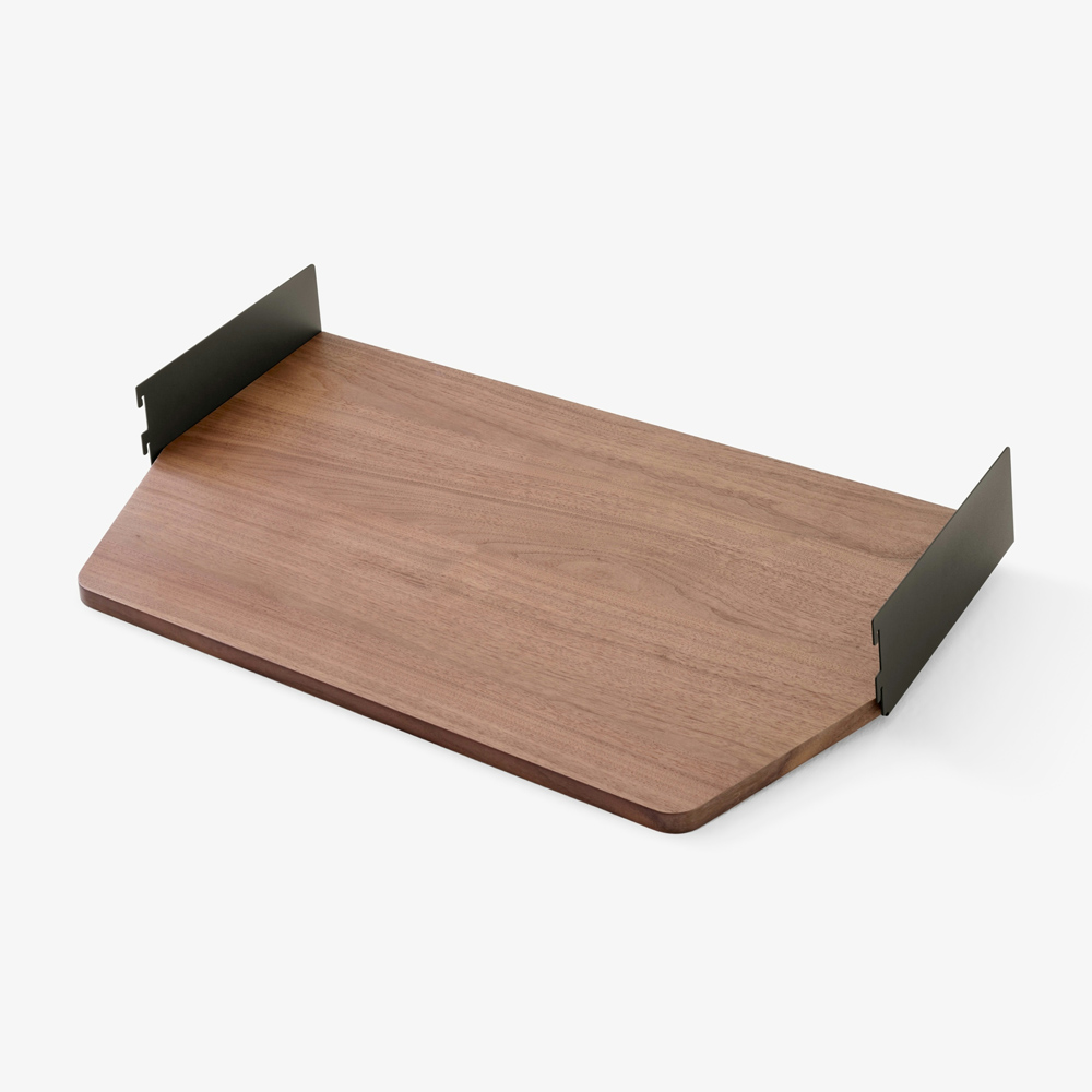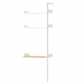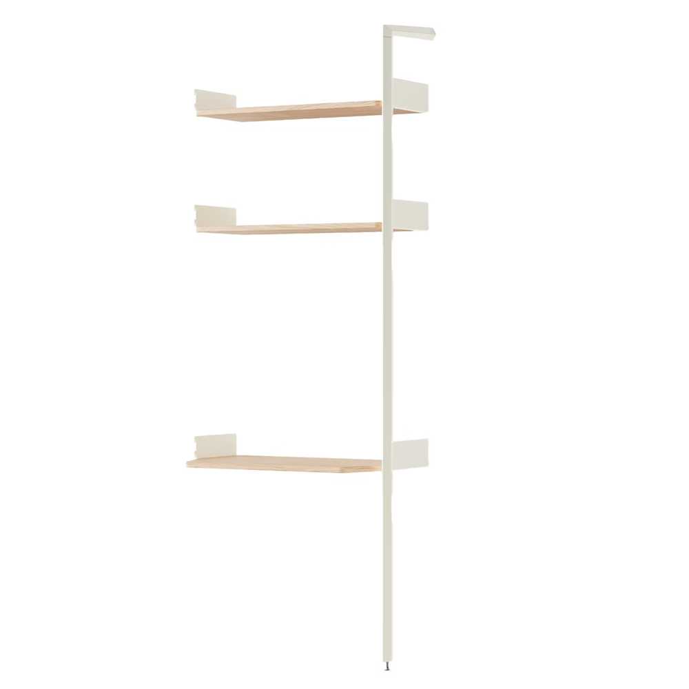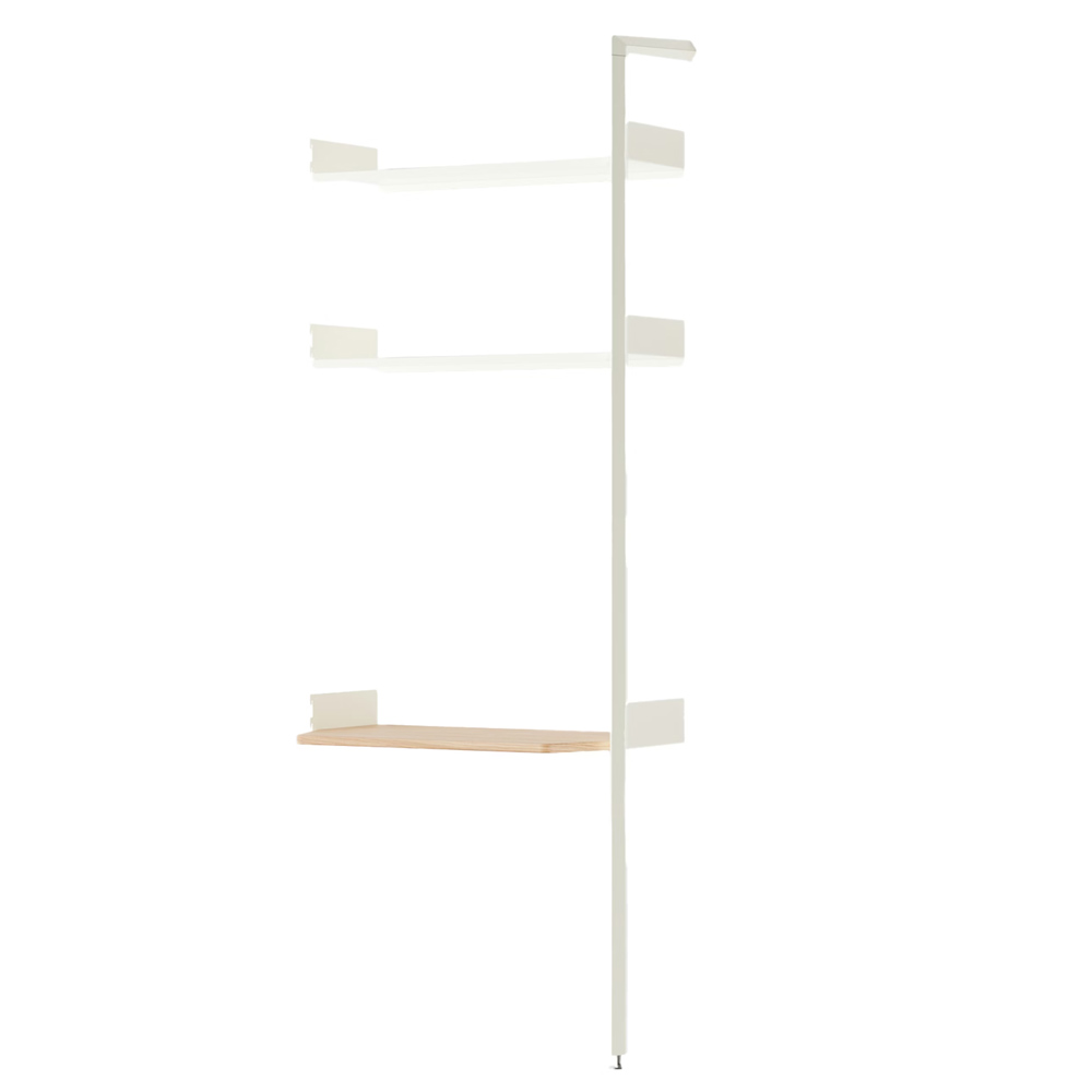 Rombe 安裝方式亦展現了 Industrial Facility 對細節的執著:整組系統僅以四個接點固定於牆面,兩個位於最上端的壁掛結構,另兩個隱藏在中段,使牆體保持乾淨完整。層板、桌面與櫃體則與直立支架連結,同時與牆面保持適度距離,不僅留出線材通道,也讓整體視覺更顯輕盈。無論是地坪微幅不平、牆面深度的差異,或多組 bay 串接後可能產生的偏移,Rombe 都能在安裝過程中以精準調節達成完美對齊。甚至連附上的六角扳手都有專屬收納空間,隱藏於支架內部,使後續拆裝或搬遷更為便利,也讓整個系統具備長期陪伴不同場域的可能性。