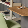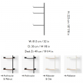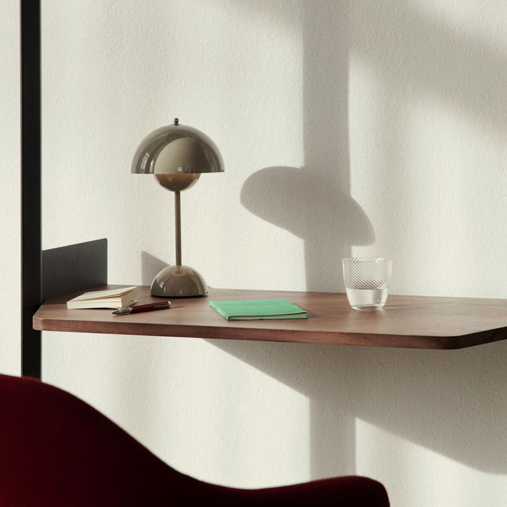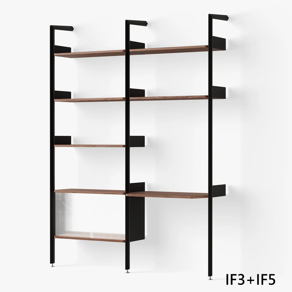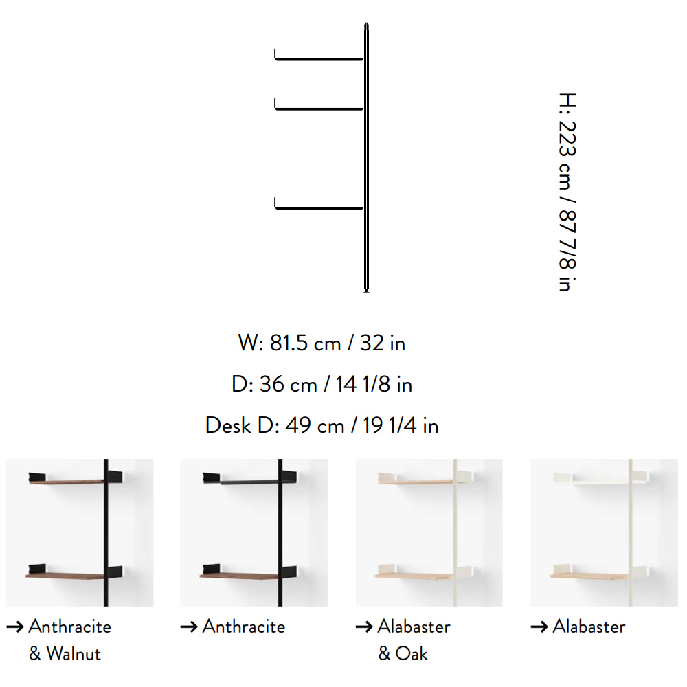 材質的選擇同樣精準而節制:擠型鋁合金構成骨幹,提供隱蔽而堅固的固定結構;層板與桌面以橡木或胡桃木貼皮呈現溫潤觸感;櫃體則搭配溝紋玻璃滑門,在半透明的朦朧層次之間,讓視線得以在展示與收納之間取得平衡。整體提供 Alabaster 白色與 Anthracite 深灰色兩種色彩方向,分別搭配相應的木皮細節,讓系統能自然融入不同調性的空間語境。