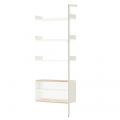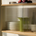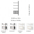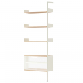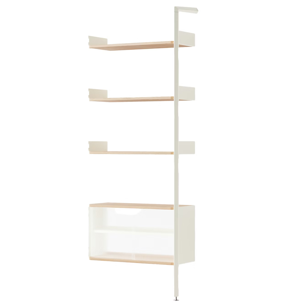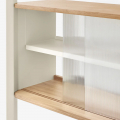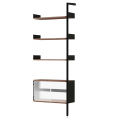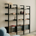 材質的選擇同樣精準而節制:擠型鋁合金構成骨幹,提供隱蔽而堅固的固定結構;層板與桌面以橡木或胡桃木貼皮呈現溫潤觸感;櫃體則搭配溝紋玻璃滑門,在半透明的朦朧層次之間,讓視線得以在展示與收納之間取得平衡。整體提供 Alabaster 白色與 Anthracite 深灰色兩種色彩方向,分別搭配相應的木皮細節,讓系統能自然融入不同調性的空間語境。