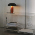 燈體以鋼材製成,將桌燈的三個基本元素燈罩、燈桿與底座簡化並重新組構,使各部分在視覺上彼此獨立,卻又維持精準的平衡關係。弧形燈罩如同懸浮於空中,帶來輕盈而動態的視覺效果;平坦的底座則成為整體唯一的支點,賦予結構穩定性。不同幾何形體之間相互呼應,形成和諧而富張力的比例構成。