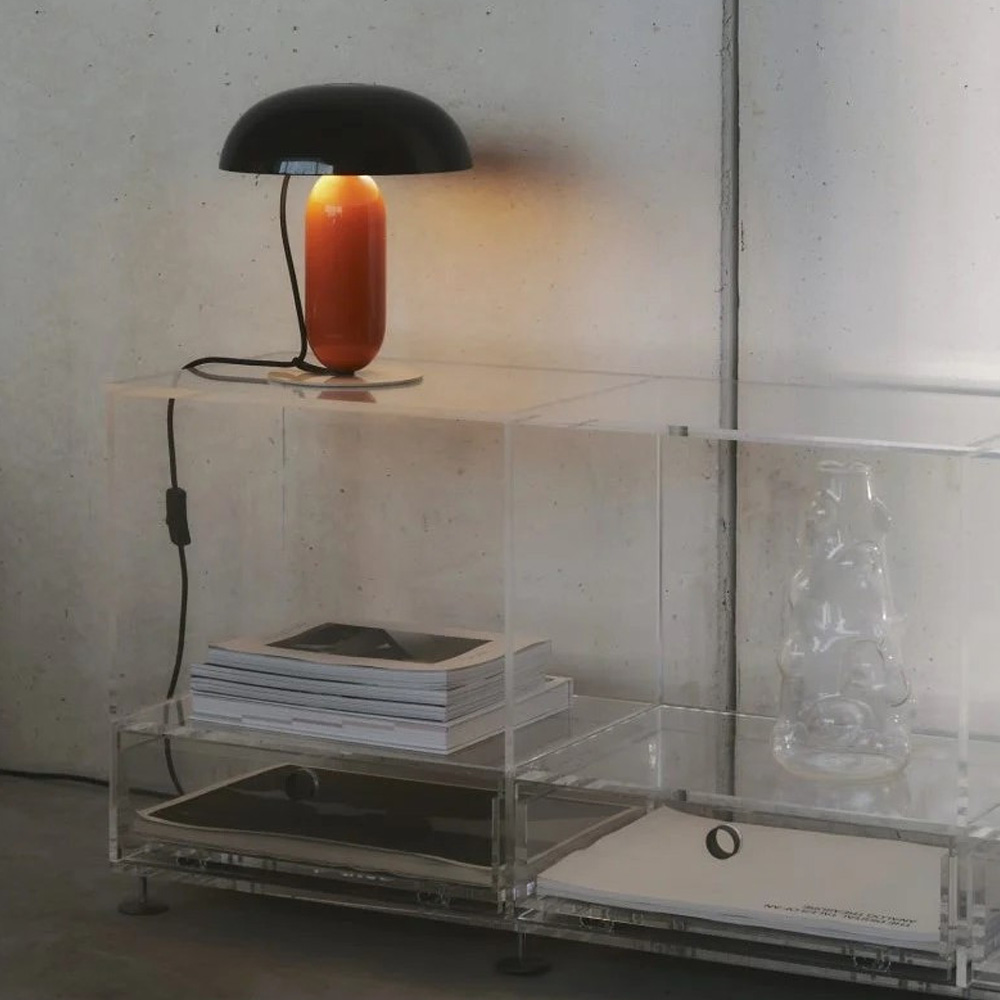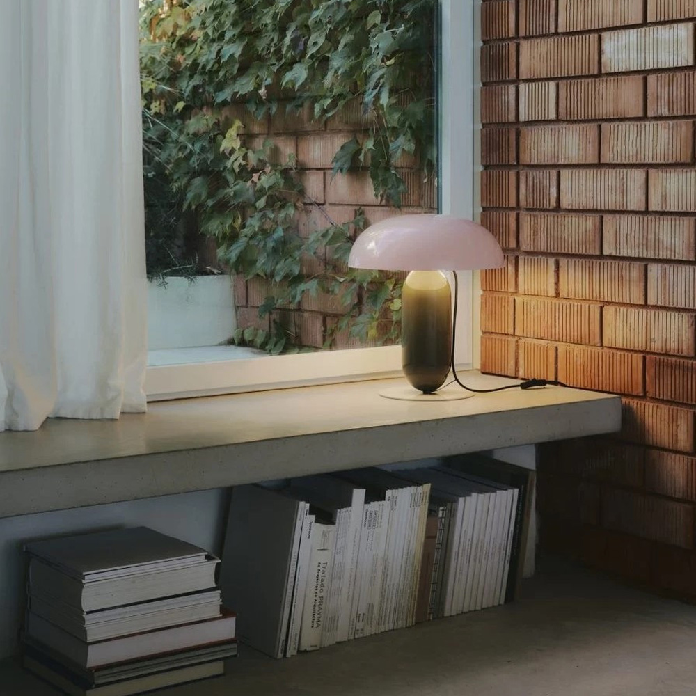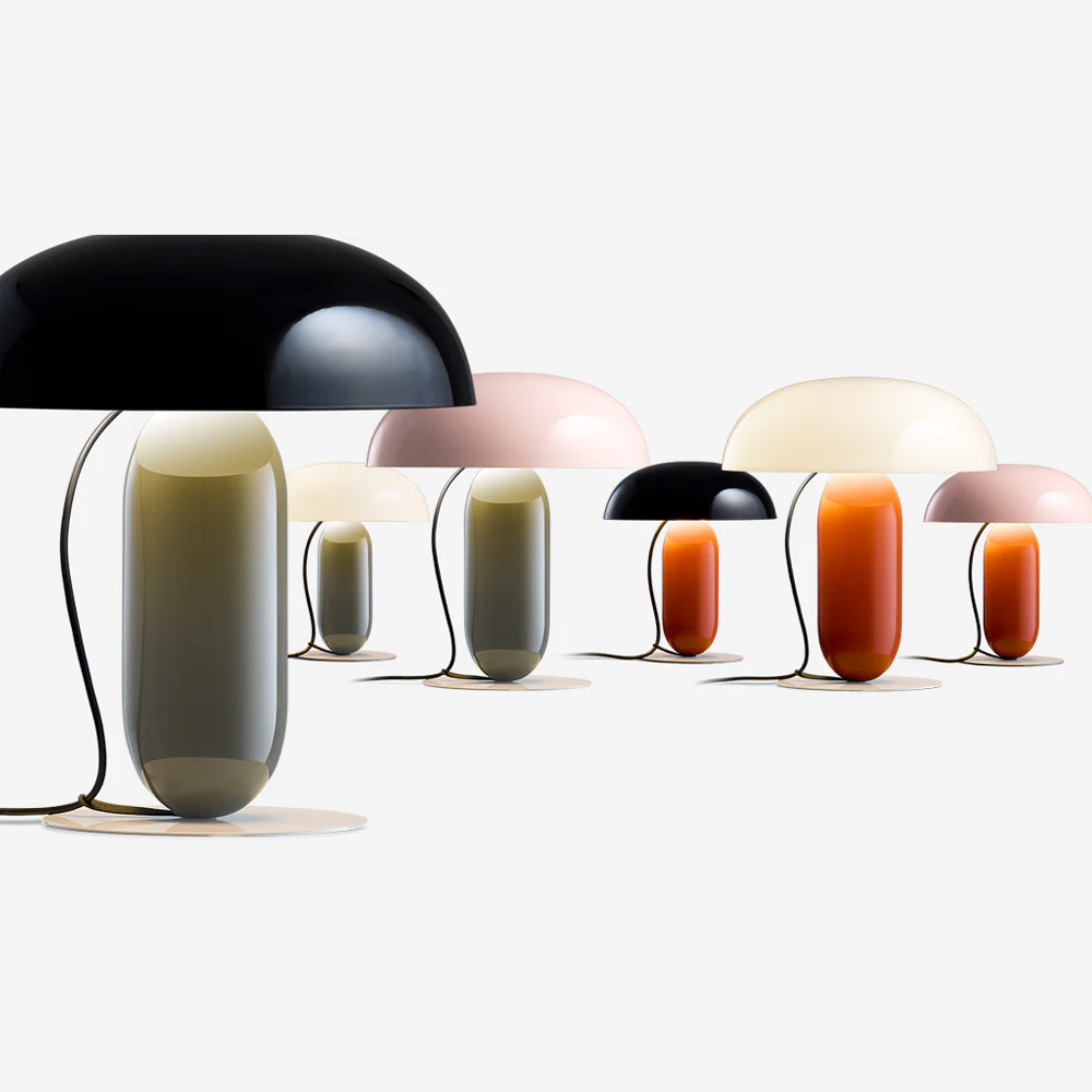 Gambosa 的設計魅力同樣來自其精心配置的配色方案。燈罩提供淡粉色或黑色的不透明版本,呈現明確集中的光線效果,亦可選擇乳白色甲基丙烯酸材質,營造更柔和的漫射光感。燈桿提供橘色與苔蘚灰選項,底座則為石灰灰色。多樣色彩組合構成完整的系列矩陣,從內斂低調到鮮明表現皆有對應版本。