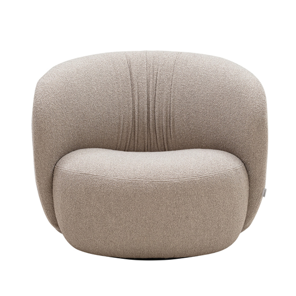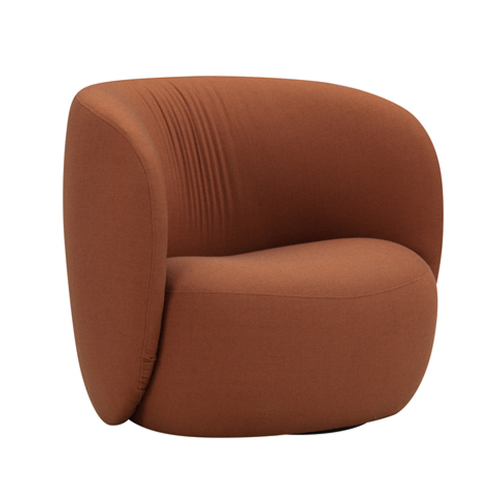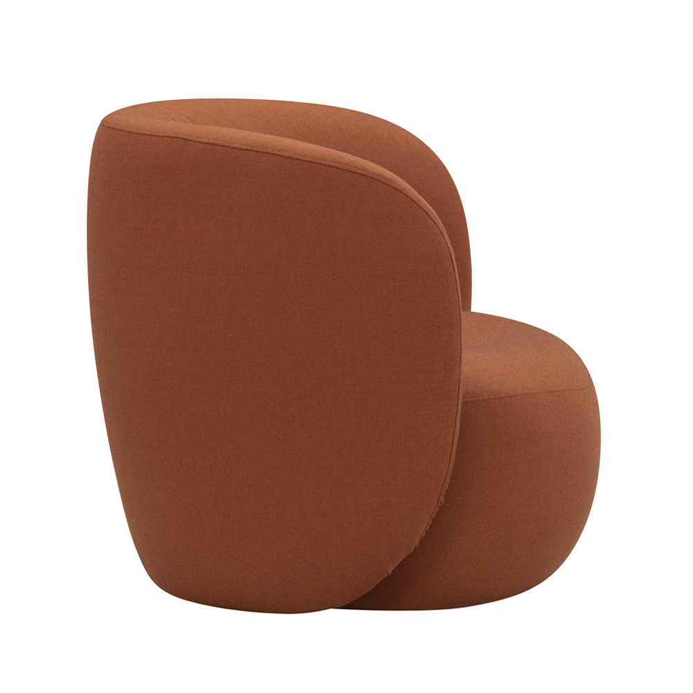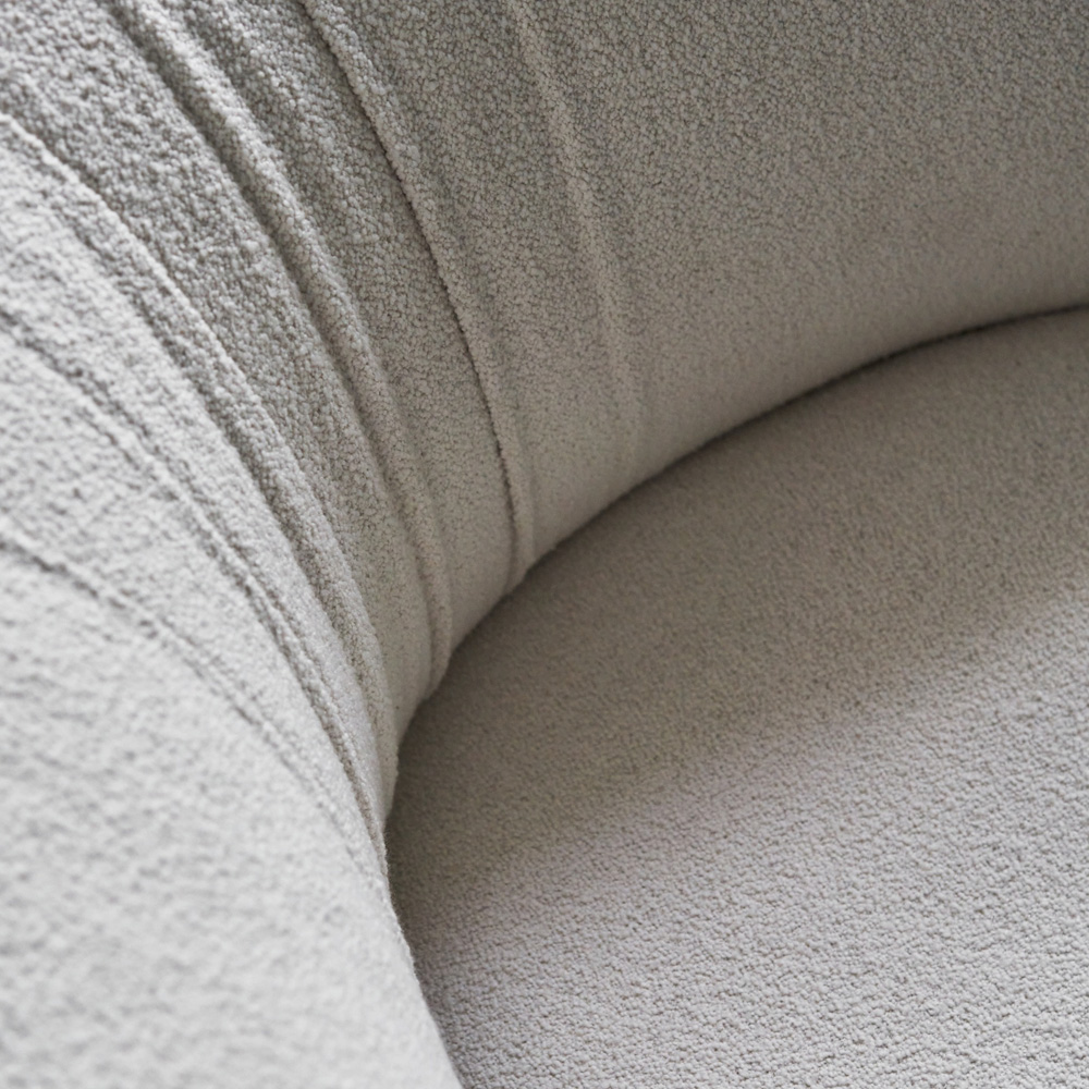 設計靈感來自 Ovata 樹葉的包覆輪廓,椅身以豐厚坐墊構成,線條圓潤且富有張力。隱藏式橡木底座使視覺焦點完全落在座椅本體,突顯布料與形體的豐富表情。坐感上,柔軟的襯墊自然承托身體曲線,提供放鬆且穩定的支撐感受。