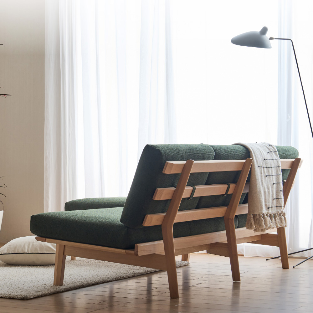 沙發背面使用厚實的天然木材,成為低調卻有存在感的設計亮點,讓整體看起來簡約又有型。