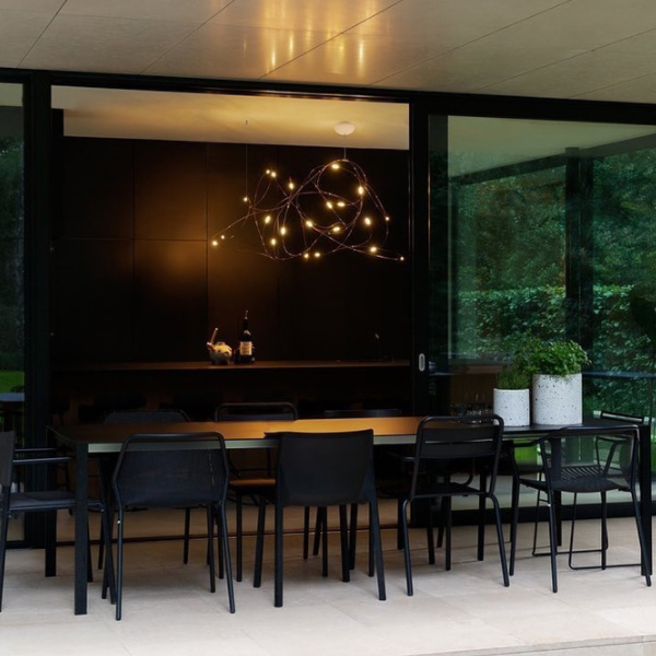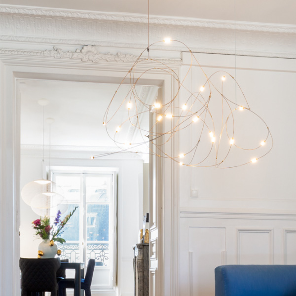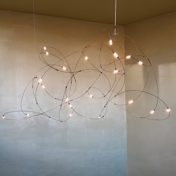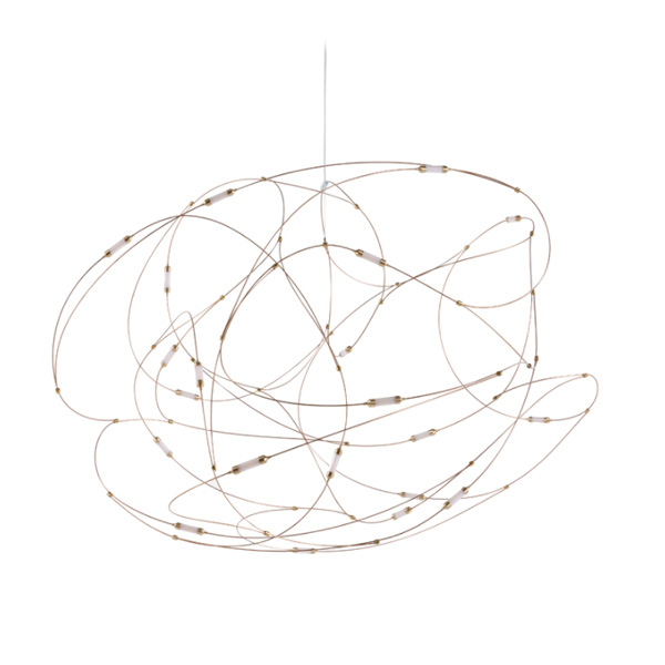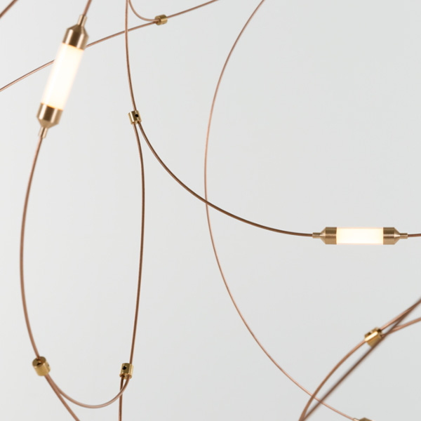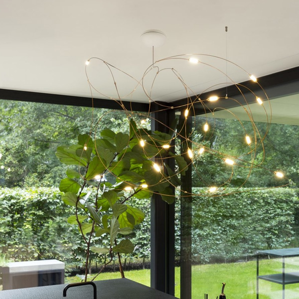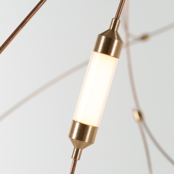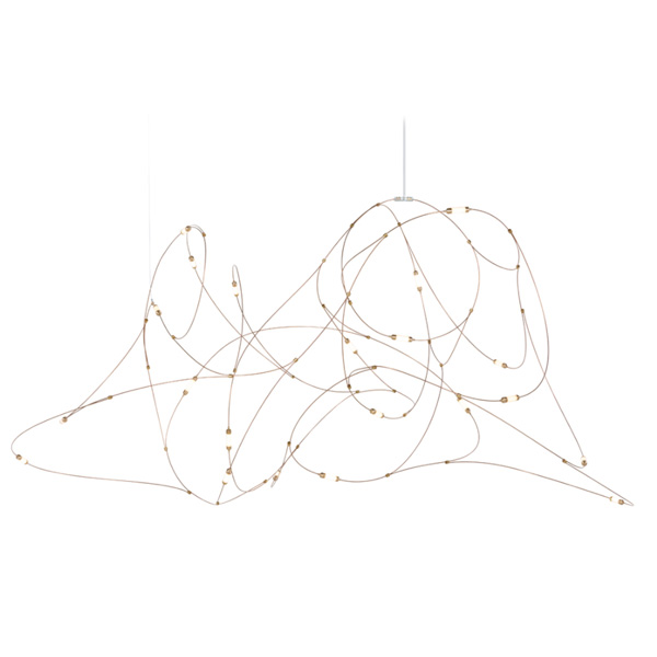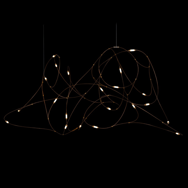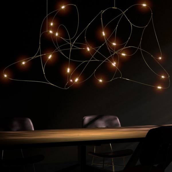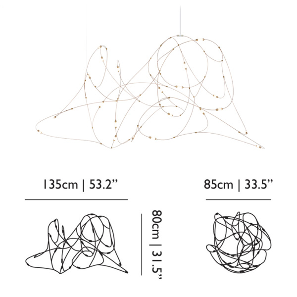 「Flock of Light」最初是由著名設計組合 Studio Toer 替荷蘭表演藝術中心(Theater Aan de Slinger)所創作的大型群光藝術裝置,以記憶中的夏夜螢火蟲為靈感,結合專屬技術 - 金屬傳導電流誘發 LED 光源,使流光溢彩的穿梭軌跡完美具象化。「Flock of Light」吊燈運用纖幼銅線縈繞出二種尺寸,自然呈現輕盈的穿透感,白日不開燈時懸掛於居家,即是一座渾然天成的抽象藝術品;當夜幕降臨,點點螢光靜謐地為空間營造出溫暖的詩意氛圍。
