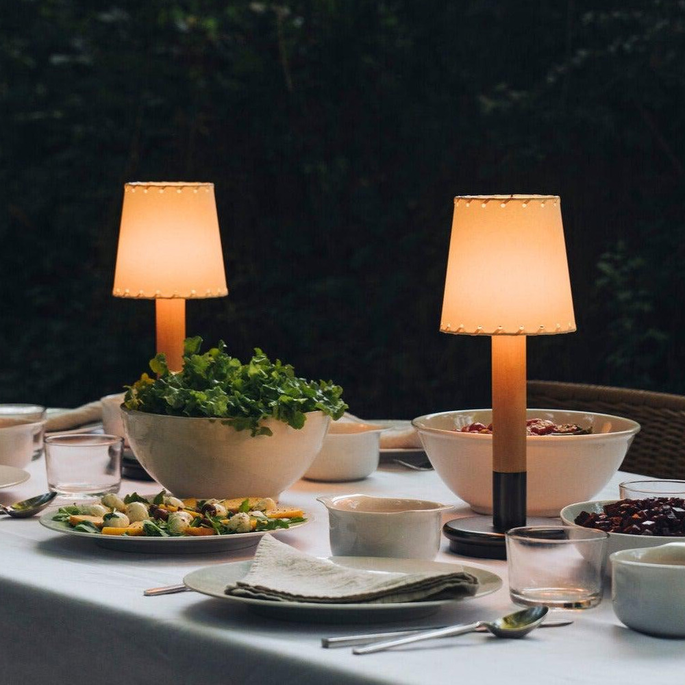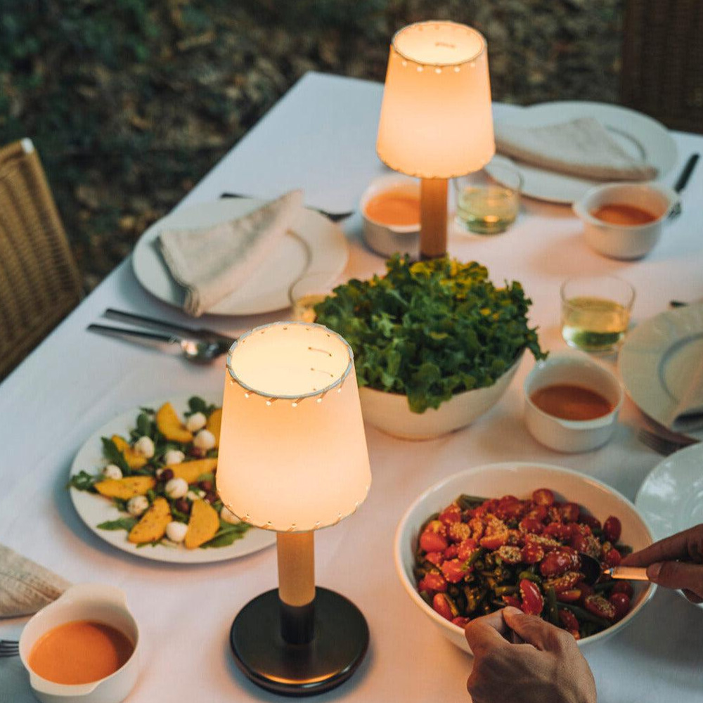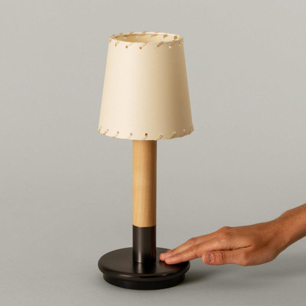 Batería 版本採用觸控式操作,輕觸即可開關並調整兩段亮度,直覺又便利。內建電池設計讓燈具不受電源限制,適合擺放於餐桌、床邊、露台或半戶外空間,亦可多盞搭配使用,形成層次分明的光環境。隨附接觸式充電器,充電時間約 5 小時,兼顧美感、實用性與高度靈活的使用情境。