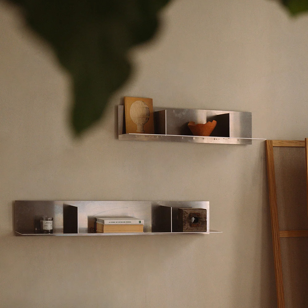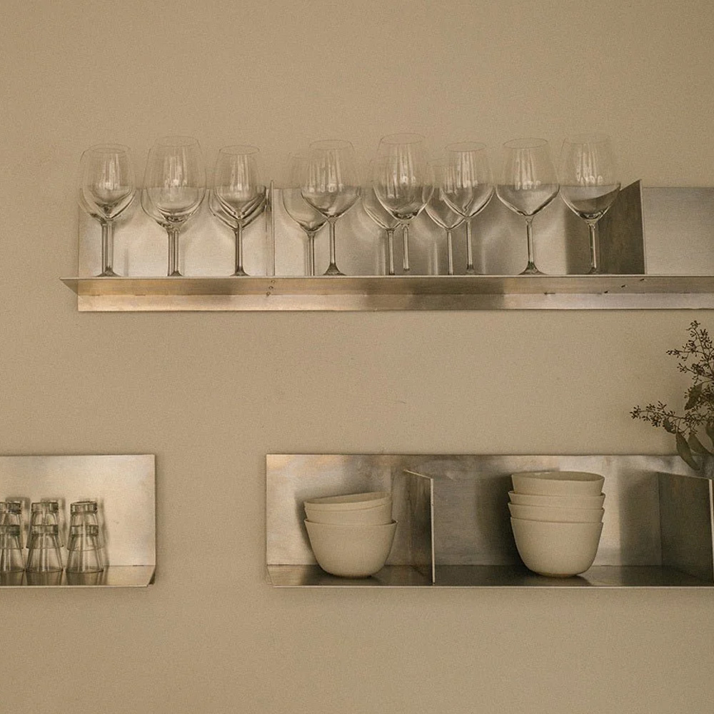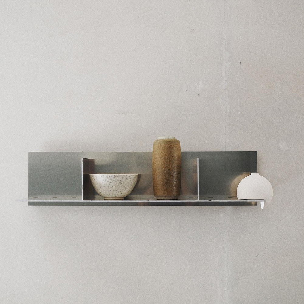 Rivet 系列由設計師 Jonas Trampedach 設計,整體以雷射切割鋁板製成,並透過手工敲擊方式將各部件固定組裝。俐落的幾何輪廓結合金屬板材的結構語言,形塑出低調而純粹的工業風格,使層架在空間中呈現清晰的存在感。