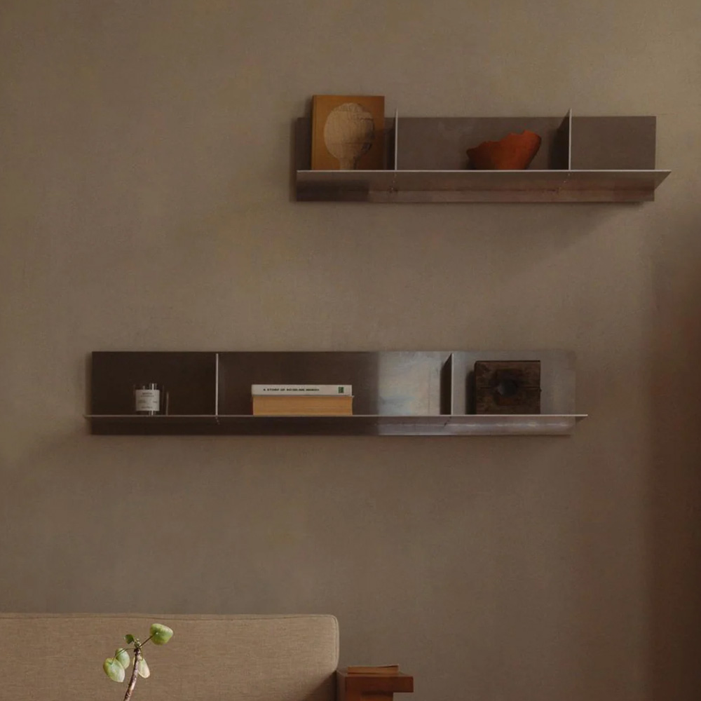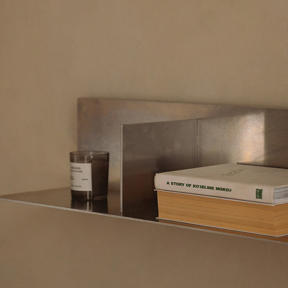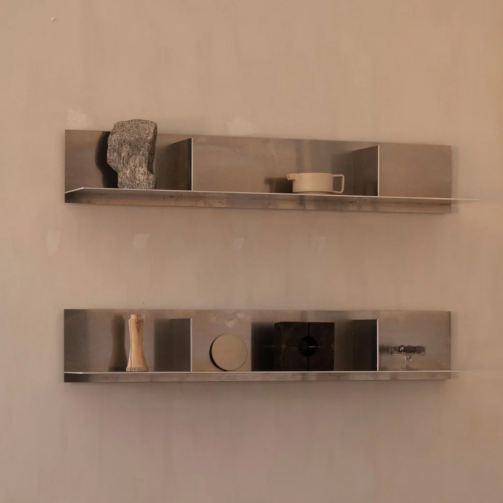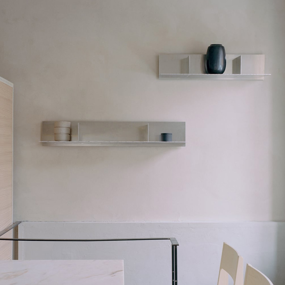未經塗裝的原色鋁材表面會隨時間自然氧化,逐漸形成層次豐富的色澤變化,細微刮痕與色差則成為材質表現的一部分,為每一件 Rivet 壁掛層架累積獨特的時間痕跡,展現 FRAMA 一貫重視真實材質與長久使用價值的設計精神。