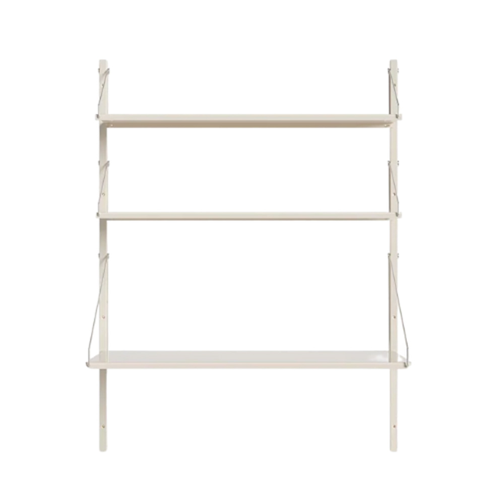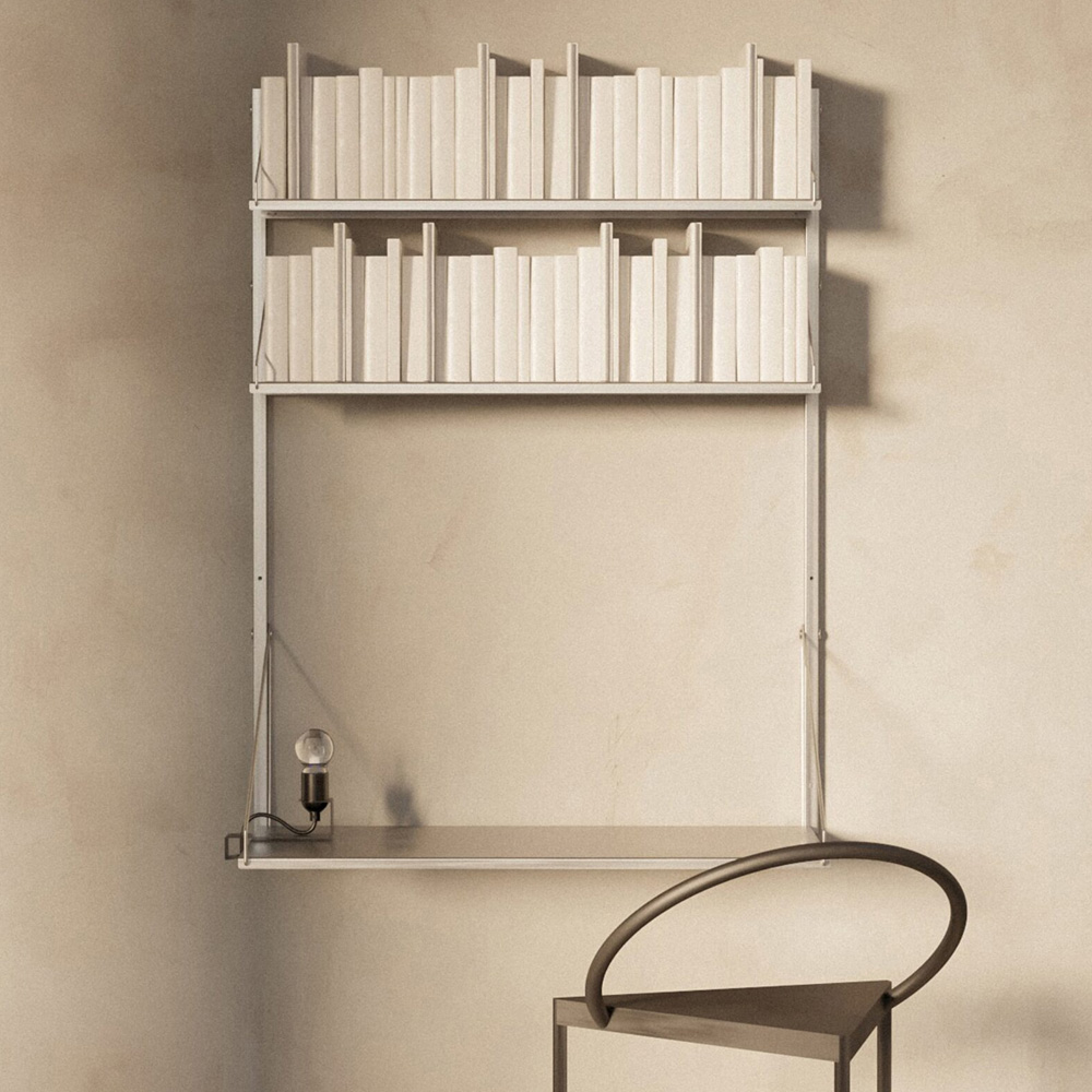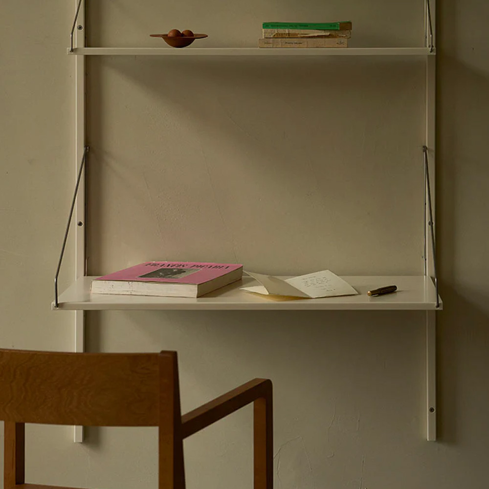 FRAMA Shelf Library 壁掛層架系統由丹麥設計師 Kim Richardt 設計,結合層板、金屬結構與其他功能組件,呈現一套高度模組化、可長期使用的收納解決方案。層板與桌板透過裝飾性鋼製螺絲與支架固定於立柱軌道上,在結構穩定之餘,也成為視覺語彙的一部分。