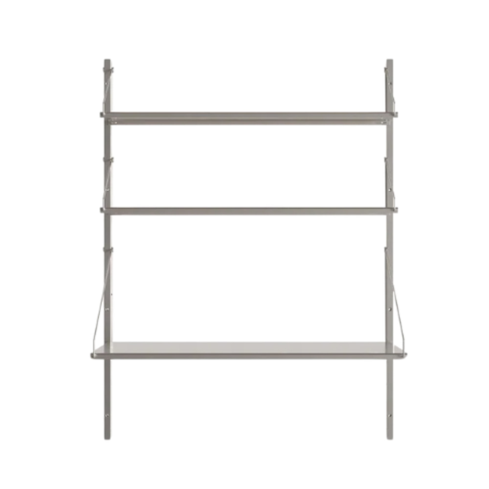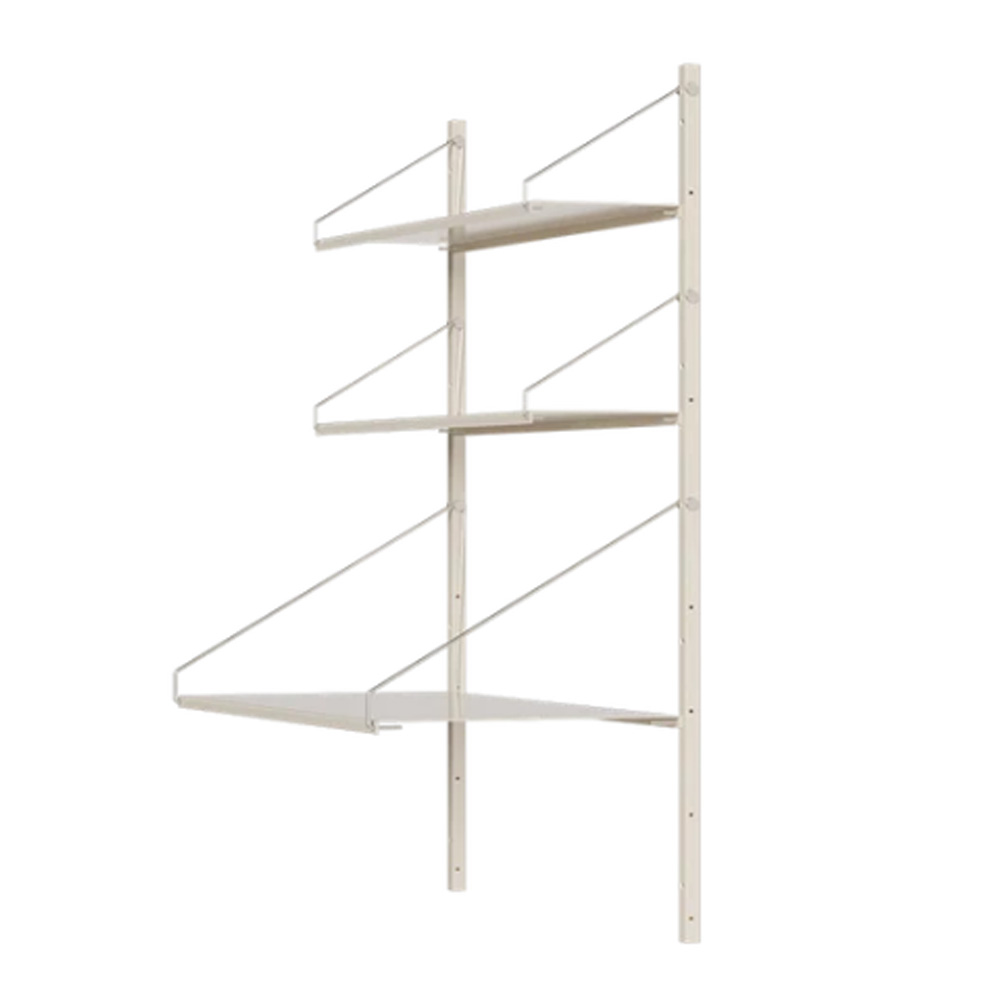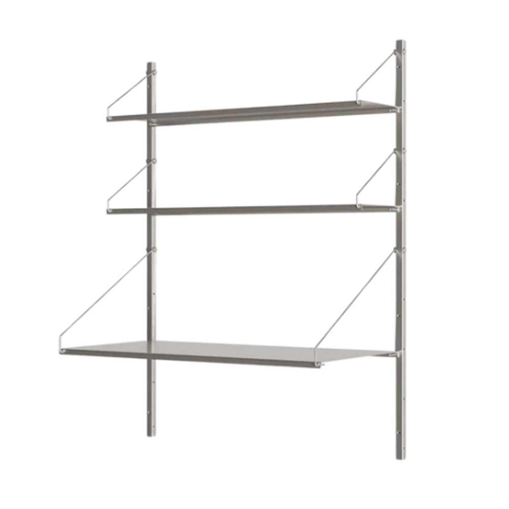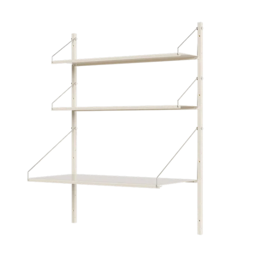 FRAMA Shelf Library 壁掛層架系統由丹麥設計師 Kim Richardt 設計,結合層板、金屬結構與其他功能組件,呈現一套高度模組化、可長期使用的收納解決方案。層板與桌板透過裝飾性鋼製螺絲與支架固定於立柱軌道上,在結構穩定之餘,也成為視覺語彙的一部分。