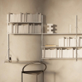 Frama Library 的層板皆可依需求在垂直架上自由調整位置,使用者可隨空間變化重新配置,並搭配不同加購模組進行擴充。這樣的設計使系統能靈活應用於廚房、客廳、工作室或辦公空間,同時回應實際收納與展示需求。