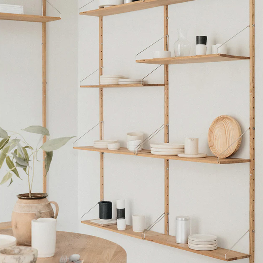 Frama Library 的層板皆可依需求在垂直架上自由調整位置,使用者可隨空間變化重新配置,並搭配不同加購模組進行擴充。這樣的設計使系統能靈活應用於廚房、客廳、工作室或辦公空間,同時回應實際收納與展示需求。