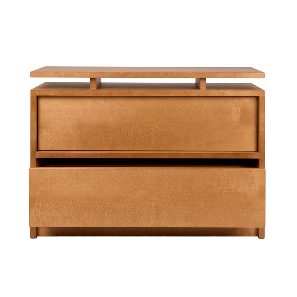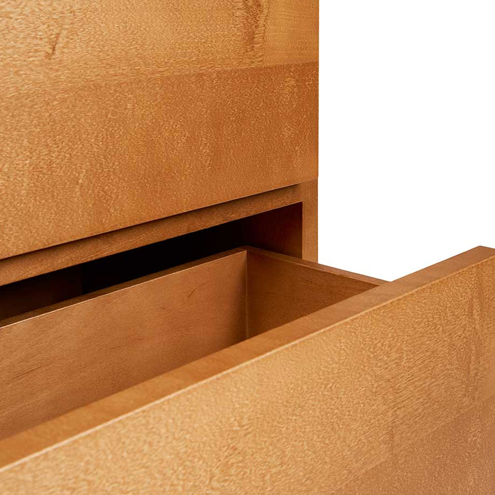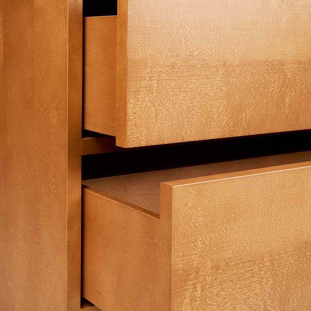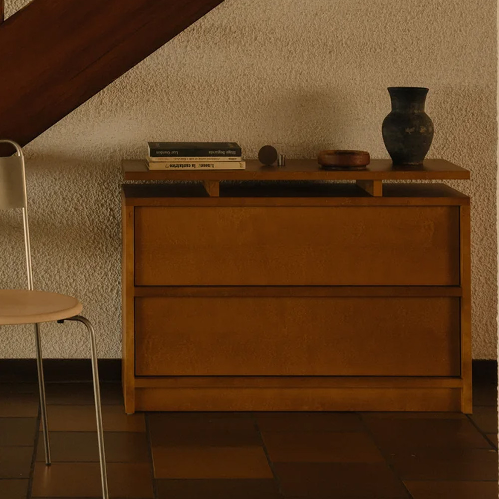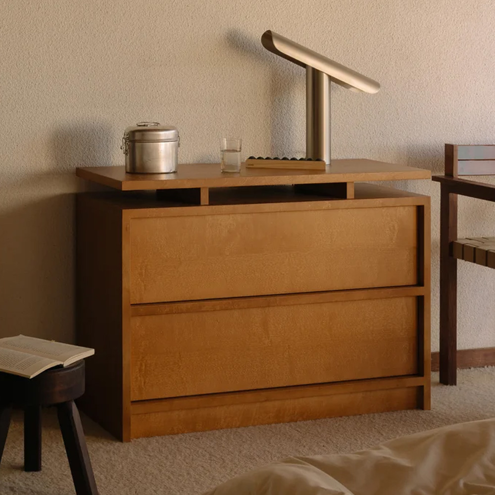 抽屜櫃以寬幅的水平線條作為主要設計語言,放大櫃體正面的木紋表現,讓材質本身成為視覺重點。櫃體由 MDF、樺木貼皮與實木樺木製成,整體採暖棕色調處理,木紋走向一致且連續,清楚展現樺木自然且溫潤的質感,強化家具與空間之間的材料關係。