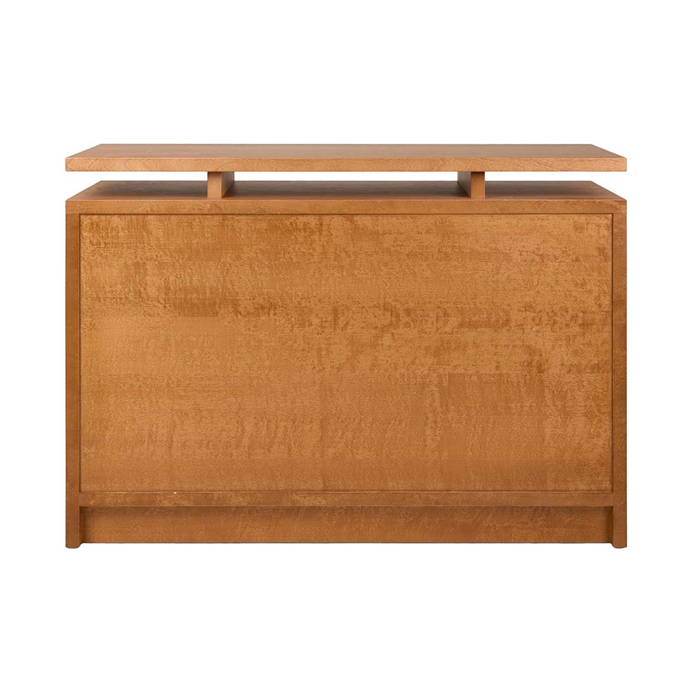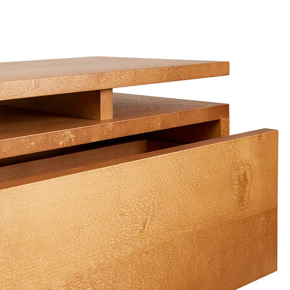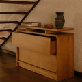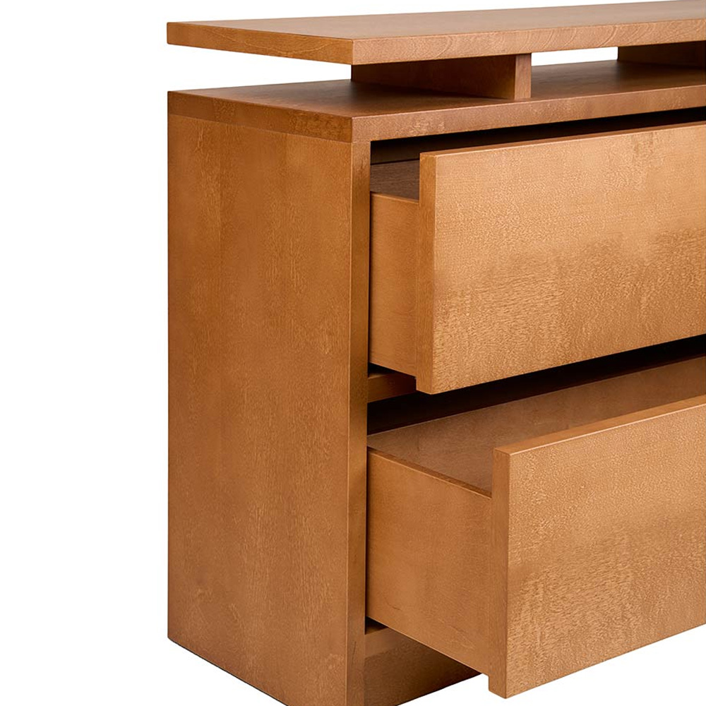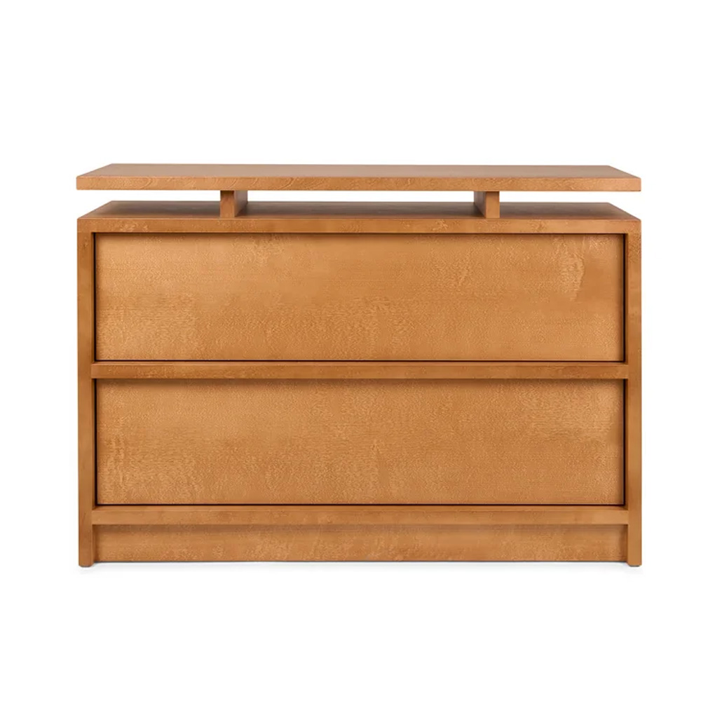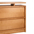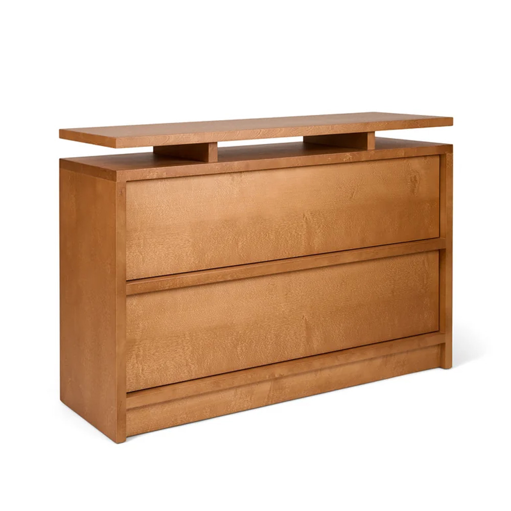 抽屜櫃以寬幅的水平線條作為主要設計語言,放大櫃體正面的木紋表現,讓材質本身成為視覺重點。櫃體由 MDF、樺木貼皮與實木樺木製成,整體採暖棕色調處理,木紋走向一致且連續,清楚展現樺木自然且溫潤的質感,強化家具與空間之間的材料關係。