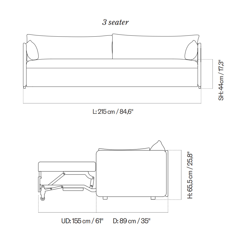 三人座款: 寬215 x 深89/155 x 高65.5 /坐高44 cm