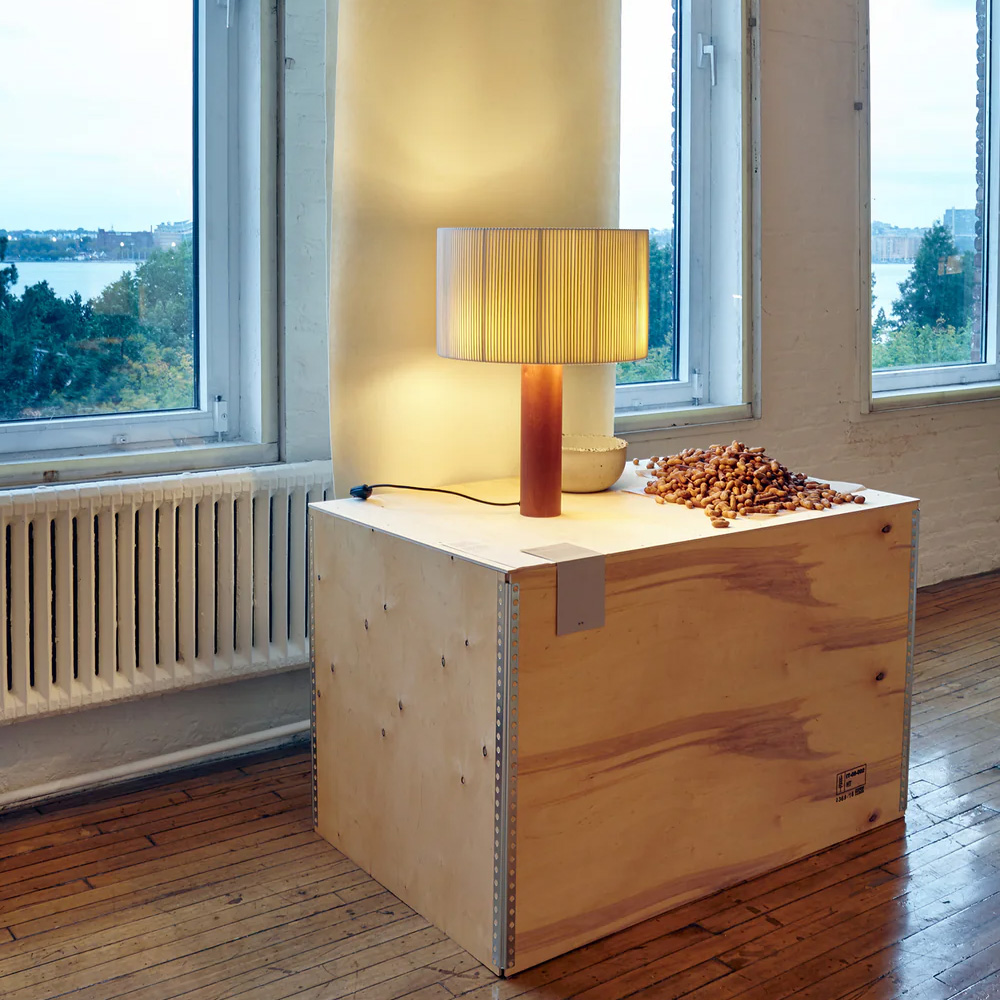 燈罩採用白色棉質織帶製成,呈現如手風琴般的摺疊結構,邊緣以細緻布邊收束,其材質靈感來自書籍裝幀常用的布帶。這種結構在點亮時形成微妙的不對稱光影層次,使光線在摺痕之間自然流動,帶來柔和而富表情的視覺效果。