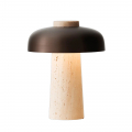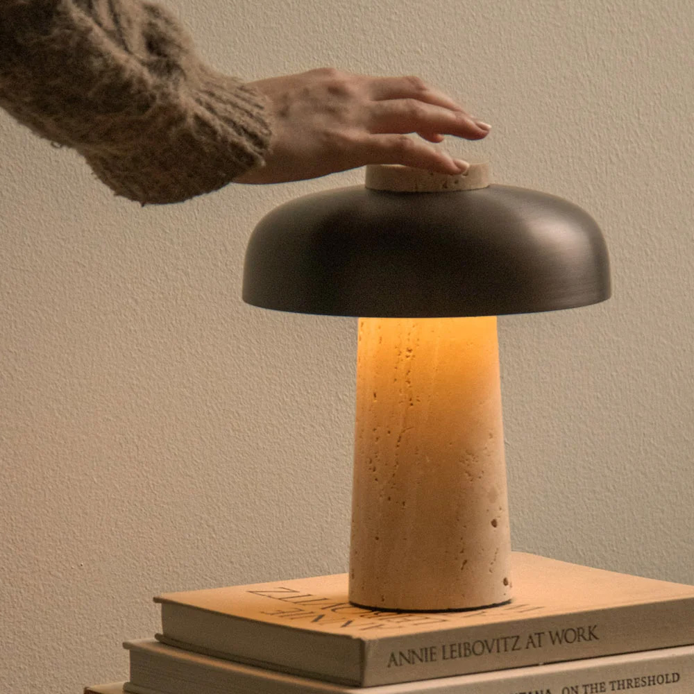 燈體底座以未經處理的天然洞石製成,保留自然紋理與細微不規則表面,使每件作品都呈現獨特質感。上方搭配弧形青銅色鋁製燈罩,表面經細緻拋光處理,與粗獷石材形成鮮明對比。中央的乳白色擴散罩則柔化光線,營造均勻而溫潤的照明氛圍。