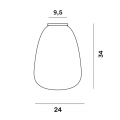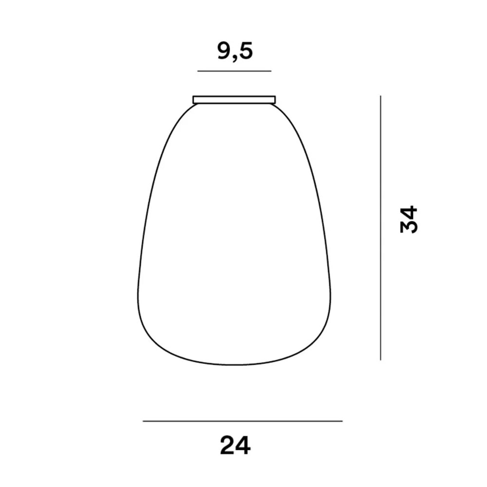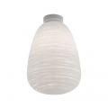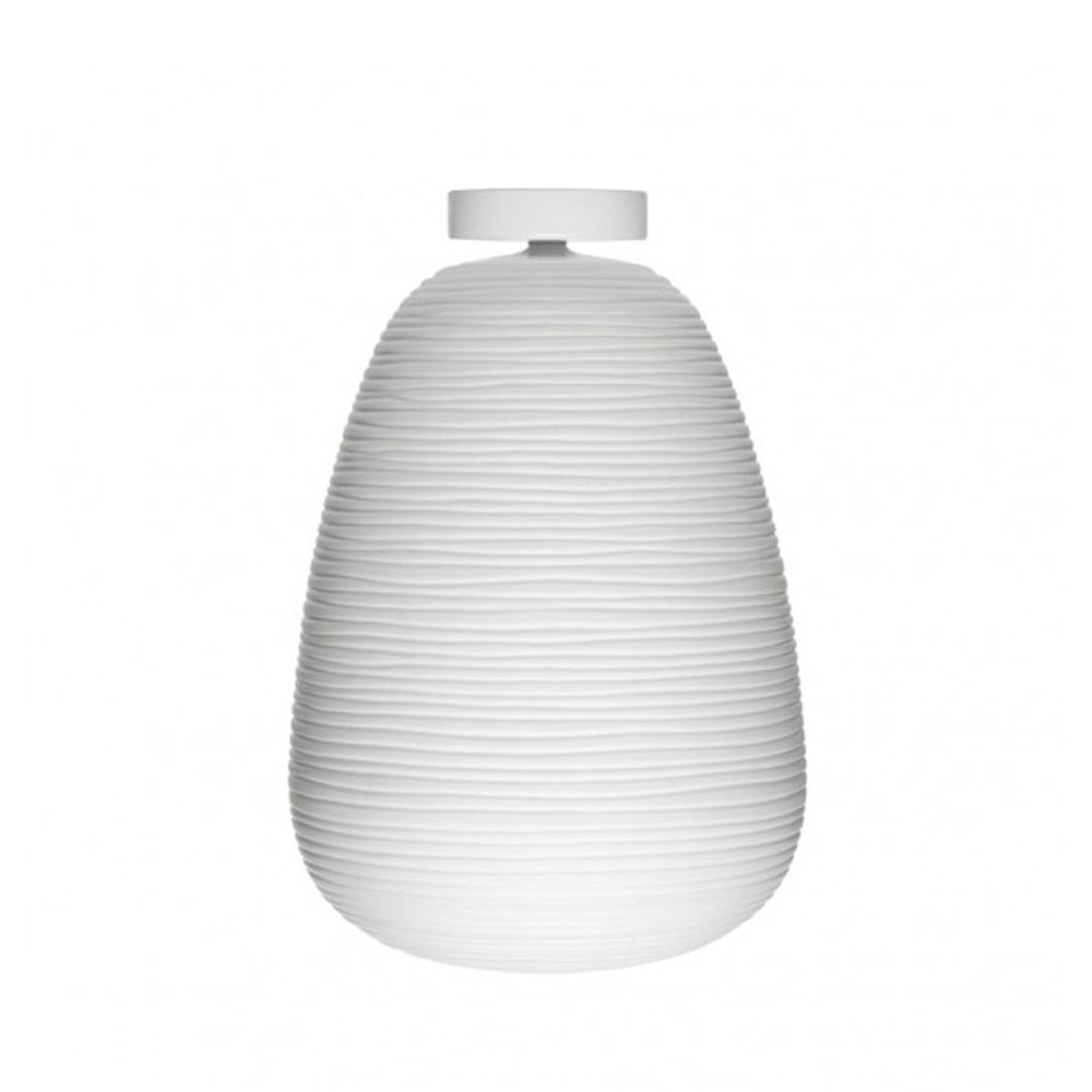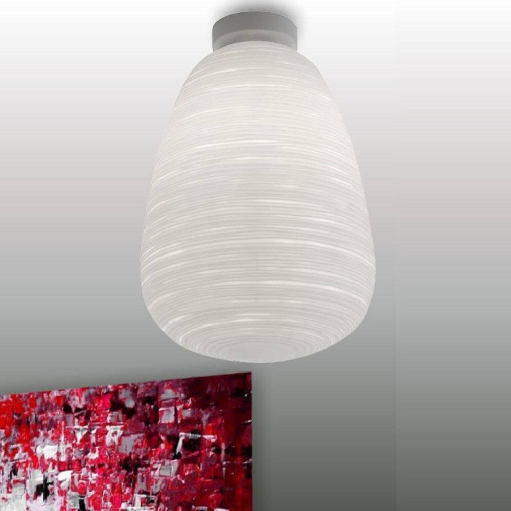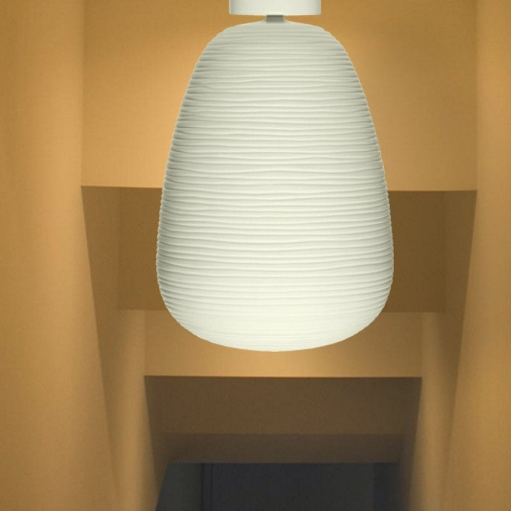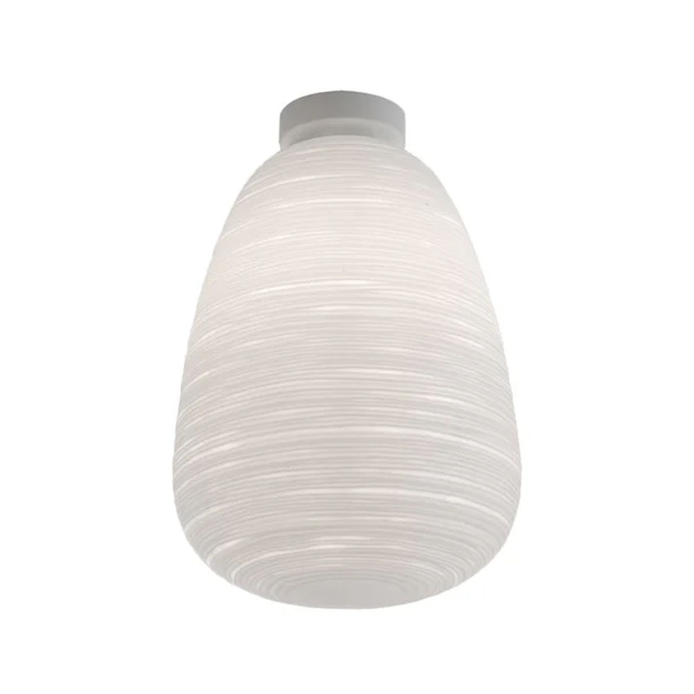 燈體採用吹製玻璃製成,並運用稱為「a fermo」的工藝技術在製作過程中玻璃不於模具中旋轉,使表面紋理得以完整保留。搭配具有陰刻紋路的模具,形成規律的橫向線條,再經手工修整與酸蝕處理,最終呈現出帶有粉霧感、近似石膏質地的霧面效果,使整體外觀如紙般柔和卻保有玻璃的厚實質感。