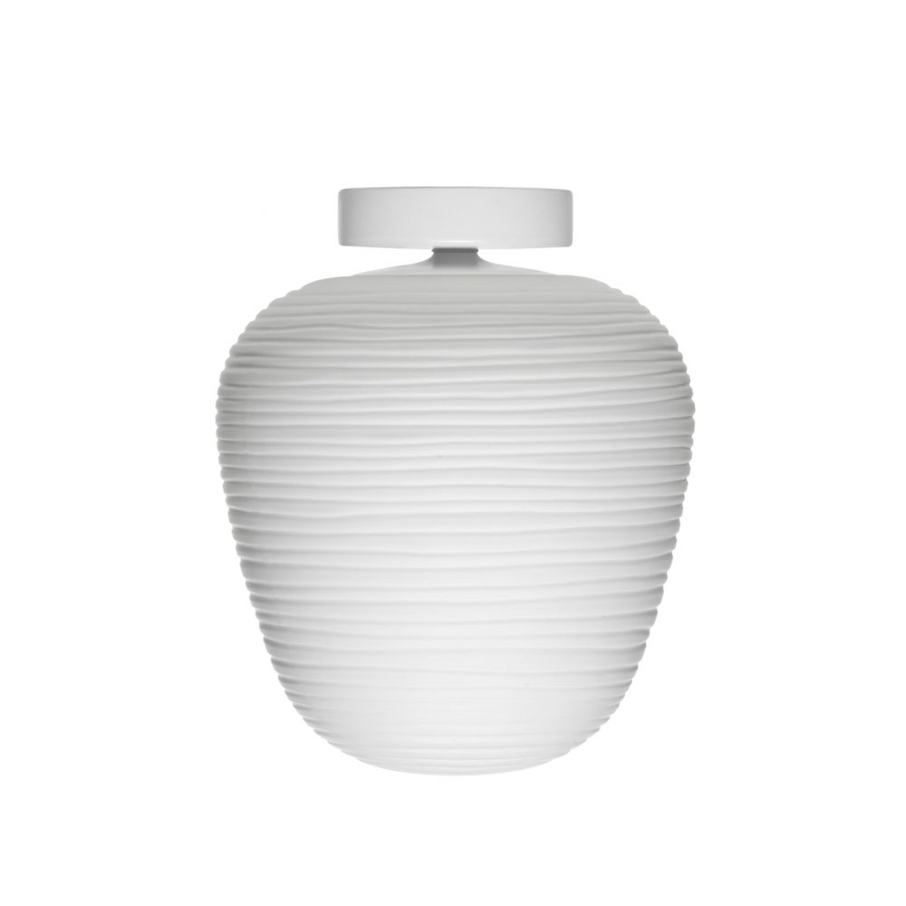燈體採用吹製玻璃製成,並運用稱為「a fermo」的工藝技術在製作過程中玻璃不於模具中旋轉,使表面紋理得以完整保留。搭配具有陰刻紋路的模具,形成規律的橫向線條,再經手工修整與酸蝕處理,最終呈現出帶有粉霧感、近似石膏質地的霧面效果,使整體外觀如紙般柔和卻保有玻璃的厚實質感。