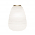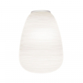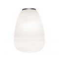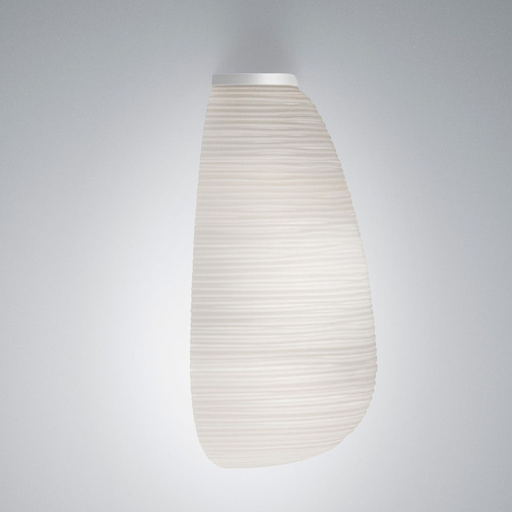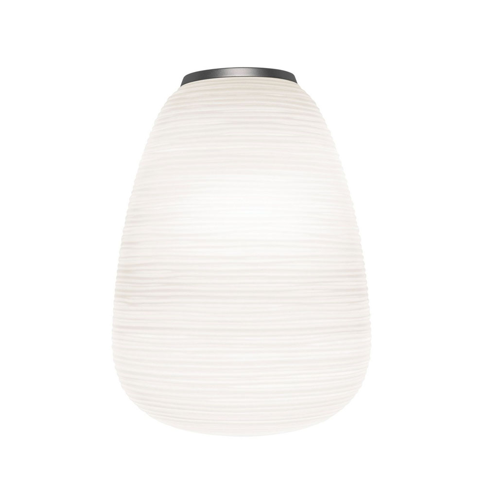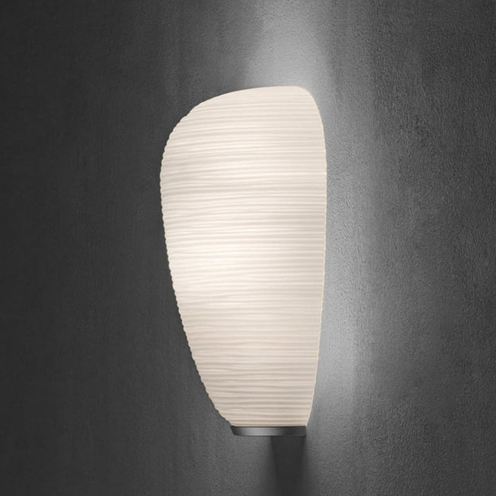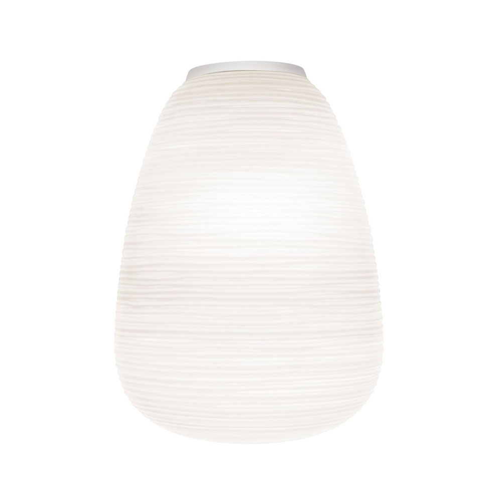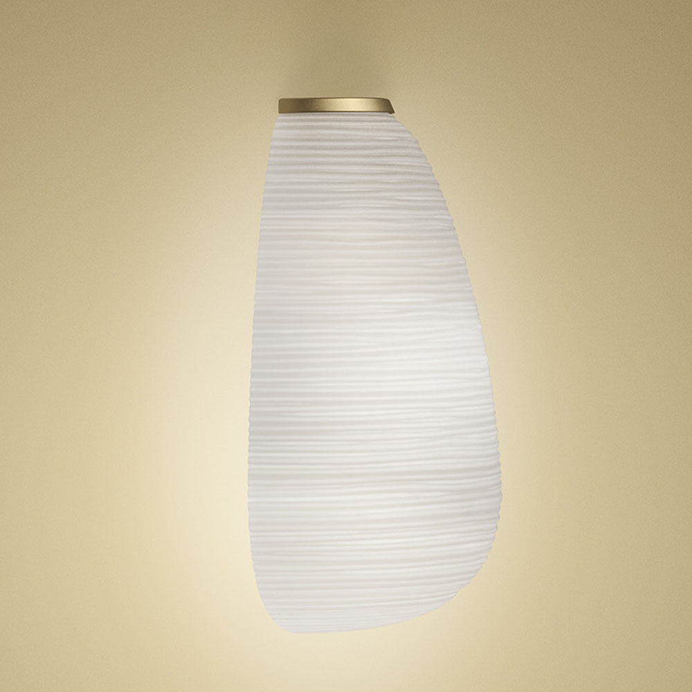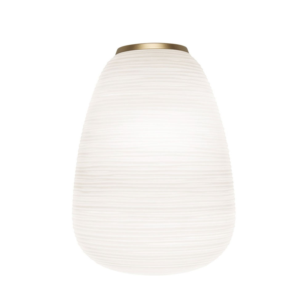燈體採用吹製玻璃製成,並運用稱為「a fermo」的工藝技術在製作過程中玻璃不於模具中旋轉,使表面紋理得以完整保留。搭配具有陰刻紋路的模具,形成規律的橫向線條,再經手工修整與酸蝕處理,最終呈現出帶有粉霧感、近似石膏質地的霧面效果,使整體外觀如紙般柔和卻保有玻璃的厚實質感。