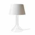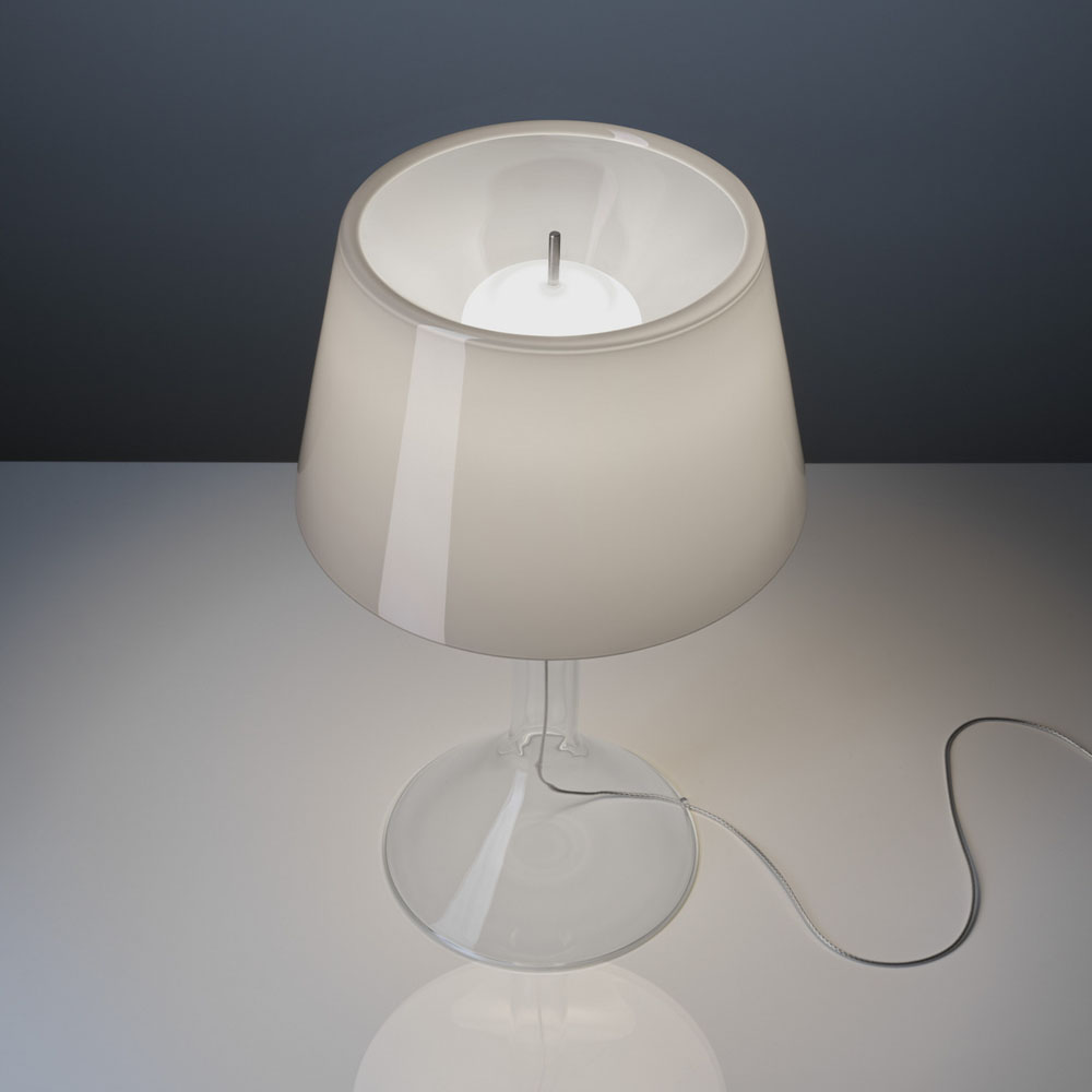 Chapeaux 桌燈由義大利設計大師 Rodolfo Dordoni 與 FOSCARINI 聯合打造,以高度簡化的結構語彙呈現優雅且富詩意的現代照明設計。整體由三個核心元素構成:幾乎隱形的硼矽玻璃(borosilicate glass)透明支撐、內嵌光源的發光核心,以及上方如帽簷般的燈罩,彼此層疊而成,營造出輕盈且平衡的視覺效果。當燈具關閉時,透明玻璃幾乎隱沒於空間之中;點亮後,光線自內部緩緩擴散,使結構重新浮現,展現低調而細膩的存在感。