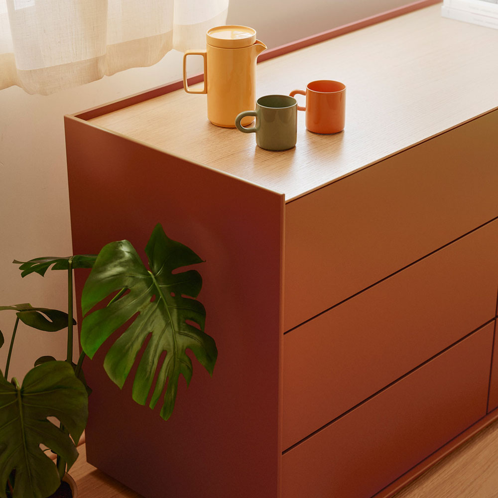 Bera 最具特色之處在於高度靈活的客製化選擇,上板與抽屜面板可選擇與主體不同的顏色或木紋材質,創造豐富的對比與層次,使每件家具都能依照個人喜好與空間風格自由搭配,呈現獨一無二的設計表情。