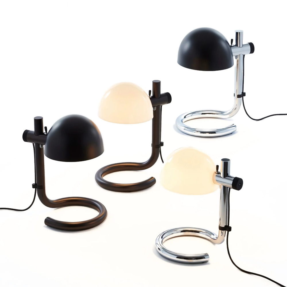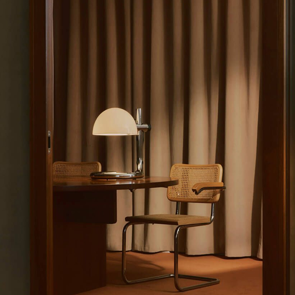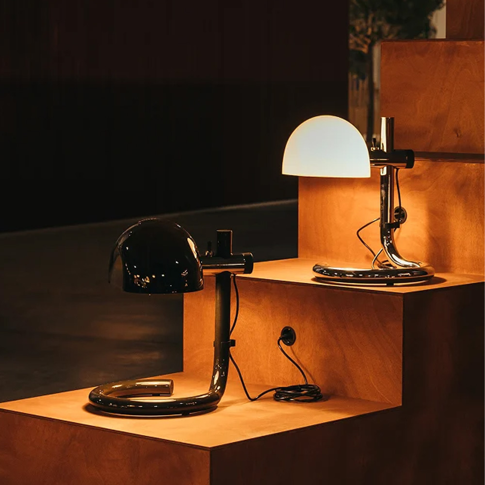 鋼製底座與支架,以俐落而克制的線條構築出穩定的視覺重心。彎折鋼材這一源自工業時代的技術語言,在此被昇華為純粹而洗鍊的設計表現,既保留歷史痕跡,亦展現現代工藝的精準度。燈罩選用甲基丙烯酸酯材質,提供兩種光影乳白半透明,營造柔和而均勻的漫射光;雙層黑色,則呈現更具方向性的照明層次。燈罩可隨使用需求旋轉並調整高度,使光線在空間中自由流動,回應不同情境的氛圍轉換,保留傳統燈泡的溫潤質感。Lauro 提供桌燈、立燈與壁燈三種形式,延續一致的比例語言與雕塑感輪廓,使其無論單獨陳設或系列搭配,皆能形成和諧且富有張力的空間節奏。這不僅是一件照明作品,更是一種對時間、工藝與設計本質的凝視在過去與現在之間,低調而堅定地發聲。