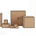 Frame 系列的發想追溯至 1943 年 Morgens Lassen 的設計手稿中,筆直俐落的線條構成看似穿透的立體結構,大小各異組成不同實用功能,可落地擺置、可壁掛、也可相互堆疊。