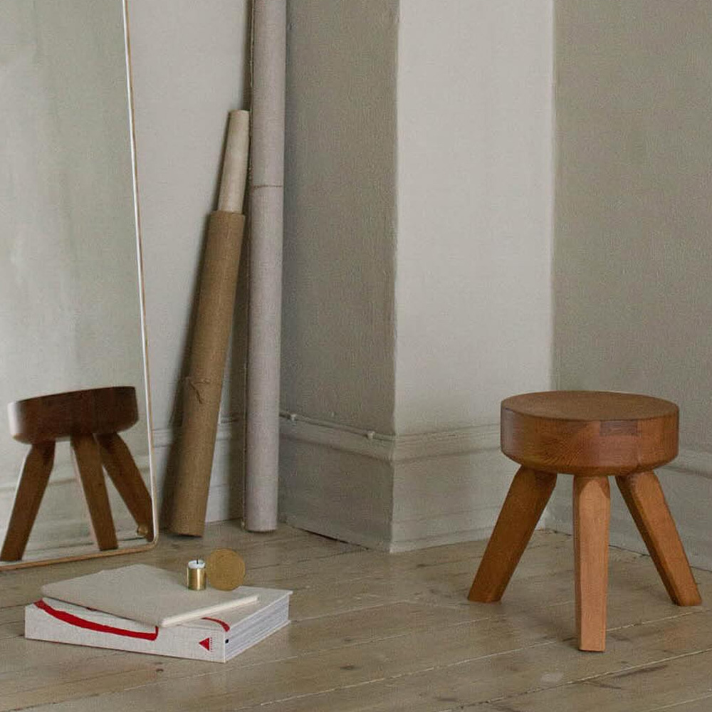 AML Stool 採用實心松木製作,由厚實的座面與三支穩固的支腳構成,比例設定強調結構感與使用穩定性。松木自然明顯的紋理,與略顯厚重的體量造型相互呼應,營造出帶有復古氣息的視覺風格,同時保留材質原有的溫潤質感。