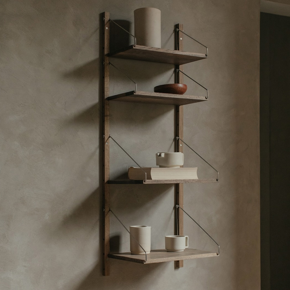 軌道式層架最早於 1930 年代在斯堪地那維亞由櫥櫃工匠發展而來,隨後被多位建築師與設計師重新詮釋,並成為中世紀現代主義的重要組成元素。Kim Richardt 為 FRAMA 所設計的 Shelf Library 系統,延續這一歷史脈絡,同時透過比例、細節與材質語言,建立屬於當代的設計表情。
